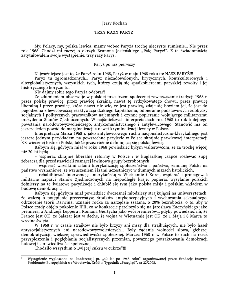 Jerzy Kochan TRZY RAZY PARYŻ1 My, Polacy, my, polska lewica, mamy wobec Paryża trochę nieczyste sumienie... Nie przez rok 1968. Chodzi mi raczej o okrzyk Brunona Jasieńskiego „Palę Paryż!”. Z tą świadomością zatytułowałem swoje wystąpienie: trzy razy Paryż. Paryż po raz pierwszy Najważniejsze jest to, że Paryż roku 1968, Paryż w maju 1968 roku to: NASZ PARYŻ!!! Paryż tu zgromadzonych... Paryż niezadowolonych, krytycznych, kontrkulturowych i alterglobalistycznych, wszystkich tych, którzy czują się spadkobiercami paryskiej rewolty i jej historycznego horyzontu. Nie dajmy sobie tego Paryża odebrać! Ze zdumieniem obserwuję w polskiej przestrzeni społecznej zawłaszczanie tradycji 1968 r. przez polską prawicę, przez prawicę skrajną, nawet tę rydzykowatego chowu, przez prawicę liberalną i przez prawicę, która nawet nie wie, że jest prawicą, zdaje się bowiem jej, że jest do pogodzenia z lewicowością reaktywacja dzikiego kapitalizmu, odbieranie podstawowych zdobyczy socjalnych i politycznych pracowników najemnych i czynne popieranie wojującego militaryzmu prezydenta Stanów Zjednoczonych. W najśmielszych interpretacjach rok 1968 to rok kolejnego powstania narodowowyzwoleńczego, antykomunistycznego i antylewicowego. Stanowić ma on jeszcze jeden powód do marginalizacji a nawet kryminalizacji lewicy w Polsce. Interpretacja Marca 1968 r. jako antylewicowego ruchu nacjonalistyczno-klerykalnego jest jeszcze jednym przykładem na powszechne przyjęcie w Polsce skrajnie prawicowej interpretacji XX-wiecznej historii Polski, także przez różnie definiującą się polską lewicę. Bałbym się, gdybym miał w roku 1968 powiedzieć byłym walterowcom, że za trochę więcej niż 20 lat będą – wspierać skrajnie liberalne reformy w Polsce i w kuglarskiej czapce rozlewać zupę żebraczą dla przedstawicieli rosnącej lawinowo grupy bezrobotnych, – wspierać wszelkimi siłami klerykalizację społeczeństwa i państwa, zamianę Polski na państwo wyznaniowe, ze wzruszeniem i łzami uczestniczyć w tłumnych mszach katolickich, – rehabilitować interwencję amerykańską w Wietnamie i Korei, wspierać i propagować militarne napaści Stanów Zjednoczonych na niepodległe kraje, popierać wysyłanie polskich żołnierzy na te światowe pacyfikacje i chlubić się tym jako polską misją i polskim wkładem w budowę demokracji... Bałbym się, gdybym miał powiedzieć ówczesnej młodzieży strajkującej na uniwersytetach, że walczą o potępienie prezerwatyw, środków antykoncepcyjnych i wychowania seksualnego, odrzucenie teorii Darwina, uznanie rocka za narzędzie szatana, o 20% bezrobocia, o to, aby w Polsce rządy objęło pokolenie JPII, co w konkrecie przełożyło się na Jarosława Kaczyńskiego jako premiera, a Andrzeja Leppera i Romana Giertycha jako wicepremierów... gdyby powiedzieć im, że Franco jest OK, że Salazar jest w dechę, że wojna w Wietnamie jest OK, że 1 Maja i 8 Marca to wredne święta... W 1968 r. w czasie strajków nie było krzyży ani mszy dla strajkujących, nie było haseł antysocjalistycznych ani narodowowyzwoleńczych... Były żądania wolności słowa, głębszej demokratyzacji, większej sprawiedliwości społecznej. Marzec 1968 r. w Polsce to ruch na rzecz przyśpieszenia i pogłębiania socjalistycznych przemian, poważnego potraktowania demokracji ludowej i sprawiedliwości społecznej. Chodziło wszystkim o „więcej cukru w cukrze”!!! 1 Wystąpienie wygłoszone na konferencji pt. „40 lat po 1968 roku” organizowanej przez fundację Instytut Problemów Europejskich we Wrocławiu. Źródło: Tygodnik „Przegląd”, nr 22/2008. 1 Jerzy Kochan – Trzy razy Paryż Chodziło o zasadniczą zmianę pewnej estetyki władzy, ostateczne odrzucenie wielorakiego konserwatyzmu na rzecz nowoczesnego społeczeństwa, konserwatyzmu transgranicznego, nieczułego na podział świata „żelazną kurtyną”, konserwatyzmu, który pod różnymi rządami na całym świecie istniał i musiał być zanegowany. Paradoksalnie cudowna reinkarnacja owego prawicowego konserwatyzmu w Polsce dokonała się także za sprawą bohaterów polskiego ‘68. To część z nich, powiedzmy sobie otwarcie, stała się heroldami turboliberalizmu i amerykańskiego kapitału, zagrała rolę odźwiernych dla polskiej prawicy, legitymizowała nacjonalistyczną prawicę w oczach lewicy Zachodu. Można powiedzieć, że to oni zdradzili Marzec, zdradzili rok 68 i siebie, zmienili się. Był Kant przedkrytyczny i krytyczny, wczesny i późny Wittgenstein, Józef Piłsudski „Ziuk” „wysiadł na przystanku niepodległość”. Bywa. Na bohaterów ‘68 kreowani są ci, co „wyrośli” z młodzieńczych ideałów, ci, co nie chcą już „być realistami i żądać niemożliwego”. Nie są nimi w odbiorze publicznym ani Ludwik Hass, ani Adam Schaff, ani Kazimierz Dejmek... Nie jest nikt, kto zachował lewicowe poglądy. PRAWICA kradnie polską historię, polski patriotyzm... kradnie także polski Marzec... Ośmiesza paryski Maj i kpi z niego. Za pomocą IPN kryminalizuje się za państwowe pieniądze polską lewicę i polską tradycję lewicową jako antypolską i przestępczą, wręcz ludobójczą. Mamy za to w main streamie jako czołowych reprezentantów prezydenta RP miłośników gen. Pinocheta. W prowadzonej polityce historycznej nie ma miejsca dla Ignacego Daszyńskiego, nie uznaje się i nie czci tradycji 1905 r., cała historia powojenna lewicy polskiej w kraju została przeklęta. Trzeba powiedzieć przy tym wyraźnie: w olbrzymim stopniu za zgodą samej lewicy... tej realnej, grającej i wygrywającej w wyborach, formującej „lewicowe” rządy, mianującej „lewicowych” ambasadorów i wysyłającej wojsko do Iraku. Ale i tej skupionej w „prawdziwej lewicy”, prawdziwej na lewo od SLD, także tej skupionej wokół „Krytyki Politycznej”. Akceptuje ona w olbrzymiej części skrajnie prawicowe odczytanie historii i 