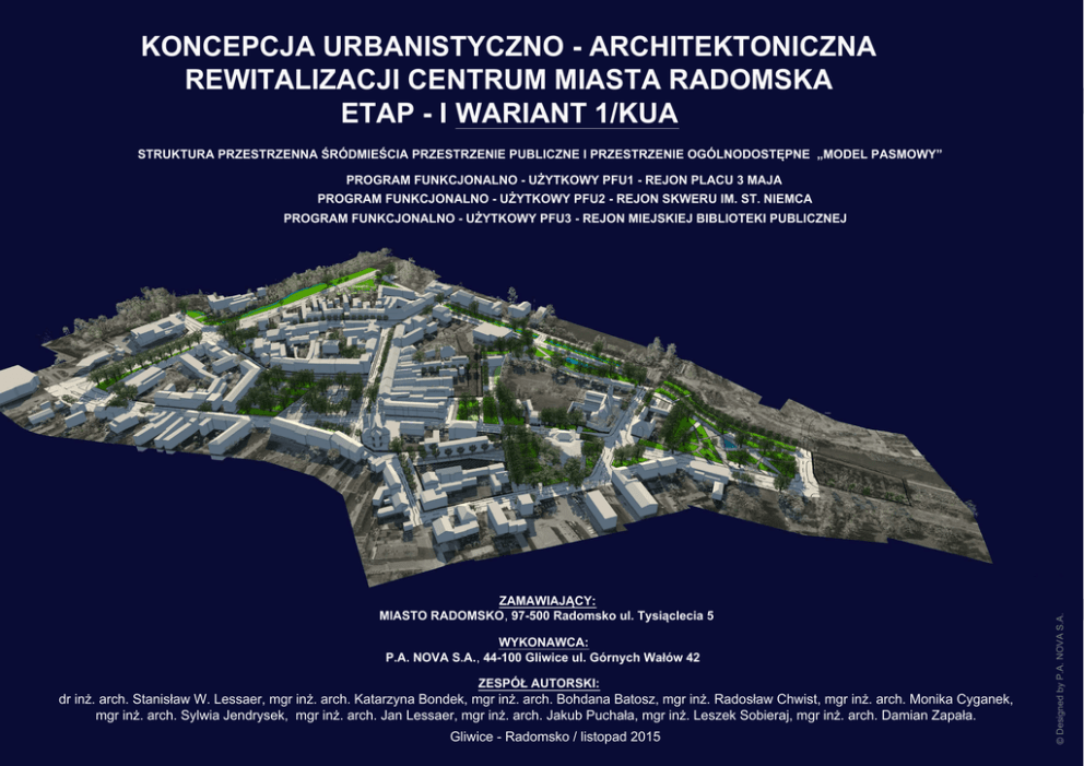 MIASTO RADOMSKO, WYKONAWCA: P.A. NOVA S.A., Gliwice - Radomsko / listopad 2015 Designed by P.A. NOVA S.A. KONCEPCJA URBANISTYCZNO - ARCHITEKTONICZNA REWITALIZACJI CENTRUM MIASTA RADOMSKA ETAP - I WARIANT 1/KUA „Koncepcja urbanistyczno - architektoniczna Rewitalizacji Centrum Miasta Radomska ” - Etap I - Wariant 1/KUA -------------------------------------------------------------------------------------------------------------------------------------------------------------------------------------------------------------------------------------------------------------------------------------------------------------------------- KONCEPCJA URBANISTYCZNO - ARCHITEKTONICZNA REWITALIZACJI CENTRUM MIASTA RADOMSKA ETAP - I WARIANT 1/KUA STRUKTURA PRZESTRZENNA ŚRÓDMIEŚCIA, PRZESTRZENIE PUBLICZNE I PRZESTRZENIE OGÓLNODOSTĘPNE - „MODEL PASMOWY” PROGRAM FUNKCJONALNO UŻYTKOWY PFU1 - REJON PLACU 3 MAJA PROGRAM FUNKCJONALNO UŻYTKOWY PFU2 - REJON SKWERU NIEMCA PROGRAM FUNKCJONALNO UŻYTKOWY PFU3 - REJON MIEJSKIEJ BIBLIOTEKI PUBLICZNEJ ZAMAWIAJĄCY MIASTO RADOMSKO, 97-500 RADOMSKO, UL. TYSIĄCLECIA 5 WYKONAWCA WYKONAWCA: P.A.NOVA S.A., 44-100 GLIWICE, UL. GÓRNYCH WAŁÓW 42 ZESPÓŁ AUTORSKI dr inż. arch. Stanisław Lessaer, mgr inż. arch. Katarzyna Bondek, mgr inż. arch. Bohdana Batosz, mgr inż. arch. Sylwia Jendrysek, mgr inż. arch. Jakub Puchała, mgr inż. arch. Jan Lessaer, inż. Leszek Sobieraj, mgr inż. arch. Damian Zapała, mgr inż. Radosław Chwist, mgr inż. arch. Monika Cyganek -------------------------------------------------------------------------------------------------------------------------------------------------------------------------------------------------------------------------------------------------------------------------------------------------------------------------Gliwice - Radomsko / listopad 2015 1 „Koncepcja urbanistyczno - architektoniczna Rewitalizacji Centrum Miasta Radomska ” - Etap I - Wariant 1/KUA -------------------------------------------------------------------------------------------------------------------------------------------------------------------------------------------------------------------------------------------------------------------------------------------------------------------------- Wariant 1/KUA „ Koncepcja urbanistyczno - architektoniczna Rewitalizacji Centrum Miasta Radomska, Etap - I ” 1/ WPROWADZENIE Koncepcja urbanistyczno - architektoniczna (KUA) Rewitalizacji Centrum Miasta Radomska została opracowana dla obszaru o powierzchni 25,50 ha, w granicach bezpośrednich, uwzględniając ponadto 50,00 metrowe otoczenie (łącznie 39,60 ha). Zadaniem i celem koncepcji jest ukształtowanie spójnej pod względem przestrzennym i programowym wizji rozwoju, a właściwie stopniowego przekształcania się centralnej historycznej części miasta Radomska. Koncepcję opracowano z wykorzystaniem następujących, udostępnionych przez Urząd Miasta Radomska i strony trzecie materiałów wejściowych: - mapa cyfrowa w skali 1: 500, zaktualizowana dla celów projektowych, - wyrys z ewidencji gruntów, - ortofotomapa z Centralnego Ośrodka Dokumentacji Geodezyjnej i Kartograficznej w Warszawie, - chmura punktów z Centralnego Ośrodka Dokumentacji Geodezyjnej i Kartograficznej w Warszawie, - Inwentaryzacja Zieleni - opracowanie dendrologiczne wykonane w październiku 2015, przez S.C.COLLAGE z Gliwic, - Studium uwarunkowań i kierunków zagospodarowania przestrzennego miasta Radomsko, zatwierdzone uchwałą Rady Miejskiej w Radomsku Nr LXIII/476/10 z dnia 30 września 2010 r., - projekt koncepcyjny zagospodarowania Al. Jana Pawła II, - projekt budowlany ronda przy ul. Brzeźnickiej / Piłsudskiego, - założenia do projektu „Eliminacji zagrożeń środowiskowych i poprawy wizerunku rzeki Radomki”, - fragment miejscowego planu zagospodarowania przestrzennego dla centrum miasta Radomska (dotyczy głównie projektowanej drogi dojazdowej w rejonie Alei Jana Pawła II wraz z uwzględnieniem miejsc postojowych do obsługi obiektu Muzeum Regionalnego w Radomsku i Urzędu Stanu Cywilnego), - miejscowy plan zagospodarowania przestrzennego Brzeźnicka / PKP, zatwierdzony uchwałą Rady Miejskiej w Radomsku Nr XXXVIII/338/13 z dnia 20 maja 2013 r. w sprawie miejscowego planu zagospodarowania przestrzennego fragmentu terenu miasta Radomska w rejonie ulic: Warszyca Brzeźnicka - Piłsudskiego, przedłużenie Targowej, do terenów PKP (Dziennik Urzędowy Województwa Łódzkiego z dnia 11 marca 2014 r., poz. 1199), - miejscowy plan zagospodarowania przestrzennego Metalurgia, zatwierdzony uchwałą Rady Miejskiej w Radomsku Nr XXXIII/167/12 z dnia 21 marca 2012 r. w sprawie miejscowego planu -------------------------------------------------------------------------------------------------------------------------------------------------------------------------------------------------------------------------------------------------------------------------------------------------------------------------Gliwice - Radomsko / listopad 2015 2 „Koncepcja urbanistyczno - architektoniczna Rewitalizacji Centrum Miasta Radomska ” - Etap I - Wariant 1/KUA -------------------------------------------------------------------------------------------------------------------------------------------------------------------------------------------------------------------------------------------------------------------------------------------------------------------------- zagospodarowania przestrzennego fragmentu miasta Radomska w rejonie ulic Reymonta i Kościuszki (Dziennik Urzędowy Województwa Łódzkiego z dnia 7 maja 2012 r., poz. 1389), Pasmo wschodnie tworzą: skwer u zbiegu ul. Mickiewicza i ul. Joselewicza, ul. Przedborska, wschodnia część Placu 3 Maja (w sąsiedztwie kościoła pw. Św. Lamberta). - Program Opieki nad Zabytkami, przyjęty uchwałą Rady Miejskiej w Radomsku Nr IX/51/15 z dnia 23 marca 2015 r. (Dziennik Urzędowy Wojew