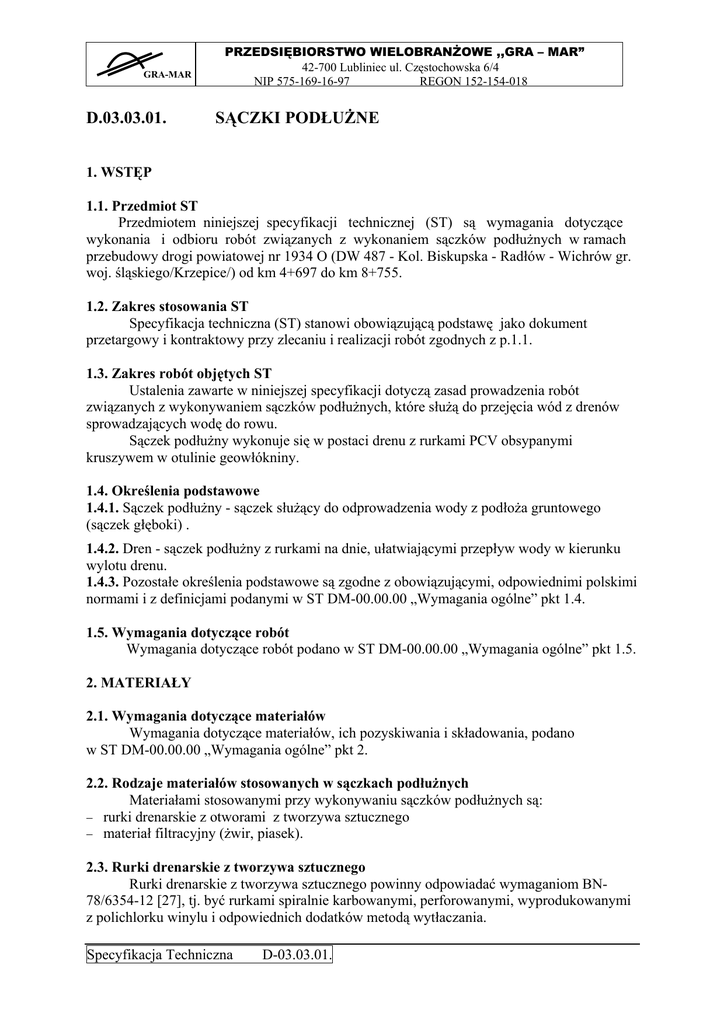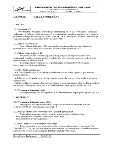 GRA-MAR D.03.03.01. PRZEDSIĘBIORSTWO WIELOBRANŻOWE ,,GRA – MAR” 42-700 Lubliniec ul. Częstochowska 6/4 NIP 575-169-16-97 REGON 152-154-018 SĄCZKI PODŁUŻNE 1. WSTĘP 1.1. Przedmiot ST Przedmiotem niniejszej specyfikacji technicznej (ST) są wymagania dotyczące wykonania i odbioru robót związanych z wykonaniem sączków podłużnych w ramach przebudowy drogi powiatowej nr 1934 O (DW 487 - Kol. Biskupska - Radłów - Wichrów gr. woj. śląskiego/Krzepice/) od km 4+697 do km 8+755. 1.2. Zakres stosowania ST Specyfikacja techniczna (ST) stanowi obowiązującą podstawę jako dokument przetargowy i kontraktowy przy zlecaniu i realizacji robót zgodnych z p.1.1. 1.3. Zakres robót objętych ST Ustalenia zawarte w niniejszej specyfikacji dotyczą zasad prowadzenia robót związanych z wykonywaniem sączków podłużnych, które służą do przejęcia wód z drenów sprowadzających wodę do rowu. Sączek podłużny wykonuje się w postaci drenu z rurkami PCV obsypanymi kruszywem w otulinie geowłókniny. 1.4. Określenia podstawowe 1.4.1. Sączek podłużny - sączek służący do odprowadzenia wody z podłoża gruntowego (sączek głęboki) . 1.4.2. Dren - sączek podłużny z rurkami na dnie, ułatwiającymi przepływ wody w kierunku wylotu drenu. 1.4.3. Pozostałe określenia podstawowe są zgodne z obowiązującymi, odpowiednimi polskimi normami i z definicjami podanymi w ST DM-00.00.00 „Wymagania ogólne” pkt 1.4. 1.5. Wymagania dotyczące robót Wymagania dotyczące robót podano w ST DM-00.00.00 „Wymagania ogólne” pkt 1.5. 2. MATERIAŁY 2.1. Wymagania dotyczące materiałów Wymagania dotyczące materiałów, ich pozyskiwania i składowania, podano w ST DM-00.00.00 „Wymagania ogólne” pkt 2. 2.2. Rodzaje materiałów stosowanych w sączkach podłużnych Materiałami stosowanymi przy wykonywaniu sączków podłużnych są: − rurki drenarskie z otworami z tworzywa sztucznego − materiał filtracyjny (żwir, piasek). 2.3. Rurki drenarskie z tworzywa sztucznego Rurki drenarskie z tworzywa sztucznego powinny odpowiadać wymaganiom BN78/6354-12 [27], tj. być rurkami spiralnie karbowanymi, perforowanymi, wyprodukowanymi z polichlorku winylu i odpowiednich dodatków metodą wytłaczania. Specyfikacja Techniczna D-03.03.01. GRA-MAR PRZEDSIĘBIORSTWO WIELOBRANŻOWE ,,GRA – MAR” 42-700 Lubliniec ul. Częstochowska 6/4 NIP 575-169-16-97 REGON 152-154-018 Rurki drenarskie powinny mieć powierzchnię bez pęcherzy, powinny być obcięte prostopadle do osi, w sposób umożliwiający dokładne ich łączenie. Szczeliny wlotowe (szparki podłużne) powinny znajdować się między karbami rurki, powinny być wolne od grudek i resztek materiału i powinny być tak wykonane, aby przepływająca przez nie woda nie napotykała oporów. Szczeliny powinny być równomiernie rozmieszczone na długości i obwodzie rurki. Wymagania dla rurek drenarskich z polichlorku winylu podano w tablicy 2. Rurki drenarskie należy przechowywać na utwardzonym placu, w nie nasłonecznionych miejscach. Zwoje rurek drenarskich należy układać płasko w stosy do wysokości 4 zwojów w temp. do 25oC, a powyżej 25oC do wysokości 2 zwojów. Rurki drenarskie zwykłe (typu Z, barwy naturalnego PVC) należy chronić przed działaniem sił mechanicznych w temperaturze poniżej 0oC. Tablica 1. Wymagania dla rurek drenarskich karbowanych z nieplastyfikowanego polichlorku winylu Lp. Właściwości i cechy Średnica zewnętrzna nominalna, mm 125 1 2 3 4 5 6 7 8 9 Średnica zewnętrzna, mm Dopuszczalna odchyłka średnicy zewnętrznej, mm Średnica wewnętrzna, mm Dopuszczalna odchyłka średnicy wewnętrznej, mm Długość rurki, m 126,5 -2,0 115,0 +2,5 50 Szerokość szczelin wlotowych, od 1,7 do 2 mm Ogólna powierzchnia szczelin wlotowych na dług. 1 m, cm2, co najmniej - dla szerokości od 0,6 do 1,0 mm - dla szerokości od 1,1 do 1,5 46 mm - dla szerokości od 1,7 do 2,0 mm Liczba szczelin węższych na 1 20 m rurki, % Odporność na uderzenie, wg dopuszcza się uszkodzenie najwyżej 1 BN-78/6354-12 [27] próbki 10 Odporność na zginanie, wg BN-78/6354-12 [27] 11 Wytrzymałość na zerwanie, wg BN-78/6354-12 [27] 12 Zmiana wymiarów średnicy, wg BN-78/6354-12 [27], %, Specyfikacja Techniczna próbka nie powinna załamywać się i wykazywać pęknięć próbka nie powinna ulec zerwaniu D-03.03.01. 12 GRA-MAR PRZEDSIĘBIORSTWO WIELOBRANŻOWE ,,GRA – MAR” 42-700 Lubliniec ul. Częstochowska 6/4 NIP 575-169-16-97 REGON 152-154-018 nie więcej niż Złączki, służące do połączenia rurek drenarskich karbowanych (przez ich skręcenie) powinny być wykonane z polietylenu wysokociśnieniowego. Złączki należy przechowywać w workach, pudłach kartonowych i innych pojemnikach. Przy składowaniu na odkrytych placach należy chronić przed oddziaływaniem promieni słonecznych. W magazynach zamkniętych temperatura otoczenia nie może przekraczać 40oC, a odległość składowania powinna być większa niż 1 m od czynnych urządzeń grzejnych. W przypadku składowania w workach zaleca się układać je w warstwach nie przekraczających wysokości 5 worków. 2.4. Materiał filtracyjny i podsypka w sączku podłużnym Jako materiały filtracyjne należy stosować: − żwir naturalny, sortowany o wymiarach ziarn większych niż otwory w rurociągu drenarskim, którymi mógłby się do nich dostać. Do otworów tych należą szczeliny stykowe między rurkami oraz dziurki i szparki podłużne w rurkach dziurkowanych, − piasek gruby o wielkości ziarn do 2 mm, w którym zawartość ziarn o średnicy większej niż 0,5 mm wynosi więcej niż 50 %, wg PN-B-02480 [3], − piasek średni o wielkości ziarn do 2 mm, w którym zawartość ziarn o średnicy większej niż 0,5 mm wynosi nie więcej niż 50 %, lecz zawartość ziarn o średnicy większej niż 0,25 mm wynosi więcej niż 50 %, wg PN-B-02480 [3]. Wskaźnik wodoprzepuszczalności piasków powinien wynosić co najmniej 8 m/dobę, przy oznaczaniu 