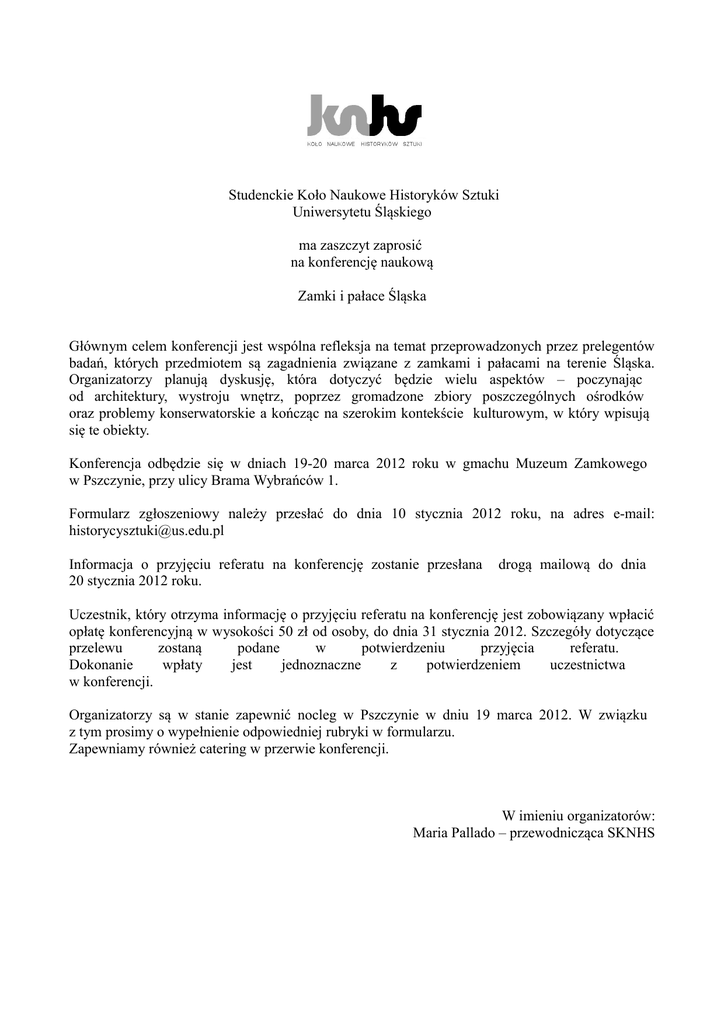 Studenckie Koło Naukowe Historyków Sztuki Uniwersytetu Śląskiego ma zaszczyt zaprosić na konferencję naukową Zamki i pałace Śląska Głównym celem konferencji jest wspólna refleksja na temat przeprowadzonych przez prelegentów badań, których przedmiotem są zagadnienia związane z zamkami i pałacami na terenie Śląska. Organizatorzy planują dyskusję, która dotyczyć będzie wielu aspektów – poczynając od architektury, wystroju wnętrz, poprzez gromadzone zbiory poszczególnych ośrodków oraz problemy konserwatorskie a kończąc na szerokim kontekście kulturowym, w który wpisują się te obiekty. Konferencja odbędzie się w dniach 19-20 marca 2012 roku w gmachu Muzeum Zamkowego w Pszczynie, przy ulicy Brama Wybrańców 1. Formularz zgłoszeniowy należy przesłać do dnia 10 stycznia 2012 roku, na adres e-mail: [email protected] Informacja o przyjęciu referatu na konferencję zostanie przesłana 20 stycznia 2012 roku. drogą mailową do dnia Uczestnik, który otrzyma informację o przyjęciu referatu na konferencję jest zobowiązany wpłacić opłatę konferencyjną w wysokości 50 zł od osoby, do dnia 31 stycznia 2012. Szczegóły dotyczące przelewu zostaną podane w potwierdzeniu przyjęcia referatu. Dokonanie wpłaty jest jednoznaczne z potwierdzeniem uczestnictwa w konferencji. Organizatorzy są w stanie zapewnić nocleg w Pszczynie w dniu 19 marca 2012. W związku z tym prosimy o wypełnienie odpowiedniej rubryki w formularzu. Zapewniamy również catering w przerwie konferencji. W imieniu organizatorów: Maria Pallado – przewodnicząca SKNHS