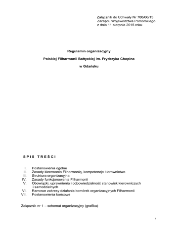 Załącznik do Uchwały Nr 788/66/15 Zarządu Województwa Pomorskiego z dnia 11 sierpnia 2015 roku Regulamin organizacyjny Polskiej Filharmonii Bałtyckiej im. Fryderyka Chopina w Gdańsku SPIS TREŚCI I. II. III. IV. V. VI. VII. Postanowienia ogólne Zasady kierowania Filharmonią, kompetencje kierownictwa Struktura organizacyjna Zasady funkcjonowania Filharmonii Obowiązki, uprawnienia i odpowiedzialność stanowisk kierowniczych i samodzielnych Ramowe zakresy działania komórek organizacyjnych Filharmonii Postanowienia końcowe Załącznik nr 1 – schemat organizacyjny (grafika) 1 Rozdział 1 Postanowienia ogólne § 1. 1. Regulamin organizacyjny Polskiej Filharmonii Bałtyckiej im. Fryderyka Chopina w Gdańsku określa organizację wewnętrzną tej instytucji. 2. Polska Filharmonia Bałtycka im. Fryderyka Chopina w Gdańsku, zwana dalej Filharmonią, działa na podstawie: 1) ustawy z dnia 25 października 1991 r. o organizowaniu i prowadzeniu działalności kulturalnej (tekst jednolity: Dz. U. z 2012 r., poz. 406 z późn. zmianami) zwanej dalej ustawą; 2) ustawy z dnia 27 sierpnia 2009 r. o finansach publicznych (tekst jednolity: Dz. U. z 2013 r., poz. 885 z późn. zmianami); 3) ustawy z dnia 29 stycznia 2004 r. Prawo zamówień publicznych (tekst jednolity: Dz. U. z 2013 r., poz. 907 z późn. zmianami); 4) ustawy z dnia 21 sierpnia 1997 r. o gospodarce nieruchomościami (tekst jednolity: Dz. U. z 2015 r., poz. 782); 5) ustawy z dnia 23 kwietnia 1964 r. kodeks cywilny (tekst jednolity: Dz. U. z 2014 r., poz. 121 z późn. zmianami); 6) ustawy z dnia 29 września 1994 r., o rachunkowości (tekst jednolity: Dz. U. z 2013 r., poz. 330 z późn. zmianami); 7) statutu nadanego uchwałą Sejmiku Województwa Pomorskiego Nr 355/XVIII/12 z dnia 23 kwietnia 2012 r. w sprawie nadania statutu Polskiej Filharmonii Bałtyckiej im. Fryderyka Chopina w Gdańsku; 8) niniejszego regulaminu organizacyjnego. Rozdział 2 Zasady kierowania Filharmonią, kompetencje kierownictwa § 2. 1. Filharmonią zarządza jednoosobowo i reprezentuje ją na zewnątrz dyrektor naczelny. 2. Dyrektor naczelny zarządza Filharmonią przy udziale zastępcy dyrektora ds. finansowych, zwanego dalej dyrektorem ds. finansowych. 3. Organem doradczym dyrektora naczelnego jest Rada Artystyczna. § 3. W czasie nieobecności dyrektora naczelnego funkcję zarządzającego instytucją pełni dyrektor ds. finansowych, a w przypadku jego nieobecności inny pracownik Filharmonii na podstawie pełnomocnictwa udzielonego przez dyrektora naczelnego. § 4. Dyrektor ds. finansowych uczestniczy w kierowaniu pracą Filharmonii według podziału zadań zgodnie z zawartą umową oraz niniejszym Regulaminem organizacyjnym. Rozdział 3 Struktura organizacyjna Filharmonii § 5. W skład Filharmonii i samodzielne stanowiska: wchodzą następujące komórki organizacyjne 2 1) 2) 1) 2) 3) 4) 5) 6) 1. Dział Artystyczny, w skład którego wchodzą: orkiestra symfoniczna; komórka ds. koordynacji pracy artystycznej; 2. Dział Organizacji; 3. Dział Imprez i Wynajmów; 4. Dział Techniczno-Administracyjny, w skład którego wchodzi Studio Nagrań; 5. Dział Finansowo-Księgowy; 6. Dział Sprzedaży Imprez; 7. Archiwum; 8. Samodzielne stanowiska: radca prawny; specjalista ds. kadr; rzecznik PFB; specjalista ds. promocji; specjalista ds. bhp i ppoż; specjalista ds. umów. § 6. Schemat organizacyjny stanowi załącznik nr 1 do niniejszego Regulaminu organizacyjnego. Rozdział 4 Zasady funkcjonowania Filharmonii § 7. 1. Funkcjonowanie Filharmonii oparte jest na zasadach jednoosobowego kierownictwa pełnionego przez dyrektora naczelnego, służbowego podporządkowania i podziału czynności służbowych 2. Działem kieruje kierownik, odpowiedzialny przed bezpośrednim przełożonym za wykonanie przypisanych zadań. 3. Pracą komórki ds. koordynacji pracy artystycznej może koordynować wyznaczony koordynator. 4. Przy realizacji wspólnych zadań, w szczególności związanych z przygotowaniem i obsługą koncertów oraz imprez realizowanych lub współrealizowanych przez Filharmonię, pracownicy zobowiązani są do współpracy zespołowej w ramach własnej komórki, jak i z innymi komórkami organizacyjnymi. 5. Zastępstwa kierowników działów ustala bezpośredni przełożony kierownika na jego wniosek. § 8. 1. Dyrektor ds. finansowych oraz kierownicy działów są odpowiedzialni za prawidłowe i optymalne zorganizowanie oraz realizację powierzonych im zadań, zgodnie z obowiązującym prawem. 2. Kierownik działu dokonuje podziału zadań pomiędzy pracowników nadzorowanego działu z uwzględnieniem ich kwalifikacji. § 9. 1. Dyrektor naczelny, a w razie jego nieobecności dyrektor ds. finansowych albo upoważniona przez dyrektora naczelnego osoba, podpisuje dokumenty i korespondencję wysyłaną na zewnątrz Filharmonii. 2. Do składania oświadczeń woli w imieniu Filharmonii w zakresie praw i obowiązków majątkowych i finansowych uprawniony jest jednoosobowo dyrektor naczelny lub osoba przez niego upoważniona. Oświadczenia te wymagają kontrasygnaty dyrektora ds. finansowych. 3 3. Zarządzenia i umowy (w tym umowy dotyczące zamówień publicznych), opiniuje pod względem formalno-prawnym radca prawny. 4. Dyrektor ds. finansowych jest upoważniony i zobowiązany do analizowania i podpisywania wszelkiej dokumentacji ekonomiczno-finansowej. Przez złożenie podpisu dyrektor ds. finansowych potwierdza poprawność dokumentu. Rozdział 5 Obowiązki, uprawnienia i odpowiedzialność stanowisk kierowniczych § 10. 1. Obowiązki, uprawnienia i odpowiedzialność dyrektora naczelnego określają obowiązujące przepisy prawa, statut oraz niniejszy Regulamin organizacyjny. 2. Dyrektor naczelny sprawuje bezpośredni nadzór nad: Działem Organizacji, Działem Imprez i Wynajmów, Działem Techniczno-Administracyjnym, Archiwum oraz pracownikami stanowisk samodzielnych. § 11. Do podstawowych zadań dyrektora naczelnego należy kierowanie Filharmo