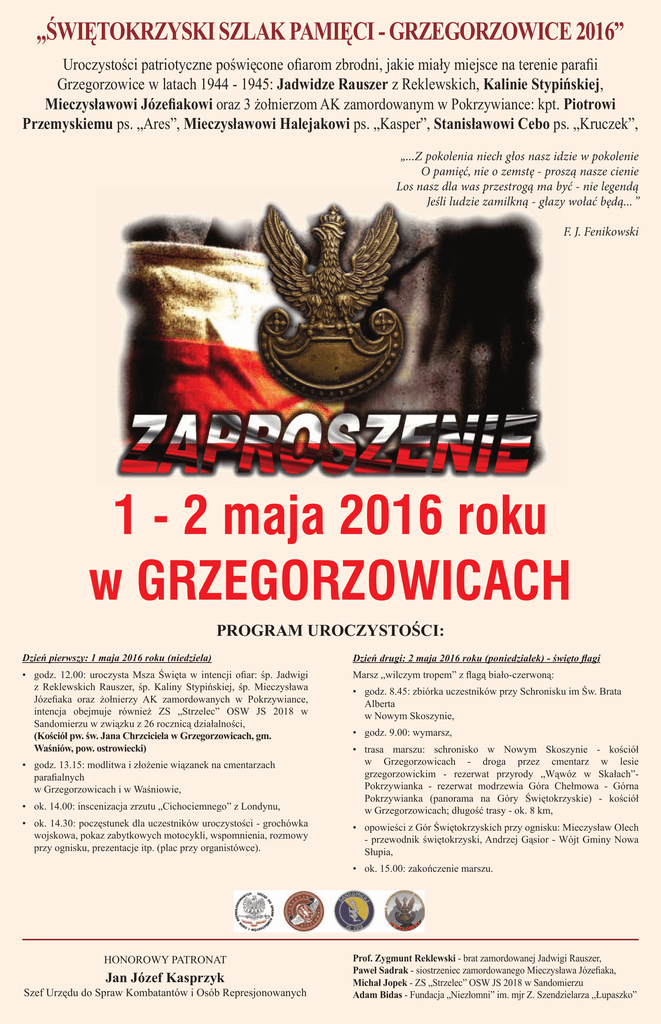 „ŚWIĘTOKRZYSKI SZLAK PAMIĘCI - GRZEGORZOWICE 2016” Uroczystości patriotyczne poświęcone ofiarom zbrodni, jakie miały miejsce na terenie parafii Grzegorzowice w latach 1944 - 1945: Jadwidze Rauszer z Reklewskich, Kalinie Stypińskiej, Mieczysławowi Józefiakowi oraz 3 żołnierzom AK zamordowanym w Pokrzywiance: kpt. Piotrowi Przemyskiemu ps. „Ares”, Mieczysławowi Halejakowi ps. „Kasper”, Stanisławowi Cebo ps. „Kruczek”, „...Z pokolenia niech głos nasz idzie w pokolenie O pamięć, nie o zemstę - proszą nasze cienie Los nasz dla was przestrogą ma być - nie legendą Jeśli ludzie zamilkną - głazy wołać będą... ” F. J. Fenikowski 1 - 2 maja 2016 roku w GRZEGORZOWICACH PROGRAM UROCZYSTOŚCI: Dzień pierwszy: 1 maja 2016 roku (niedziela) Dzień drugi: 2 maja 2016 roku (poniedziałek) - święto flagi • godz. 12.00: uroczysta Msza Święta w intencji ofiar: śp. Jadwigi z Reklewskich Rauszer, śp. Kaliny Stypińskiej, śp. Mieczysława Józefiaka oraz żołnierzy AK zamordowanych w Pokrzywiance, intencja obejmuje również ZS „Strzelec” OSW JS 2018 w Sandomierzu w związku z 26 rocznicą działalności, (Kościół pw. św. Jana Chrzciciela w Grzegorzowicach, gm. Waśniów, pow. ostrowiecki) Marsz „wilczym tropem” z flagą biało-czerwoną: • godz. 13.15: modlitwa i złożenie wiązanek na cmentarzach parafialnych w Grzegorzowicach i w Waśniowie, • ok. 14.00: inscenizacja zrzutu „Cichociemnego” z Londynu, • ok. 14.30: poczęstunek dla uczestników uroczystości - grochówka wojskowa, pokaz zabytkowych motocykli, wspomnienia, rozmowy przy ognisku, prezentacje itp. (plac przy organistówce). • godz. 8.45: zbiórka uczestników przy Schronisku im Św. Brata Alberta w Nowym Skoszynie, • godz. 9.00: wymarsz, • trasa marszu: schronisko w Nowym Skoszynie - kościół w Grzegorzowicach - droga przez cmentarz w lesie grzegorzowickim - rezerwat przyrody „Wąwóz w Skałach”Pokrzywianka - rezerwat modrzewia Góra Chełmowa - Górna Pokrzywianka (panorama na Góry Świętokrzyskie) - kościół w Grzegorzowicach; długość trasy - ok. 8 km, • opowieści z Gór Świętokrzyskich przy ognisku: Mieczysław Olech - przewodnik świętokrzyski, Andrzej Gąsior - Wójt Gminy Nowa Słupia, • ok. 15.00: zakończenie marszu. HONOROWY PATRONAT Jan Józef Kasprzyk Szef Urzędu do Spraw Kombatantów i Osób Represjonowanych Prof. Zygmunt Reklewski - brat zamordowanej Jadwigi Rauszer, Paweł Sadrak - siostrzeniec zamordowanego Mieczysława Józefiaka, Michał Jopek - ZS „Strzelec” OSW JS 2018 w Sandomierzu Adam Bidas - Fundacja „Niezłomni” im. mjr Z. Szendzielarza ,,Łupaszko”