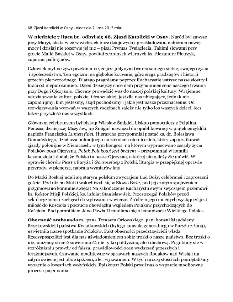 68. Zjazd Katolicki w Osny - niedziela 7 lipca 2013 roku W niedzielę 7 lipca br. odbył się 68. Zjazd Katolicki w Osny. Naród był zawsze przy Maryi, ale ta wieź w wichrach burz dziejowych i prześladowań, nabierała nowej mocy i dzisiaj nie rozerwie jej nic – pisał Prymas Tysiąclecia. Takimi słowami przy grocie Matki Boskiej w Osny, powitał zebranych wiernych ks. Alexandre Pietrzyk, superior pallotynów. Człowiek mylnie żywi przekonanie, że jest jedynym twórcą samego siebie, swojego życia i społeczeństwa. Ten egoizm ma głębokie korzenie, gdyż sięga pradziejów i historii grzechu pierworodnego. Dlatego pragniemy poprzez Eucharystię ustrzec nasze siostry i braci od nieporozumień. Dzień dzisiejszy chce nam przypomnieć sens naszego trwania przy Bogu i Ojczyźnie. Chcemy prowadzić was do naszej polskiej kultury. Wzajemne oddziaływanie kultur, polskiej i francuskiej, jest dla nas ubiegające, jednak nie zapomnijmy, kim jesteśmy, skąd pochodzimy i jakie jest nasze przeznaczenie. Od rozwiązywania wyzwań w waszych rodzinach zależy nie tylko los waszych dzieci, lecz także przyszłość nas wszystkich. Głównym celebransem był biskup Wiesław Śmigiel, biskup pomocniczy z Pelplina. Podczas dzisiejszej Mszy św., bp Śmigiel nawiązał do opublikowanej w piątek encykliki papieża Franciszka Lumen fidei. Hierarcha przypomniał postać ks. dr. Bolesława Domańskiego, działacza polonijnego na ziemiach niemieckich, który zapoczątkował zjazdy polonijne w Niemczech, w tym kongres, na którym wypracowano zasady życia Polaków poza Ojczyzną. Polak Polakowi jest bratem – przypomniał w homilii kaznodzieja i dodał, że Polska to nasza Ojczyzna, o której nie należy źle mówić. W oprawie chórów Piast z Paryża i Gorzowiacy z Polski, liturgia w przepięknej oprawie przyrody, w plenerze, nabrała wymiarów lata. Do Matki Boskiej udali się starym polskim zwyczajem Lud Boży, celebransi i zaproszeni goście. Pod okiem Matki wsłuchiwali się w Słowo Boże, pod jej czułym spojrzeniem przyjmowano komunie świętą! Na zakończenie Eucharystii swym zwyczajem przemówił ks. Rektor Misji Polskiej, ks. infułat Stanisław Jeż. Przestrzegał Polaków przed sekularyzmem i zachęcał do wytrwania w wierze. Źródłem jego mocnych wystąpień jest miłość do Kościoła i poczucie obowiązku względem Polaków przychodzących do Kościoła. Pod pomnikiem Jana Pawła II modlono się o kanonizacje Wielkiego Polaka. Obecność ambasadora, pana Tomasza Orłowskiego, pani konsul Magdaleny Ryszkowskiej i państwa Kwiatkowskich (byłego konsula generalnego w Paryżu z żoną), uświetniła nasze spotkanie Polaków. Fakt obecności przedstawicieli władz Rzeczypospolitej jest dla nas uświadomieniem sobie troski o nasze państwo. Bez troski o nie, możemy stracić suwerenność nie tylko polityczną, ale i duchową. Pogubimy się w rozróżnianiu prawdy od fałszu, prawidłowości ocen wydarzeń przeszłych i teraźniejszych. Czuwanie modlitewne w sprawach naszych Rodaków nad Wisłą i na całym świecie jest obowiązkiem, ale i wyzwaniem. W tych uroczystościach pamiętaliśmy wyraźnie o kwestiach wołyńskich. Episkopat Polski prosił nas o wsparcie modlitewne procesu pojednania. Z okazji 70. rocznicy wydarzeń wołyńskich trzeba się pochylić nad pond 100 tysiącami ofiar Polaków i około 20 tysiącami ofiar Ukraińców. Wobec zamordowanych nie można przyjąć postawy ideologicznej. Naród Polski w kwestiach cierpienia i ludobójstwa nie może w swym dostojeństwie być szarpany wiatrem politycznych sztormów, w swej godności, w hołdzie ofiarom faszyzmu, komunizmu i terroryzmu psychologicznego, w sumieniu określa swą tożsamość herolda przebaczenia zbrodniarzom przeszłym i teraźniejszym. Przestrzeni serca nie możemy zabudować jedynie serialami telewizyjnymi, pamięci nie obarczymy tylko grą cybernetyczną na komputerach, GPS nieustannie wskaże kierunek, jaki mu zakodujemy – Ojczyzna. Tak niemodne dziś pojęcia romantyzmu, tak obdarte i internacjonalizmu postsowieckiego, tak wyolbrzymione współczesną globalizacją. Czy jest jeszcze sens dziś – uczyć mowy ojczystej, przekazywać miłość do Ojczyzny? Nie wdajemy się w polemikę, ale chcieliśmy przybliżyć sylwetkę naszego współbrata, który poświecił całe życie dla Ojczyzny, jako kapłan, Polak. W to wydarzenie włączone zostało 90-lecie ks. Tadeusza Tomasińskiego. Uwrażliwienie na zło, jakie spowodowały wydarzenia II wojny światowej, dla księdza Tadeusza w osobisty sposób – powstanie warszawskie – są wyznacznikiem rzeźbienia osobowości milionów Polaków kiedyś i dziś. Nikt nie przejdzie obojętnie wobec pomników w Warszawie dedykowanych uczestnikom powstań za czasów caratu, nikt nie zapomni muzeum powstania warszawskiego, getta warszawskiego, pomnika wywózki Sybiraków, czy pomnika pomordowanych na Wołyniu, pomnika ofiar Katynia i Smoleńska… pomnika terroru komunistycznego. Kto był w Warszawie w czasie od 1939 do 1989 wie, jak to półwiecze było zroszone krwią obywateli polskich różnych wyznań. Drugim etapem księdza Tomasińskiego był Rzym, studia, święcenia i praca w stolicy chrześcijaństwa. Tam spotyka ks. Karola Wojtyłę, jakiś czas mieszkają razem. Spotkanie z duchowym centrum katolicyzmu rozszerza horyzonty, ukierunkowuje misyjnie. Kanonizacje i beatyfikacje nowych świętych uczą odczytywania Ewangelii na nowy sposób. Później drogi wiodą do Paryża (1953-2013 r.). Całym sercem angażuje się w służbę Kościoła katolickiego w Polsce. Prymas Tysiąclecia, kard. Stefan Wyszyński zleca Księżom Pallotynom druk książek, które stanowić będą podporę w Wielkiej Nowennie, która przygotuje naród na obchody 1000-lecia chrztu Polski (1966 r.). Drugim zrywem będzie Sobór Watykański II (1962-1965 r.). Wyrazem tego jest wydawanie dokumentów Soboru Watykańskiego II (1967 r.), Mszału rzymskiego (1968 r.) itd. Trzeci to wymia