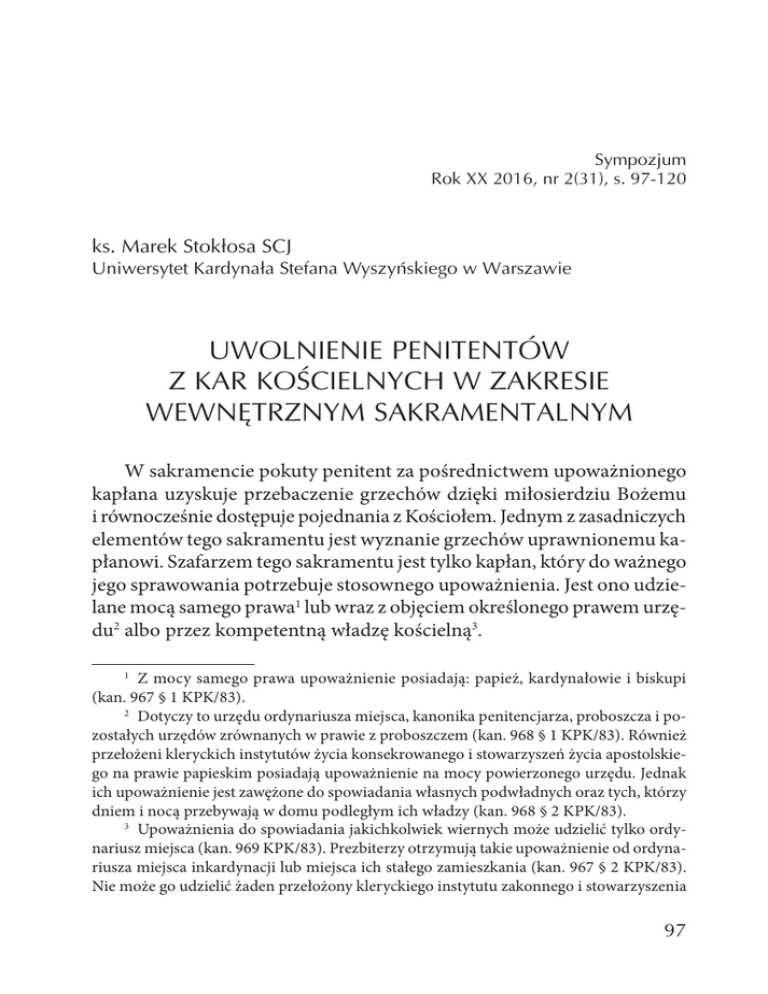 Sympozjum Rok XX 2016, nr 2(31), s. 97-120 ks. Marek Stokłosa SCJ Uniwersytet Kardynała Stefana Wyszyńskiego w Warszawie Uwolnienie penitentów z kar kościelnych w zakresie wewnętrznym sakramentalnym W sakramencie pokuty penitent za pośrednictwem upoważnionego kapłana uzyskuje przebaczenie grzechów dzięki miłosierdziu Bożemu i równocześnie dostępuje pojednania z Kościołem. Jednym z zasadniczych elementów tego sakramentu jest wyznanie grzechów uprawnionemu kapłanowi. Szafarzem tego sakramentu jest tylko kapłan, który do ważnego jego sprawowania potrzebuje stosownego upoważnienia. Jest ono udzielane mocą samego prawa1 lub wraz z objęciem określonego prawem urzędu2 albo przez kompetentną władzę kościelną3. Z mocy samego prawa upoważnienie posiadają: papież, kardynałowie i biskupi (kan. 967 § 1 KPK/83). 2 Dotyczy to urzędu ordynariusza miejsca, kanonika penitencjarza, proboszcza i pozostałych urzędów zrównanych w prawie z proboszczem (kan. 968 § 1 KPK/83). Również przełożeni kleryckich instytutów życia konsekrowanego i stowarzyszeń życia apostolskiego na prawie papieskim posiadają upoważnienie na mocy powierzonego urzędu. Jednak ich upoważnienie jest zawężone do spowiadania własnych podwładnych oraz tych, którzy dniem i nocą przebywają w domu podległym ich władzy (kan. 968 § 2 KPK/83). 3 Upoważnienia do spowiadania jakichkolwiek wiernych może udzielić tylko ordynariusz miejsca (kan. 969 KPK/83). Prezbiterzy otrzymują takie upoważnienie od ordynariusza miejsca inkardynacji lub miejsca ich stałego zamieszkania (kan. 967 § 2 KPK/83). Nie może go udzielić żaden przełożony kleryckiego instytutu zakonnego i stowarzyszenia 1 97 ks. Marek Stokłosa SCJ W indywidualnej i integralnej spowiedzi penitent może wyznać uprawnionemu kapłanowi grzech ciężki, który w prawodawstwie kościelnym zdefiniowany został jako przestępstwo. W tej sytuacji pojawia się pytanie, czy każdy kapłan mający upoważnienie do spowiadania może rozgrzeszyć penitenta z grzechu, który równocześnie jest przestępstwem, za którego popełnienie zaciągnął on mocą samego prawa karę ekskomuniki lub interdyktu zabraniających przyjmowania sakramentów?4 Czy w każdym przypadku może rozgrzeszyć? Odpowiadając na przywołane kwestie, trzeba pokreślić, że samo posiadanie upoważnienia do spowiadania wiernych nie uprawnia spowiednika do uwolnienia penitenta w sakramencie pokuty z zaciągniętej kary. Z przepisów prawa wynika, że spowiednik, a więc kapłan upoważniony do spowiadania, powinien posiadać odpowiednią władzę, która jest udzielana przez samego prawodawcę KPK/83 bądź przez kompetentną władzę kościelną. Władza spowiednika podlega pewnym ograniczeniom, gdyż nie we wszystkich przypadkach może on udzielić absolucji z kar kościelnych, a następnie rozgrzeszyć penitenta z popełnionych grzechów. Źródłem tych ograniczeń jest m.in. podział kar kościelnych na cenzury i kary ekspiacyjne oraz na kary latae sententiae i ferendae sententiae, a także ewentualna deklaracja kary latae sententiae. Ponadto ograniczenie władzy spowiednika wypływa z faktu zastrzeżenia Stolicy Apostolskiej uwolnienia z niektórych ekskomunik latae sententiae5. życia apostolskiego na prawie papieskim. Są oni kompetentni udzielać jedynie upoważnienia podwładnym, jak i pozostałym prezbiterom, które swym zakresem ogranicza się do spowiadania gdziekolwiek członków danego instytutu czy stowarzyszenia oraz tych, którzy dniem i nocą przebywają w domu im podległym (kan. 967 § 3 KPK/83). Prezbiterzy, przynależący do instytutów życia konsekrowanego i stowarzyszeń życia apostolskiego na prawie papieskim, mogą spowiadać jakichkolwiek wiernych wówczas, gdy posiadają stosowne upoważnienie udzielone przez ordynariusza miejsca stałego zamieszkania, które jest im udzielane przynajmniej za domniemaną zgodą ich własnego przełożonego (kan. 969 § 1 KPK/83), chyba że pełnią urzędy, o których mowa w kan. 968 § 1 KPK/83. 4 Por. kan. 1331 § 1 n. 2 oraz 1332 KPK/83. 5 Por. M. Stokłosa, Uwolnienie z kar kościelnych w sakramencie pokuty, „Studia Redemptorystowskie” 9 (2011), s. 337. 98 Uwolnienie penitentów z kar kościelnych w zakresie wewnętrznym… 1. Cenzury latae sententiae Przedmiotem uwolnienia penitentów z kar kościelnych w zakresie wewnętrznym sakramentalnym są cenzury latae sententiae. Jedynie w niebezpieczeństwie śmierci kapłan może uwolnić również z cenzur deklarowanych lub wymierzonych (ferendae sententiae), a także z ekskomunik zarezerwowanych Stolicy Apostolskiej. W aktualnie obowiązującym prawodawstwie powszechnym Kościoła łacińskiego zagrożenie cenzurami latae sententiae zostało ograniczone do minimum. Ponadto prawodawca KPK/83 w kan. 1318 zaleca prawodawstwu partykularnemu zachować umiar w ustanawianiu cenzur i grożeniu karami wiążącymi mocą samego prawa. W kontekście naszej refleksji dotyczącej możliwości uwolnienia z kar kościelnych w sakramencie pokuty warto przypomnieć ekskomuniki latae sententiae zarezerwowane Stolicy Apostolskiej, a następnie pozostałe cenzury latae sententiae zaciągnięte za popełnienie przestępstw zdefiniowanych w aktualnie obowiązującym kościelnym prawodawstwie. Stolicy Apostolskiej zostało zastrzeżone uwolnienie z ekskomuniki za popełnienie następujących przestępstw: 1) użycia przemocy fizycznej wobec osoby papieża (kan. 1370 § 1); 2) znieważenia postaci konsekrowanych albo ich zabierania lub przechowywania w celach świętokradczych (kan. 1367); 3) udzielenia rozgrzeszenia wspólnikowi grzechu przeciw szóstemu przykazaniu Dekalogu (kan. 1378 § 1); 4) udzielenia sakry biskupiej lub jej przyjęcia bez papieskiego mandatu (kan. 1382); 5) bezpośredniego naruszenia przez spowiednika tajemnicy spowiedzi (kan. 1388 § 1). Do wymienionych przestępstw zostały po promulgacji KPK/83 dołączone dwa kolejne, a mianowicie narusz