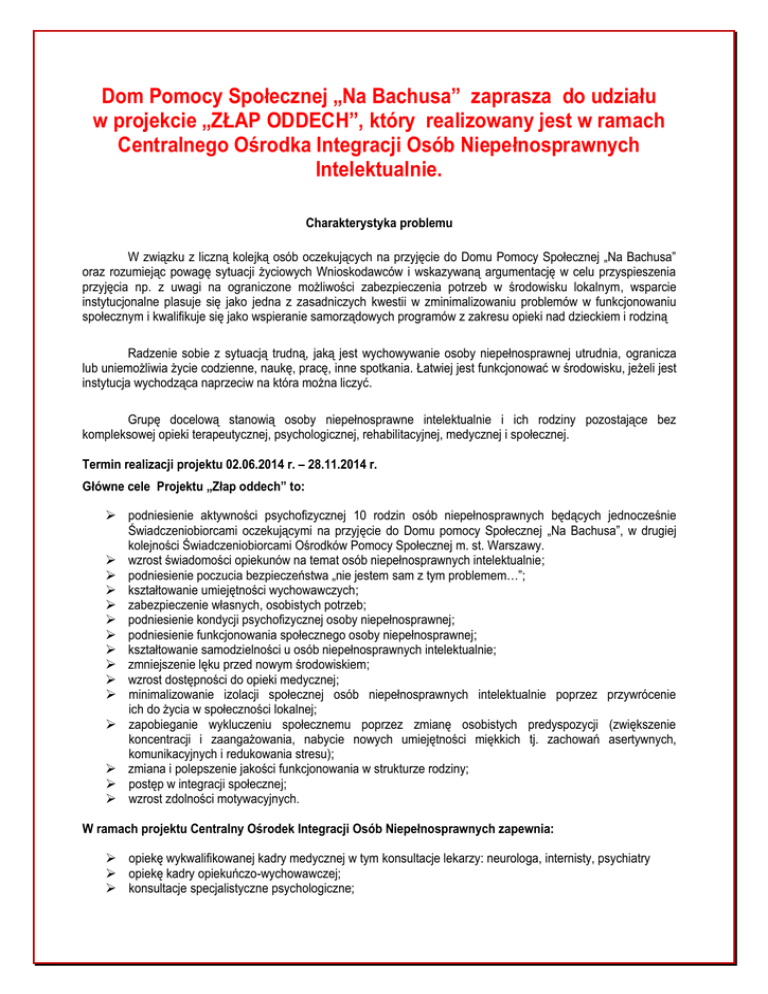 Dom Pomocy Społecznej „Na Bachusa” zaprasza do udziału w projekcie „ZŁAP ODDECH”, który realizowany jest w ramach Centralnego Ośrodka Integracji Osób Niepełnosprawnych Intelektualnie. Charakterystyka problemu W związku z liczną kolejką osób oczekujących na przyjęcie do Domu Pomocy Społecznej „Na Bachusa” oraz rozumiejąc powagę sytuacji życiowych Wnioskodawców i wskazywaną argumentację w celu przyspieszenia przyjęcia np. z uwagi na ograniczone możliwości zabezpieczenia potrzeb w środowisku lokalnym, wsparcie instytucjonalne plasuje się jako jedna z zasadniczych kwestii w zminimalizowaniu problemów w funkcjonowaniu społecznym i kwalifikuje się jako wspieranie samorządowych programów z zakresu opieki nad dzieckiem i rodziną Radzenie sobie z sytuacją trudną, jaką jest wychowywanie osoby niepełnosprawnej utrudnia, ogranicza lub uniemożliwia życie codzienne, naukę, pracę, inne spotkania. Łatwiej jest funkcjonować w środowisku, jeżeli jest instytucja wychodząca naprzeciw na która można liczyć. Grupę docelową stanowią osoby niepełnosprawne intelektualnie i ich rodziny pozostające bez kompleksowej opieki terapeutycznej, psychologicznej, rehabilitacyjnej, medycznej i społecznej. Termin realizacji projektu 02.06.2014 r. – 28.11.2014 r. Główne cele Projektu „Złap oddech” to: podniesienie aktywności psychofizycznej 10 rodzin osób niepełnosprawnych będących jednocześnie Świadczeniobiorcami oczekującymi na przyjęcie do Domu pomocy Społecznej „Na Bachusa”, w drugiej kolejności Świadczeniobiorcami Ośrodków Pomocy Społecznej m. st. Warszawy. wzrost świadomości opiekunów na temat osób niepełnosprawnych intelektualnie; podniesienie poczucia bezpieczeństwa „nie jestem sam z tym problemem…”; kształtowanie umiejętności wychowawczych; zabezpieczenie własnych, osobistych potrzeb; podniesienie kondycji psychofizycznej osoby niepełnosprawnej; podniesienie funkcjonowania społecznego osoby niepełnosprawnej; kształtowanie samodzielności u osób niepełnosprawnych intelektualnie; zmniejszenie lęku przed nowym środowiskiem; wzrost dostępności do opieki medycznej; minimalizowanie izolacji społecznej osób niepełnosprawnych intelektualnie poprzez przywrócenie ich do życia w społeczności lokalnej; zapobieganie wykluczeniu społecznemu poprzez zmianę osobistych predyspozycji (zwiększenie koncentracji i zaangażowania, nabycie nowych umiejętności miękkich tj. zachowań asertywnych, komunikacyjnych i redukowania stresu); zmiana i polepszenie jakości funkcjonowania w strukturze rodziny; postęp w integracji społecznej; wzrost zdolności motywacyjnych. W ramach projektu Centralny Ośrodek Integracji Osób Niepełnosprawnych zapewnia: opiekę wykwalifikowanej kadry medycznej w tym konsultacje lekarzy: neurologa, internisty, psychiatry opiekę kadry opiekuńczo-wychowawczej; konsultacje specjalistyczne psychologiczne; terapię zajęciową; konsultacje z dietetykiem; zajęcia ruchowo-rehabilitacyjne; fizjoterapię; wyżywienie. Uczestnictwo w Projekcie nie będzie wymagało wydania decyzji administracyjnej ani zawarcia umowy pomiędzy podmiotem, u którego będą organizowane zajęcia, a opiekunem prawnym uczestnika projektu, jednak przystąpienie do Projektu będzie wiązało się z przyjęciem zobowiązania do stosowania zasad Projektu, pod rygorem skreślenia z listy uczestników Projektu i przyjęcia w to miejsce innej osoby. Harmonogram zajęć: 1. Zajęcia rehabilitacyjne 45 min. 2. 10 min. przerwa 3. Zajęcia indywidualne 45 min. 4. 10 min. przerwa 5. Obiad 30 min 6. Konsultacje psychologiczne 45 min. 7. 10 min. przerwa 8. Zajęcia integracyjne 45 min Partnerzy przy organizacji projektu na terenie Dzielnicy Wawer 1. Dom Pomocy Społecznej „Na Bachusa”, ul. Bachusa 7; 2. Biuro Pomocy i Projektów Społecznych, ul. Niecała 2; 3. Warszawskie Centrum Pomocy Rodzinie, ul. Lipińska 2; 4. Urząd miasta stołecznego Warszawy, Pl. Bankowy 3/5; 5. Ośrodek Pomocy Społecznej Dzielnicy Wawer m. st. Warszawy; 6. Instytucje wskazane przez Dom Pomocy Społecznej „Na Bachusa”, ul. Bachusa 7. Projekt realizowany jest dwa razy w tygodniu w godzinach 1000-1400 przez pracowników Domu Pomocy Społecznej ”Na Bachusa”. Efekty miękkie: - aktywizacja społeczna dzieci, młodzieży i dorosłych niepełnosprawnych intelektualnie; - podwyższenie gotowości osób niepełnosprawnych do udziału w życiu społecznym; - integracja środowiska osób niepełnosprawnych; - korzystanie przez osoby niepełnosprawne z dóbr kulturalnych; - umożliwienie rodzinom osób niepełnosprawnych korzystania z pełnego życia społecznego; - polepszenie jakości życia poprzez zwiększenie umiejętności samoobsługi; - przełamanie obaw przed wejściem w nowe środowisko. Rezultaty twarde: - skorzystanie z proponowanych usług specjalistycznych przez uczestników projektu (10 osób), - skorzystanie z proponowanych usług specjalistycznych opiekunów osób – uczestników projektu, - powstanie grupy wsparcia wśród opiekunów uczestników projektu, - objęcie wsparciem psychologicznym uczestników projektu i ich opiekunów, - przyjęcie uczestników programu jako mieszkańców Centralnego Ośrodka Integracji Osób Niepełnosprawnych Intelektualnie, - współpraca opiekunów uczestników projektu z Centralnym Ośrodkiem Integracji Osób Niepełnosprawnych Intelektualnie. Infrastruktura przestrzeni: 1. Budynek oraz teren przylegający do budynku pozbawiony barier architektonicznych. 2. Pomieszczenia terapeutyczne, rehabilitacyjne, Snoezelen. Kwalifikowanie do udziału w projekcie Centralnego Ośrodka Integracji Osób Niepełnosprawnych Intelektualnie następuje bezpośrednio przez personel placówki. O terminie przyjęcia osoba zakwalifikowana zostanie powiadomiona w dogodnym dla siebie trybie (drogą telefoniczną bądź za pośrednictwem operatora pocztowego). Ewentualna rezygnacja powinna nastąpić najpóźniej 7 dni pr
