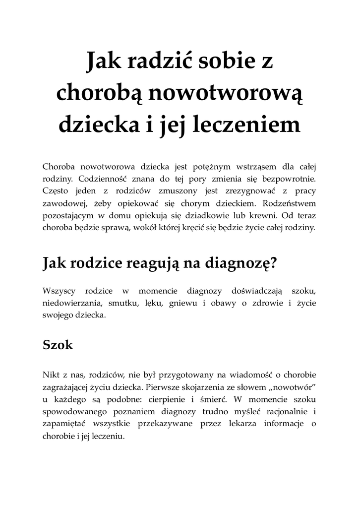 Jak radzić sobie z chorobą nowotworową dziecka i jej leczeniem Choroba nowotworowa dziecka jest potężnym wstrząsem dla całej rodziny. Codzienność znana do tej pory zmienia się bezpowrotnie. Często jeden z rodziców zmuszony jest zrezygnować z pracy zawodowej, żeby opiekować się chorym dzieckiem. Rodzeństwem pozostającym w domu opiekują się dziadkowie lub krewni. Od teraz choroba będzie sprawą, wokół której kręcić się będzie życie całej rodziny. Jak rodzice reagują na diagnozę? Wszyscy rodzice w momencie diagnozy doświadczają szoku, niedowierzania, smutku, lęku, gniewu i obawy o zdrowie i życie swojego dziecka. Szok Nikt z nas, rodziców, nie był przygotowany na wiadomość o chorobie zagrażającej życiu dziecka. Pierwsze skojarzenia ze słowem „nowotwór” u każdego są podobne: cierpienie i śmierć. W momencie szoku spowodowanego poznaniem diagnozy trudno myśleć racjonalnie i zapamiętać wszystkie przekazywane przez lekarza informacje o chorobie i jej leczeniu. Co pomoże nam w pokonaniu „pierwszego szoku”? • Świadomość, że nasze reakcje i odczucia są czymś normalnym, typowym w tej sytuacji. • Wsparcie, którego doświadczamy od bliskich osób. • Rozmowa z psychologiem o swoich odczuciach i obawach. • Zapisywanie najważniejszych, uzyskiwanych od lekarzy informacji odnośnie planu leczenia (można poprosić kogoś zaufanego o towarzyszenie nam w rozmowach z lekarzem, bo na początku trudno samemu ogarnąć ogrom nowych wiadomości). • Dążenie do uzyskania pełnej informacji na temat choroby i leczenia. • Pamięć o tym, że te silne, negatywne uczucia, których na początku doświadczamy z czasem przeminą. Niedowierzanie i zaprzeczanie Z początku wiadomość o tym, że nasze dziecko ma nowotwór może wydawać się czymś nieprawdopodobnym, niemożliwym wręcz. Zdarza się, że dzieci w momencie rozpoznania wydają się całkiem zdrowe „na pierwszy rzut oka” i wtedy tym trudniej zaakceptować, że w rzeczywistości są tak poważnie chore. Rodzice mogą chcieć w takiej sytuacji zasięgnąć opinii innego lekarza (do czego mają prawo i co jest zawsze dobrym pomysłem). Co pomoże nam przejść przez etap niedowierzania? • Uzyskanie szczegółowych odpowiedzi na wszystkie stawiane lekarzom pytania. • Sprawdzenie jaką reputację ma szpital i oddział, na którym leczone będzie dziecko. • Poproszenie o pomoc w zasięgnięciu „drugiej opinii” innego lekarza. Lęk i niepokój To normalne, że czujemy lęk i niepokój, gdy doświadczamy wydarzeń, na które nie mamy wpływu. Niemal każdy z nas czuje strach na dźwięk słowa „rak”. Wielu słyszało lub doświadczyło z czym taka diagnoza się wiąże. Dla wielu ciągle brzmi jak wyrok. Lekarze nie są w stanie przewidzieć, jak nasze dziecko zareaguje na leczenie, wobec czego obawa śmierci wydaje się czymś realnym i zrozumiałym. Zaufanie i oddanie życia i zdrowia najdroższej nam osoby w ręce obcych ludzi – lekarzy, może być bardzo trudne. Ponadto rodzice mogą się bać, że nie będą w stanie sprostać wszystkim wyzwaniom, jakie niesie opieka nad chorym dzieckiem w trakcie intensywnego leczenia. Lęk przed niepewną codziennością i nieznaną przyszłością jest normalny. Co pomoże nam pokonać lęk i niepokój? • Uzyskanie dokładnych informacji. • Wypracowanie zaufania do lekarzy i pielęgniarek. • Rozmawianie o naszych uczuciach z lekarzami i pielęgniarkami. • Poznanie sposobów na zrelaksowanie i zmniejszenie napięcia psychicznego (np. stosowanie różnych technik relaksacyjnych). • Rozmowa z innymi rodzicami chorych dzieci. • Osiągnięcie jak największej kontroli nad procesem leczenia. • Zaakceptowanie, że nie wszystko możemy kontrolować. • Szukanie oparcia w religii i duchowości. Poczucie winy Poczucie winy często pojawia się wkrótce po tym, gdy rodzice zaakceptują fakt, że ich dziecko ma nowotwór. Każdy rodzic czuje, że jego główną rolą jest ochrona dziecka przed niebezpieczeństwem. Pojawiają się w głowie pytania: „Co zrobiliśmy źle?”, „Gdzie popełniliśmy błąd?”. Przypominają się wtedy wszystkie „grzechy przeszłości”: palenie papierosów, nadużywanie alkoholu, złe odżywianie; matki często zastanawiają się, czy przypadkiem nie zrobiły czegoś niewłaściwego będąc w ciąży, co mogło przyczynić się do choroby. Bywa, że rodzice mają poczucie winy, że zbyt późno zauważyli i zareagowali na objawy choroby u dziecka. To normalne, że chcemy wiedzieć, co spowodowało chorobę naszego dziecka, jednak prawda jest taka, że dzisiejsza medycyna nie potrafi dać jednoznacznej odpowiedzi na to pytanie. Jedno jest pewne, rodzice NIE SĄ winni choroby ich dziecka. Co pomoże nam uporać się z poczuciem winy? • Rozmowa z psychologiem. • Otrzymanie odpowiedzi na pytanie o przyczyny powstawania nowotworów. • Wprowadzenie zdrowego trybu życia. • Kontakt z innymi rodzicami chorych dzieci. • Zaakceptowanie faktu, że przyczyna choroby dziecka prawdopodobnie nigdy nie zostanie poznana. • Uświadomienie sobie, że poznanie przyczyny nie cofnie tego, co się wydarzyło. Smutek i depresja Wszyscy rodzice marzą, aby dzieciństwo ich pociech było radosne i beztroskie. Nowotwór i jego leczenie niweczą te plany. Pogrążeni w smutku mogą tracić nadzieję na powrót dziecka do pełni zdrowia. Mogą również czuć przytłaczające przygnębienie na myśl o ciężkich chwilach, jakie przyniesie intensywne szpitalne leczenie. Pesymistyczne podejście może wynikać z gorszych rokowań u ich dziecka, choć często wynika po prostu z cech charakteru i osobowości konkretnego rodzica. Jak wiadomo, są ludzie, którzy mają optymistyczne nastawienie do życia oraz tacy, którzy na każdy życiowy problem reagują lękowo i pesymistycznie. Początkowo rodzice pod wpływem silnego stresu mogą mieć problemy ze snem i apetytem. Mogą nie mieć sił by wykonywać c