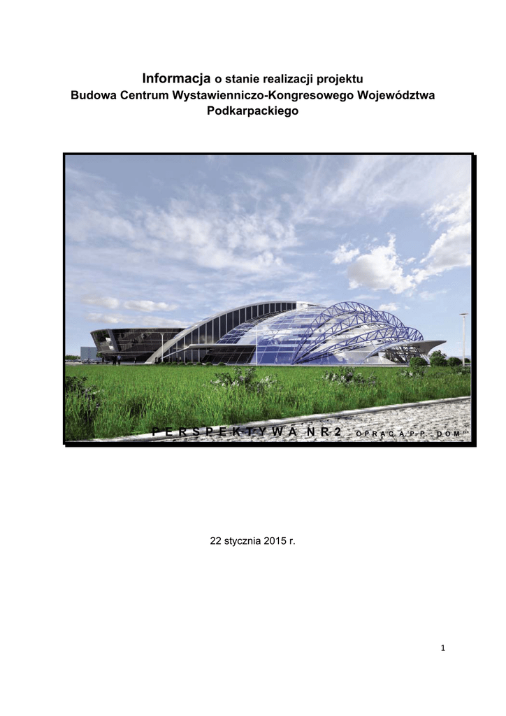 Informacja o stanie realizacji projektu Budowa Centrum Wystawienniczo-Kongresowego Województwa Podkarpackiego 22 stycznia 2015 r. 1 Przygotowanie- Etapy 22 sierpnia 2011 r. - Województwo Podkarpackie wystąpiło do PARP o wpisanie zadania pn.”Budowa Centrum Wystawienniczo – Kongresowego Województwa Podkarpackiego” na Listę Projektów Indywidualnych. 31 października 2011 r. - podpisanie umowy partnerskiej z RARR. Do zadań partnera należało m.in. opracowanie studium wykonalności, przygotowanie koncepcji zagospodarowania przestrzennego, -opracowanie dokumentacji technicznej inwestycji, realizacja inwestycji; 20 stycznia 2012 - została podpisana pre-umowa – przygotowanie projektu. 14 grudnia 2012 r. - podpisanie umowy o dofinansowanie projektu. Całkowity koszt projektu Koszty kwalifikowalne z Vat Koszty niekwalifikowane z Vat 102 080 242,00 95 088 468,64 6 991 773,36 W tym dofinansowanie EFRR+BP 47 544 234,32 Wkład własny 54 536 007,68 Przetarg ograniczony na roboty budowlane ogłoszono w lutym 2013 r. Termin składania wniosków o dopuszczenie do udziału w postępowaniu upłynął w dniu 22 marca 2013 r. Zostało złożonych 16 wniosków i wszyscy oferenci wykazali spełnienie warunków udziału w postępowaniu. W dniu 14 czerwca 2013 r. do 16 wykonawców przekazano zaproszenie do składania ofert wraz ze specyfikacją istotnych warunków zamówienia (w tym projekty wykonawcze) Termin otwarcia ofert przypadł na dzień 2 sierpnia 2013 r. Najniższą kwotę w wysokości 122 916 659,98 zł przedstawiła firma Best Construction Sp. z o.o. i Karpat-Bud Sp. z o.o. Według kosztorysu inwestorskiego wartość robót budowlanych wynosi 155 123 573,11 zł brutto. Równolegle w czerwcu 2013 roku ogłoszony został również przetarg nieograniczony na Inżyniera Kontraktu dla projektu. Termin otwarcia ofert przypadł na dzień 26 lipca 2013 r. Ostatecznie zostało złożonych 12 ofert z czego najniższa złożona przez Bud-Invent sp. z o.o. opiewała na kwotę brutto - 547 000,00 zł, a najwyższa opiewała na kwotę brutto 2 900 340 zł. 17 października 2013 r. - zapewnienie od MRR o możliwości zwiększenia dofinansowania o kwotę wnioskowaną tj. 16 579 102 zł. 2 30 października 2013r. - wybór najkorzystniejszej oferty z przetargu na roboty budowlane, wybierając najkorzystniejszą ofertę złożoną przez Best Construction Sp. z o.o. i Karpat-Bud Sp. z o.o. z siedzibą w Rzeszowie. 30 października 2013 r. - wybór najkorzystniejszej oferty na pełnienie funkcji Inżyniera Kontraktu. Realizacja- Etapy 21 listopada 2013 r. - podpisanie Umowy na usługę Inżyniera Kontraktu z firmą Bud-Invent Sp. z o.o. z siedzibą w Warszawie 11 grudnia 2013 r. - Zarząd RARR powołuje pełnomocnika ds. realizacji projektu. 16 grudnia 2013 - roku otrzymano pismo z Urzędu Zamówień Publicznych brak naruszeń przetargu na roboty budowlane. 19 grudnia 2013 r. - podpisanie Umowy na roboty budowlane z Best Construction Sp. z o.o. i KarpatBud Sp. z o.o. 23 grudnia 2013 r. - pomiędzy Województwem Podkarpackim reprezentowanym przez RARR S.A. w Rzeszowie (Strona przekazująca) a Konsorcjum spółek BEST Construction Sp. z o.o. w Rzeszowie, Karpat-Bud Sp. z o.o. w Rzeszowie, przy udziale Inżyniera Kontraktu BUD-INVENT Sp. z o.o. w Warszawie, został spisany protokół przekazania terenu i placu budowy dla wykonania robót ,,Budowa Centrum Wystawienniczo – Kongresowego Województwa Podkarpackiego”. 30 grudnia 2013 r. - rozpoczęcie robót budowlanych 14 luty 2014 r. - odstąpienie od umowy oraz zawarcie 25 lutego br Porozumienia z Bud-Invent Sp. z o.o. - sprawowanie funkcji Inżyniera Kontraktu przejmuje Rzeszowska Agencja Rozwoju Regionalnego S. A. 14 luty 2014 r. - podpisanie aneksu z PARP - zwiększona wartość całkowita projektu oraz wartość dofinansowania, ponadto zaktualizowano Harmonogram Rzeczowo – Finansowy realizacji Projektu, który to został przedstawiony przez Wykonawcę oraz zatwierdzony przez Inżyniera Kontraktu. 10 marca 2014 r. – na wniosek GW uaktualniono Harmonogram realizacji i finansowania robót, który został przesłany do PARP. 25 lipca 2014 r. - Harmonogram realizacji i finansowania robót z dnia 10.03.2014 r. został zaakceptowany przez PARP. 3 Wraz z wnioskiem o płatność za okres 10.06.2014 - 10.09.2014 złożono do PARP zaktualizowany na dzień 4.09.2014 harmonogram rzeczowo- finansowy Realizacji Projektu. Dokument ten nie został do dnia dzisiejszego zaakceptowany przez PARP, z uwagi na brak akceptacji przez GW. Wartości Wartości wynikające z zawartej umowy o wynikające z dofinansowanie zawartego aneksu projektu z dnia do umowy o 14.12.2012 r. dofinansowanie z dnia 14.02.2014 r. Całkowity koszt projektu 102 080 242,00 Koszty kwalifikowalne z 95 088 468,64 Vat Koszty niekwalifikowane 6 991 773,36 z Vat W tym dofinansowanie 47 544 234,32 EFRR+BP Wkład własny 54 536 007,68 (Województwo Podkarpackie) Tabela nr. 2 Zestawienie kosztów realizacji inwestycji. Wartości wynikające z zwiększenia kwoty na zarządzanie projektem zgodnie z Uchwałą Nr LIX/1122/14 z dnia 13 listopada 2014r. 134 826 146,97 135 326 146,97 128 246 673,10 128 246 673,10 6 579 473,87 7 079 473,87 64 123 336,55 64 123 336,55 70 702 709,91 71 202 709,91 Tabela poniżej przedstawia wysokość faktur wystawionych przez wykonawcę tj. Best Construction Sp. z o.o. i Karpat-Bud Sp. z o.o. a jednocześnie zatwierdzonych do wypłaty przez Inżyniera Kontraktu. Faktura za okres I kwartał 2014 kwiecień maj czerwiec lipiec sierpień Data wystawienia 08-04-2014 21-05-2014 09-06-2014 08-07-2014 07-08-2014 09-09-2014 12 960 441,74 1 849 873,83 1 705 020,96 2 482 186,15 2 237 828,26 2 378 346,79 zapłacona zapłacona zapłacona zapłacona Wartość w PLN Status zapłacona zapłacona SUMA płatności 4 Faktura za okres wrzesień Wrzesień korekta październik listopad Data wystawienia 09-10-2014 22-10-2014 06-11-2014 08-12-2014 Wartość w PLN 2 833 853,19 699 101,54 5 531 967,90 3 77