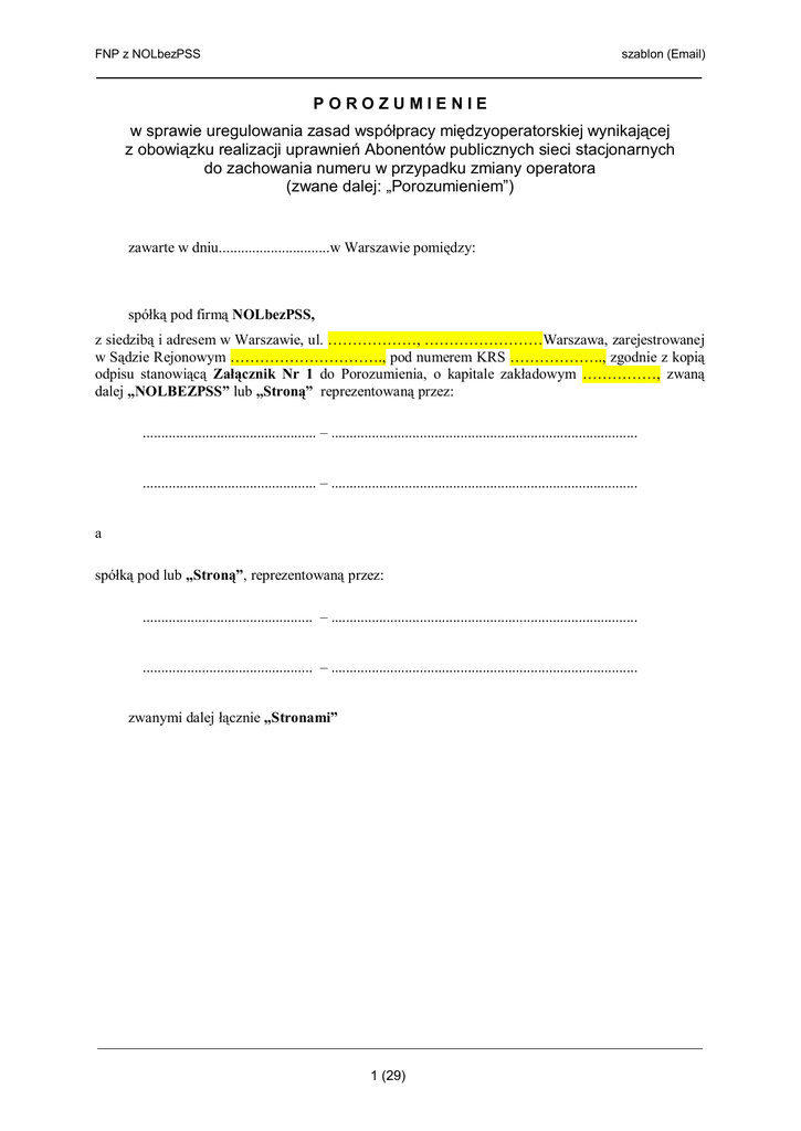 FNP z NOLbezPSS szablon (Email) POROZUMIENIE w sprawie uregulowania zasad współpracy międzyoperatorskiej wynikającej z obowiązku realizacji uprawnień Abonentów publicznych sieci stacjonarnych do zachowania numeru w przypadku zmiany operatora (zwane dalej: „Porozumieniem”) zawarte w dniu..............................w Warszawie pomiędzy: spółką pod firmą NOLbezPSS, z siedzibą i adresem w Warszawie, ul. ………………, ……………………Warszawa, zarejestrowanej w Sądzie Rejonowym …………………………., pod numerem KRS ………………., zgodnie z kopią odpisu stanowiącą Załącznik Nr 1 do Porozumienia, o kapitale zakładowym ……………, zwaną dalej „NOLBEZPSS” lub „Stroną” reprezentowaną przez: ............................................... – ................................................................................... ............................................... – ................................................................................... a spółką pod lub „Stroną”, reprezentowaną przez: .............................................. – ................................................................................... .............................................. – ................................................................................... zwanymi dalej łącznie „Stronami” 1 (29) FNP z NOLbezPSS szablon (Email) POSTANOWIENIA WSTĘPNE Zważywszy, że: 1. Strony są przedsiębiorcami telekomunikacyjnymi. 2. Prezes Urzędu Regulacji Telekomunikacji i Poczty dokonał wpisu przedsiębiorstwa NOLBEZPSS do rejestru przedsiębiorców telekomunikacyjnych pod numerem 20 i na dzień podpisania Porozumienia wpis ten jest aktualny. 3. Prezes Urzędu Regulacji Telekomunikacji i Poczty dokonał wpisu PTC do rejestru przedsiębiorców telekomunikacyjnych pod numerem 4 i na dzień podpisania Porozumienia wpis ten jest aktualny. 4. Prezes Urzędu Regulacji Telekomunikacji i Poczty wydał w dniu 6 września 2005 roku stanowisko określające wytyczne w zakresie wymagań technicznych na interfejsie międzyoperatorskim niezbędnych dla realizacji uprawnień abonenta do przeniesienia numeru między przedsiębiorcami telekomunikacyjnymi, którego treść stanowi Załącznik Nr 3. W oparciu o to stanowisko Strony ustaliły zasady współpracy pomiędzy sieciami Stron, o których mowa w niniejszym Porozumieniu. Strony postanawiają, co następuje: PRZEDMIOT POROZUMIENIA Artykuł 1 1. Przedmiotem Porozumienia jest określenie zasad współpracy międzyoperatorskiej wynikającej z obowiązku realizacji uprawnień Abonentów Dawcy do Przeniesienia Numeru do Sieci Biorcy, w przypadku zawarcia przez tych Abonentów Umów Abonenckich z Biorcą. 2. Porozumienie określa: a) Proces przeniesienia numeru z sieci stacjonarnej Dawcy do sieci stacjonarnej Biorcy; b) zasady kierowania ruchu telekomunikacyjnego na Numery Przeniesione w ramach sieci Stron DEFINICJE Artykuł 2 1. Abonent – podmiot, który jest stroną umowy zawartej w formie pisemnej o świadczenie usług z dostawcą publicznie dostępnych usług telekomunikacyjnych w sieci stacjonarnej 2. Akcja Przeniesienia – techniczne przeniesienie Numeru Katalogowego z sieci Dawcy do sieci Biorcy. Za czas przeprowadzenia Akcji Przeniesienia przyjmuje się okres pomiędzy zaprzestaniem przez Operatora Dawcę świadczenia usług telekomunikacyjnych na Numerze Przeniesionym a rozpoczęciem przez Operatora Biorcę świadczenia usług telekomunikacyjnych na Numerze Przeniesionym. Data dokonania Akcji Przeniesienia to data rozpoczęcia świadczenia przez Operatora Biorcę usług telekomunikacyjnych na Numerze Przeniesionym na rzecz Abonenta. Akcję Przeniesienia uważa się za dokonaną z chwilą wprowadzenia zmian w systemach komutacyjnych Operatora Dawcy lub Przedsiębiorcy Macierzystego (w przypadku kolejnej Akcji Przeniesienia) powodujących automatyczne kierowanie połączeń na Numer Przeniesiony do Sieci Operatora Biorcy. 3. Awaria – stan techniczny sieci lub jej elementów uniemożliwiający lub poważnie ograniczający świadczenie usług realizacji uprawnień Abonentów publicznych sieci stacjonarnych do zachowania numeru w przypadku zmiany operatora jak również drobniejsze uszkodzenia mające lub nie mające bezpośredniego i natychmiastowego wpływu na funkcjonowanie połączeń do Numerów Przeniesionych. 2 (29) FNP z NOLbezPSS szablon (Email) 4. Biorca – przedsiębiorca telekomunikacyjny świadczący usługi w stacjonarnej publicznej sieci telefonicznej, do którego Abonent zamierza przenieść lub przeniósł swój Numer Katalogowy 5. Dawca – przedsiębiorca telekomunikacyjny, świadczący usługi w stacjonarnej publicznej sieci telefonicznej, którego Abonent wykorzystywał Numer Katalogowy przed dokonaniem przeniesienia tego Numeru Katalogowego do innego przedsiębiorcy telekomunikacyjnego świadczącego usługi w publicznej stacjonarnej sieci telekomunikacyjnej. 6. Dzień Roboczy – wszystkie dni tygodnia za wyjątkiem sobót, niedziel oraz innych dni ustawowo wolnych od pracy obowiązujących w RP. 7. Metoda Onward Routing (Metoda OR) – metoda realizacji Przeniesienia Numerów polegająca na kierowaniu połączenia od Abonenta inicjującego połączenie do Numeru Przeniesionego za pośrednictwem sieci Przedsiębiorcy Macierzystego. Przedsiębiorca Macierzysty dodaje do Numeru Katalogowego Numer Routingowy umożliwiający kierowanie połączeń na Numer Przeniesiony do Sieci Biorcy. Przez cały czas trwania połączenia wykorzystywane są zasoby sieci Przedsiębiorcy Macierzystego. 8. Numer Dostępu do Sieci (NDS) – czterocyfrowy numer dostępu do Sieci przyznany Operatorowi, zgodnie z PNK oraz Ustawą. 9. Numer Przeniesiony – Numer Katalogowy, który Abonent zachował przy zawarciu Umowy Abonenckiej z Biorcą, został przeniesiony do Sieci Biorcy i który nie jest wykorzystywany przez innego Abonenta w sieci Przedsiębiorcy Macierzysteg