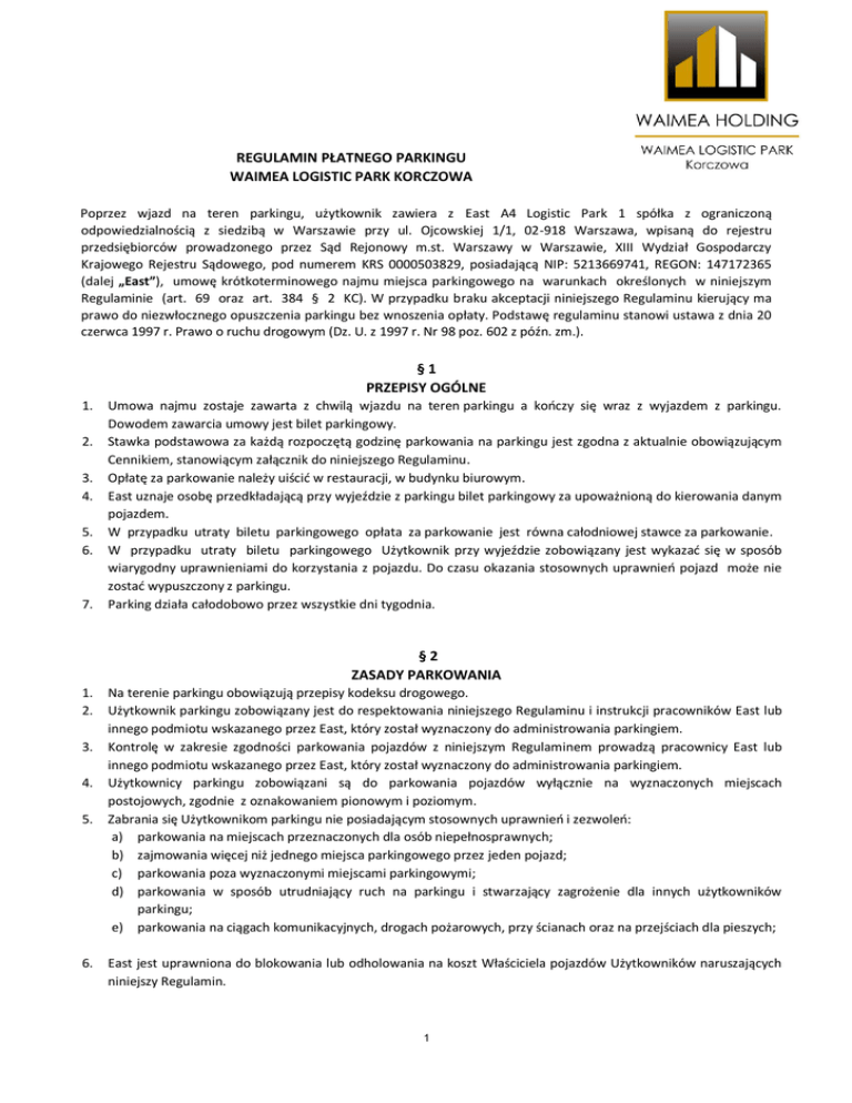 REGULAMIN PŁATNEGO PARKINGU WAIMEA LOGISTIC PARK KORCZOWA Poprzez wjazd na teren parkingu, użytkownik zawiera z East A4 Logistic Park 1 spółka z ograniczoną odpowiedzialnością z siedzibą w Warszawie przy ul. Ojcowskiej 1/1, 02-918 Warszawa, wpisaną do rejestru przedsiębiorców prowadzonego przez Sąd Rejonowy m.st. Warszawy w Warszawie, XIII Wydział Gospodarczy Krajowego Rejestru Sądowego, pod numerem KRS 0000503829, posiadającą NIP: 5213669741, REGON: 147172365 (dalej „East”), umowę krótkoterminowego najmu miejsca parkingowego na warunkach określonych w niniejszym Regulaminie (art. 69 oraz art. 384 § 2 KC). W przypadku braku akceptacji niniejszego Regulaminu kierujący ma prawo do niezwłocznego opuszczenia parkingu bez wnoszenia opłaty. Podstawę regulaminu stanowi ustawa z dnia 20 czerwca 1997 r. Prawo o ruchu drogowym (Dz. U. z 1997 r. Nr 98 poz. 602 z późn. zm.). §1 PRZEPISY OGÓLNE 1. 2. 3. 4. 5. 6. 7. Umowa najmu zostaje zawarta z chwilą wjazdu na teren parkingu a kończy się wraz z wyjazdem z parkingu. Dowodem zawarcia umowy jest bilet parkingowy. Stawka podstawowa za każdą rozpoczętą godzinę parkowania na parkingu jest zgodna z aktualnie obowiązującym Cennikiem, stanowiącym załącznik do niniejszego Regulaminu. Opłatę za parkowanie należy uiścić w restauracji, w budynku biurowym. East uznaje osobę przedkładającą przy wyjeździe z parkingu bilet parkingowy za upoważnioną do kierowania danym pojazdem. W przypadku utraty biletu parkingowego opłata za parkowanie jest równa całodniowej stawce za parkowanie. W przypadku utraty biletu parkingowego Użytkownik przy wyjeździe zobowiązany jest wykazać się w sposób wiarygodny uprawnieniami do korzystania z pojazdu. Do czasu okazania stosownych uprawnień pojazd może nie zostać wypuszczony z parkingu. Parking działa całodobowo przez wszystkie dni tygodnia. §2 ZASADY PARKOWANIA 1. 2. 3. 4. 5. 6. Na terenie parkingu obowiązują przepisy kodeksu drogowego. Użytkownik parkingu zobowiązany jest do respektowania niniejszego Regulaminu i instrukcji pracowników East lub innego podmiotu wskazanego przez East, który został wyznaczony do administrowania parkingiem. Kontrolę w zakresie zgodności parkowania pojazdów z niniejszym Regulaminem prowadzą pracownicy East lub innego podmiotu wskazanego przez East, który został wyznaczony do administrowania parkingiem. Użytkownicy parkingu zobowiązani są do parkowania pojazdów wyłącznie na wyznaczonych miejscach postojowych, zgodnie z oznakowaniem pionowym i poziomym. Zabrania się Użytkownikom parkingu nie posiadającym stosownych uprawnień i zezwoleń: a) parkowania na miejscach przeznaczonych dla osób niepełnosprawnych; b) zajmowania więcej niż jednego miejsca parkingowego przez jeden pojazd; c) parkowania poza wyznaczonymi miejscami parkingowymi; d) parkowania w sposób utrudniający ruch na parkingu i stwarzający zagrożenie dla innych użytkowników parkingu; e) parkowania na ciągach komunikacyjnych, drogach pożarowych, przy ścianach oraz na przejściach dla pieszych; East jest uprawniona do blokowania lub odholowania na koszt Właściciela pojazdów Użytkowników naruszających niniejszy Regulamin. 1 7. 8. Kierowca, którego pojazd został zablokowany, zobowiązany jest skontaktować się z East w celu uiszczenia opłaty dodatkowej, będącej karą umowną za parkowanie niezgodnie z niniejszym Regulaminem, zgodnie z aktualnie obowiązującym Cennikiem. East jest upoważniona do żądania natychmiastowego opuszczenia terenu parkingu przez Użytkowników stwarzających zagrożenie na Parkingu. §2 ODPOWIEDZIALNOŚĆ STRON 1. 2. 3. 4. 5. 6. 7. 8. Z zastrzeżeniem postanowień niniejszego § 2 odpowiedzialność Stron określają odpowiednie przepisy kodeksu cywilnego, w szczególności dotyczące umowy najmu. East odpowiada wyłącznie za udowodnione szkody zawinione przez jej pracowników lub zleceniobiorców, jakie miały miejsce w trakcie trwania umowy najmu. East lub inny podmiot wskazany przez East, który został wyznaczony do administrowania parkingiem nie ponoszą odpowiedzialności za szkody z tytułu kradzieży, utraty lub zniszczenia pojazdu, jak i rzeczy pozostawionych w pojeździe. Użytkownik jest zobowiązany do natychmiastowego poinformowania o zaistnieniu szkody, za którą odpowiedzialność może ponosić East, lecz nie później niż przed wyjazdem z parkingu, pod rygorem utraty roszczenia. East nie ponosi odpowiedzialności za szkody wynikające z działań osób trzecich, siły wyższej oraz nieprzestrzegania przez korzystającego z parkingu postanowień niniejszego Regulaminu. Reklamacje dotyczące świadczonych usług w zakresie powyższego Regulaminu, należy składać w formie pisemnej na adres: East A4 Logistic Park 1 sp. z o.o., ul. Ojcowska 1/1, 02-918 Warszawa. Użytkownik Parkingu odpowiada za wszystkie szkody, w tym za zanieczyszczenie Parkingu, powodowane przez niego samego, jego pracowników, współpracowników, osoby mu towarzyszące. Użytkownik parkingu ponosi odpowiedzialność za szkody spowodowane na skutek oddania osobie trzeciej lub utraty przez niego biletu parkingowego. §3 PRZEPISY BEZPIECZEŃSTWA 1. 2. Na terenie Parkingu dozwolona prędkość pojazdów wynosi 10 km/h. Na terenie Parkingu bezwzględnie zabronione jest: a) palenie tytoniu; b) używanie otwartego ognia; c) magazynowanie paliw, substancji łatwopalnych i pustych pojemników po paliwie; d) tankowanie; e) naprawianie i inne czynności serwisowe; f) mycie, czyszczenie i odkurzanie; g) zanieczyszczanie terenu parkingu w inny sposób; h) pozostawienie pojazdu z pracującym silnikiem; i) parkowanie pojazdów z nieszczelnościami układów i instalacji powodującymi wycieki płynów eksploatacyjnych oraz paliwa; j) przebywanie osób nieupoważnionych; k) przebywanie na Parkingu osób w czasie przekraczającym ten, który jest konieczny do pozostawienia lub wyprowadzenia samochodu z parkingu; 2