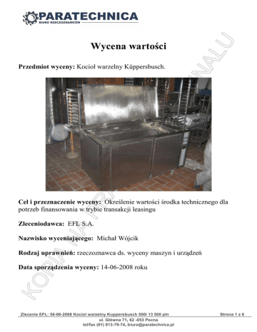 Wycena wartości Przedmiot wyceny: Kocioł warzelny Küppersbusch. Cel i przeznaczenie wyceny: Określenie wartości środka technicznego dla potrzeb finansowania w trybie transakcji leasingu Zleceniodawca: EFL S.A. Nazwisko wyceniającego: Michał Wójcik Rodzaj uprawnień: rzeczoznawca ds. wyceny maszyn i urządzeń Data sporządzenia wyceny: 14-06-2008 roku Zlecenie EFL: 56-06-2008 Kociol warzelny Kuppersbusch 500l 13 500 pln ul. Główna 71, 62 -053 Pecna tel/fax (61) 813-79-74, [email protected] Strona 1 z 6 Podstawa metodologiczna wyceny. Dla spełnienia celu i przeznaczenia wyceny zgodnie z potrzebami zamawiającego, należy ustalić wartość rynkową przedmiotu wyceny oraz jego wartość likwidacyjną. Wartość rynkowa: Definiowana jest jako kwota pieniężna którą potencjalny kupujący będzie skłonny zapłacić sprzedającemu w zamian za przedmiot transakcji przy założeniu równości stron, bez istnienia żadnego przymusu wpływającego na decyzję o zakupie lub sprzedaży, przy pełnej znajomości przedmiotu i okoliczności transakcji, w określonym czasie. Zakłada się odpowiedni długi czas wyeksponowania przedmiotu sprzedaży na nieograniczonym, tzn. o wolnym dostępie do rynku. Powyższe wartości uwzględniają m.in. rodzaj i zastosowanie środków technicznych oraz wytwórcę, a także konstrukcję, stan techniczny, stopień zużycia i wiek, okres i sposób eksploatacji, pozostały do dyspozycji przewidywany czas życia technicznego, a także warunki popytu i podaży określające atrakcyjność rynkową. Wartość likwidacyjna przy sprzedaży wymuszonej: jest to przewidywana cena jaka może być uzyskana ze sprzedaży środków technicznych na prawidłowo ogłoszonym i przeprowadzonym przetargu publicznym, aukcji lub licytacji, przy konieczności bezzwłocznej sprzedaży i przy założeniu, że sprzedający jest zmuszony do transakcji poprzez okoliczności zaś środki techniczne sprzedaje się w takim stanie i w takim miejscu w jakim się aktualnie znajdują. Podstawą wyceny w wyżej wymienionym celu są: • Szczegółowa identyfikacja przedmiotu wyceny • Ustalenie dotyczące kompletności i sprawności maszyny oraz jej stanu technicznego. • Ustalenie dotyczące eksploatacji (czas, warunki, konserwacja, naprawy) i możliwości dalszego użytkowania. Wycena zostanie wykonana w podejściu kosztowym. Do wyliczenia wykorzystano ceny ofertowe i transakcyjne z własnej bazy danych oraz oferty firm zajmujących się obrotem pierwotnym i wtórnym tego typu maszyn. W podejściu tym zidentyfikowano koszt zastąpienia nowych urządzeń linii technologicznej oraz uwzględniono ubytek wartości z przyczyn fizycznych, ubytek wartości z przyczyn funkcjonalnych i ubytek wartości z przyczyn ekonomicznych. Data i miejsce badania: Oględziny przedmiotu wyceny wykonano dnia 11-06-2008 w Słupsku. Uwagi dodatkowe: Wszelkich informacji o przedmiocie wyceny udzielił Pan Krzysztof Lancewicz Zlec EFL: 56-06-2008 Kociol warzelny Kuppersbusch 500l 13 500 pln ul. Główna 71, 62 -053 Pecna tel/fax (61) 813-79-74, [email protected] Strona 2 z 6 Dane identyfikacyjne przedmiotu wyceny: • • • • • • nazwa środka technicznego: Kocioł warzelny producent : Küppersbusch Großküchentechnik GmbH typ, model : 16 02 numery fabryczne: 7882 rok produkcji: 2002 wg oświadczenia sprzedającego. Lokalizacja: Słupsk ul. Kilińskiego 26 Opis, przeznaczenie i skrócone dane techniczne przedmiotu wyceny: Kocioł warzelny przeznaczony jest do parzenia i gotowania produktów oraz wyrobów wędliniarskich, a także topienia tłuszczu. Cały kocioł warzelny wykonany jest ze stali kwasoodpornej. Pojemność kotła 500 litrów, moc 36 kW, wymiary 103x125x180cm. Grzanie elektryczne. Dokumentacja fotograficzna Zlec EFL: 56-06-2008 Kociol warzelny Kuppersbusch 500l 13 500 pln ul. Główna 71, 62 -053 Pecna tel/fax (61) 813-79-74, [email protected] Strona 3 z 6 Informacje o ogólnym stanie technicznym, miarach zużycia poszczególnych elementów, o przebiegu eksploatacji, i o pozostałym do dyspozycji okresie użytkowania. Do oględzin przedstawiono urządzenie w miejscu przechowywania. Przewidywany okres pracy kotłów warzelniczych to średnio ok. 15 lat. W trakcie oględzin nie stwierdzono że urządzenie było poddane pracom remontowym. Brak informacji o ilości dotychczasowych właścicieli. Urządzenie kompletne, w pełni funkcjonalne. Szacuje się że pozostały czas eksploatacji wynosi około 7-10 lat. Informacje o rynku i cenach Urządzenie nie jest obecnie produkowane. Cenę nowego urządzenia, analogicznego pod względem funkcjonalnym, ustalono w firmie JUGEMA P.P.U.H Środa Wlkp. www.jugema.com.pl. Jest to kocioł K-50 w cenie transakcyjnej na poziomie 22 000zł netto. Hipotetyczny koszt zakupu kotła Küppersbusch gdyby był nadal produkowany mógłby wynieść około 20-25% więcej w stosunku do kotła produkcji polskiej. Zatem wartość początkowa wyniosłaby około 27 500PLN netto. Na podstawie przeprowadzonej analizy rynku pierwotnego i wtórnego można stwierdzić, iż: • wyceniane urządzenia występują w obrocie wtórnym, używane maszyny są w różnym stanie technicznym który jest trudny do zweryfikowania, dlatego przeprowadzenie bezpośredniej analizy porównawczej z urządzeniami które nie były remontowane jest niemożliwe. • wobec powyższego, indywidualną wartość rynkową przedmiotu wyceny określono w podejściu kosztowym z elementami podejścia porównawczego. • oszacowanie indywidualnej wartości rynkowej na podstawie rynku pierwotnego i wtórnego: jako podstawę oszacowania przyjęto informację cenową uzyskaną od polskich przedstawicieli producentów urządzeń piekarniczych. Wartość rynkowa urządzeń ustalona w podejściu kosztowym: • określenie utraty wartości z przyczyn fizycznych (Uf)- utrata wartości z przyczyn fizycznych obejmuje ubytek użyteczności lub wartości środka technicznego z Zlec EFL: 56-06-2008 Kociol warzelny Kuppersbu