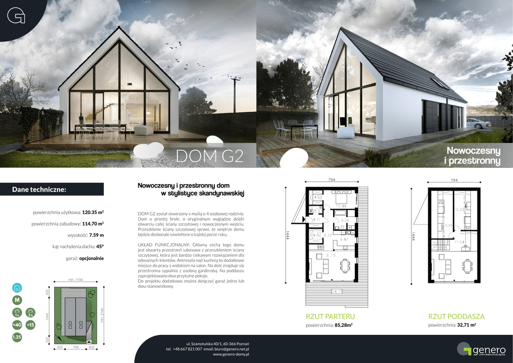 Nowoczesny i przestronny DOM G2 Nowoczesny i przestronny dom w stylistyce skandynawskiej Dane techniczne: powierzchnia użytkowa: 120.35 m2 powierzchnia zabudowy: 114,70 m2 wysokość: 7.59 m kąt nachylenia dachu: 45° garaż: opcjonalnie DOM G2 został stworzony z myślą o 4 osobowej rodzinie. Dom o prostej bryle, o oryginalnym wyglądzie dzięki otwarciu całej ściany szczytowej i nowoczesnym wejściu. Przeszklenie ściany szczytowej sprawi, że wnętrze domu będzie doskonale oświetlone o każdej porze roku. UKŁAD FUNKCJONALNY: Główną cechą tego domu jest otwarta przestrzeń salonowa z przeszkleniem ściany szczytowej, która jest bardzo ciekawym rozwiązaniem dla odważnych klientów. Antresola nad kuchnią to dodatkowe miejsce do pracy z widokiem na salon. Na dole znajduje się przestronna sypialnia z osobną garderobą. Na poddaszu zaprojektowano dwa przytulne pokoje. Do projektu dodatkowo można dołączyć garaż jedno lub dwu-stanowiskowy. M 1 x 2 x <40 <15 1.25 ul. Szamotulska 40/1, 60-366 Poznań tel. +48 667 821 007 email: [email protected] www.genero-domy.pl RZUT PARTERU RZUT PODDASZA powierzchnia: 85,28m2 powierzchnia: 32,71 m2