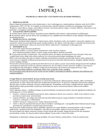 INSTRUKCJA MONTAŻU I UŻYTKOWANIA BATERII IMPERIAL 1. PRZEZNACZENIE Baterie Imperial przeznaczone są do instalowania w sieci wodociągowej o maksymalnym ciśnieniu wody do 0,6 MPa i temperaturze 100 C (373 K). Ze względu na zastosowania i sposób montażu rozróżnia się następujące typy baterii: Wannowe, umywalkowe stojące, umywalkowe ścienne, zlewozmywakowe stojące i ścienne, bidetowe, natryskowe oraz kuchenne z wyciągana wylewką prysznicową. 2. ZALECENIA MONTAŻOWE A/ montaż baterii należy powierzyć specjalistycznym zakładom, lub osobom z odpowiednimi kwalifikacjami B/ do montażu należy używać kluczy nie zaciskających się o gładkich powierzchniach szczęk najlepiej zabezpieczonych bawełnianą tkaniną 3. EKSPLOATACJA BATERII Poprawność działania baterii Imperial w dużej mierze zależy od jakości wody- jej twardości- nasycenia wapniem oraz zawartości zanieczyszczeń takich jak piasek, kamień kotłowy, itp. Jakość wody decyduje o częstotliwości konserwacji baterii przez użytkownika. Zaleca się stosowania filtrów siatkowych w instalacjach wodociągowych. 4. KONSERWACJA A/ czyszczenie napowietrzacza (perlatora) - wykręcić perlator i oczyścić silnym strumieniem wody od strony wpływu - przy wkręcaniu perlatora należy zwrócić uwagę na prawidłowe ułożenie uszczelki B/ Czyszczenie powłok zewnętrznych. Aby zachować prawo do napraw gwarancyjnych oraz utrzymać estetyczny wygląd baterii przez długi okres należy podczas ich czyszczenia przestrzegać następujących zasad: Brud, osad oraz plamy powstałe na skutek osadzania się kamienia usuwamy przemywając baterię wodą z płynem do mycia naczyń względnie środkami przeznaczonymi do mycia powierzchni chromowanych, następnie opłukać baterię i wytrzeć miękką szmatką. Powierzchni chromowanych, pozłacanych lub kolorowych nie należy czyścić ściereczkami chropowatymi lub środkami zawierającymi materiały ścierne np. mączkę marmurową, itp. Nie należy również stosować środków czyszczących zawierających silne detergenty, środków rysujących powierzchnie, jak również zawierających kwasy i ługi. Uwaga! Powierzchnie grafitowe i pozłacane należy myć wyłącznie wodą z mydłem. Do czyszczenia części akrylowych nie wolno używać środków zawierających alkohol, substancji dezynfekujących i rozpuszczalników. Uwaga! Dotyczy mycia baterii- proszę uważnie przeczytać Powierzchnie zewnętrzne armatury pokryte są warstwami ochronnymi i dekoracyjnymi; chromu, niklu, powłokami szlachetnymi ze złota, rutenu lub malowane są lakierami proszkowymi. W procesie wykonania zastosowano najlepsze dla tego typu wyrobów materiały i procesy technologiczne. Warunkiem zachowania w długim okresie użytkowania dobrej jakości stanu powierzchni wyrobu jest stosowanie do mycia i konserwacji baterii właściwych środków czyszczących. Osad wapienny, plamy z mydła powstające na powierzchniach zewnętrznych należy zmywać łagodnymi środkami, nie zawierającymi w swoim składzie: • kwasów- zwłaszcza nieorganicznych (kwas solny rozpuszcza chrom, kwas azotowy- nikiel, kwas siarkowy może powodować matowienie powierzchni) • rozpuszczalników- powodują zmywanie powierzchni lakierowanych, mogą uszkadzać ewentualne elementy z tworzywa, wchodzące w skład baterii • środków ściernych- mogą rysować każdy rodzaj powierzchni • chloru w dużych stężeniach lub innych silnych środków wybielających- w przypadku baterii lakierowanych mogą spowodować uszkodzenia i przebarwienia powierzchni. Przed użyciem środka myjącego należy dokładnie zapoznać się z jego składem i przeznaczeniem. Jeśli występuje jakikolwiek z podanych powyżej składników, lub jeśli jest nie podany, lepiej nie używać takiego środka. Do mycia baterii nie należy stosować również ostrych myjek lub szczotek, mogących porysować lub uszkodzić powierzchnię wyrobu. Po umyciu należy baterię spłukać czystą wodą i wytrzeć do sucha. Dziękujemy za dokonanie zakupu naszego produktu. Życzymy Państwu zadowolenia i wielu lat użytkowania. Ul. Mazowiecka 6, 09-100 Płońsk, Tel. 023-662-68-01, fax. 023-662-68-02 e-mail: [email protected] www.grass.pl Dział serwisu: 023-662-68-01 wew. 205