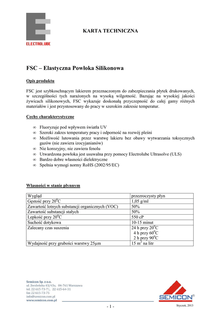 KARTA TECHNICZNA FSC – Elastyczna Powłoka Silikonowa Opis produktu FSC jest szybkoschnącym lakierem przeznaczonym do zabezpieczania płytek drukowanych, w szczególności tych narażonych na wysoką wilgotność. Bazując na wysokiej jakości żywicach silikonowych, FSC wykazuje doskonałą przyczepność do całej gamy różnych materiałów i jest przystosowany do pracy w szerokim zakresie temperatur. Cechy charakterystyczne • • • • • • • Fluoryzuje pod wpływem światła UV Szeroki zakres temperatury pracy i odporność na rozwój pleśni Możliwość lutowania przez warstwę lakieru bez obawy wytwarzania toksycznych gazów (nie zawiera izocyjanianów) Nie korozyjny, nie zawiera fenolu Utwardzona powłoka jest usuwalna przy pomocy Electrolube Ultrasolve (ULS) Bardzo dobre własności dielektryczne Spełnia wymogi normy RoHS (2002/95/EC) Własności w stanie płynnym Wygląd Gęstość przy 200C Zawartość lotnych substancji organicznych (VOC) Zawartość substancji stałych Lepkość przy 200C Suchość dotykowa Zalecany czas suszenia Wydajność przy grubości warstwy 25µm -1- przezroczysty płyn 1,05 g/ml 50% 50% 550 cP 10-15 minut 24 h przy 200C 4 h przy 600C 2 h przy 900C 15 m2 na litr Styczeń, 2013 KARTA TECHNICZNA Własności suchej powłoki Barwa Zakres temperatur pracy Palność Cykl termiczny Współczynnik rozszerzalności Wytrzymałość dielektryczna Stała dielektryczna Rezystancja izolacji Współczynnik strat (100Hz, 250C) Odporność na wilgoć Komora solna bezbarwny - 500C do 1250C samogasnący spełnia wymogi MIL-1-46058C 150 ppm 80 kV/mm 2,7 1 x 1020 Ohms/cm 0,001 spełnia wymogi MIL-1-46058C spełnia wymogi ASTM B117-03 Produkt Opakowanie Kod towaru Okres użytkowy FSC 400ml Aerozol 5l luzem FSC400 FSC05L 24 m-ce 36 m-ce Rozcieńczalnik (bezakrylowy) 1l 5l DCT01L DCT05L 36 m-ce 36 m-ce Rozpuszczalnik usuwający 200ml Aerozol 400ml Aerozol 1L luzem 5L luzem 25L luzem ULS200D ULS400D ULS01L ULS05L ULS25L 36 m-ce 36 m-ce 72 m-ce 72 m-ce 72 m-ce -2- Styczeń, 2013 KARTA TECHNICZNA Zalecenia użytkowe Lakier FSC może być nanoszony techniką natryskową, zanurzeniową lub pędzlem. Grubość powłoki zależy od metody nanoszenia (zwykle 25 mikronów). Temperatura poniżej 160C albo wilgotność względna powyżej 75% są nieodpowiednie dla stosowania FSC. Jak w przypadku wszystkich rozpuszczalnikowych lakierów, wymagana jest odpowiednia wentylacja (dalsze informacje dostępne w karcie charakterystyki). Podłoże przed lakierowaniem powinno zostać całkowicie oczyszczone. Jest to istotne celem osiągnięcia zadawalającej przyczepności. Wszelkie pozostałości topnika muszą zostać usunięte, ponieważ pozostawione na płytce stanowią ogniska korozji. Electrolube dysponuje całym szeregiem środków czyszczących zarówno rozpuszczalnikowych jak i wodnych spełniających normy militarne. Natrysk-luzem Przed natryskiem FSC powinien być rozcieńczony odpowiednim rozcieńczalnikiem (DCT). Optymalna lepkość jest uzależniona od stosowanego sprzętu natryskowego, ale zwykle mieści się w przedziale 50-80 cP. Jeżeli środek był mieszany należy odczekać aż wszystkie pęcherze powietrza zostaną równomiernie rozprowadzone. Średnica dyszy natryskowej powinna umożliwić równomierne rozprowadzenie środka. Ciśnienie natryskiwanego lakieru powinno być w zakresie 300-400 kPa . Po natrysku płytka powinna być umieszczona w kabinie z cyrkulującym powietrzem i pozostawiona do wysuszenia. Natrysk-aerozolem Przy stosowaniu lakieru FSC w formie aerozolu nie należy wstrząsać pojemnikiem. Może to spowodować wytwarzanie pęcherzy powietrza i tym samym pogorszyć jakość powłoki. Pojemnik powinien być trzymany pod kątem 450 w odległości 20cm od pokrywanej powierzchni. Zawór należy zwolnić gdy pojemnik jest skierowany blisko celu i przesuwać go wzdłuż celu z prędkością około 10cm/sek. Dla osiągnięcia najlepszych efektów należy stosować ruch łagodnie zamaszysty z małą zakładką dla następujących po sobie rzędów. Dla zapewnienia dobrej penetracji pod zamontowanymi elementami i w miejscach odosobnionych, należy natryskiwać płytki ze wszystkich stron. Po natrysku płytka powinna być umieszczona w kabinie z cyrkulującym powietrzem i pozostawiona do wysuszenia. -3- Styczeń, 2013 KARTA TECHNICZNA Pokrywanie przez zanurzenie Materiał do natrysku powinien zostać dobrze przemieszany i pozostawiony w spoczynku przynajmniej przez dwie godziny, aż wszystkie pęcherze powietrza zostaną dobrze rozprowadzone. Dla otrzymania prawidłowej lepkości lakieru należy używać bez akrylowego rozcieńczalnika (DCT). W miarę ulatniania się rozpuszczalnika dodawać od czasu do czasu DCT. Lepkość kontrolować kubkiem wypływowym lub wiskozymetrem. Płytkę należy zanurzyć w wannie z FSC w pozycji pionowej albo możliwie bliskiej pionowej. Złącza nie powinny być zanurzane w kąpieli o ile nie są starannie zamaskowane np. Electrolube Peelable Coating Mask (PCM). Pozostawić płytkę zanurzoną przez około 10 sek aż do pełnego rozprowadzenia pęcherzy powietrza. Wyjmować powoli (1-2sek/mm) celem uzyskania równomiernej warstwy pokrycia. Po wyjęciu płytkę należy pozostawić nad jakimś pojemnikiem aż do spłynięcia nadmiaru płynu. Po tej czynności pozostawić płytkę do wyschnięcia w komorze z cyrkulacją powietrza. Pokrywanie pędzlem Lakier dobrze zamieszać i pozostawić przynajmniej na dwie godziny. Pokrywanie powinno odbywać się w temperaturze pokojowej. Po zakończeniu malowania pozostawić płytkę do wyschnięcia w komorze z cyrkulacją powietrza. Kontrola FSC zawiera znaczniki UV, które pozwalają sprawdzanie równomierności i dokładności pokrycia. Im silniejsze jest odbicie światła UV, tym grubsza jest powłoka. -4- Styczeń, 2013
