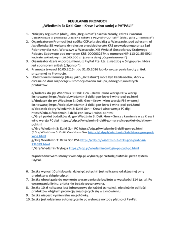 REGULAMIN PROMOCJI „Wiedźmin 3: Dziki Gon - Krew i wino taniej z PAYPAL!” 1. Niniejszy regulamin (dalej, jako „Regulamin”) określa zasady, zakres i warunki uczestnictwa w promocji „Szalone rabaty z PayPal w CDP.pl!” (dalej, jako „Promocja”) 2. Organizatorem Promocji jest spółka CDP.pl z siedzibą w Warszawie, pod adresem: ul Jagiellońska 88, wpisaną do rejestru przedsiębiorców KRS prowadzonego przez Sąd Rejonowy dla m.st. Warszawy w Warszawie, XIII Wydział Gospodarczy Krajowego Rejestru Sądowego pod numerem KRS: 0000032579, o numerze NIP 113-21-85-592 i kapitale zakładowym 10.075.500 zł (zwana dalej „Organizatorem”) 3. Organizator działa w porozumieniu z PayPal Pte. Ltd. z siedzibą w Singapurze, która jest sponsorem zniżek („Sponsor”). 4. Promocja trwa od 10.05.2015 r. do 31.05.2016 lub do wyczerpania kwoty zniżek przyznanej na Promocję. 5. Uczestnikiem Promocji (dalej, jako „Uczestnik”) może być każda osoba, która w okresie od dnia rozpoczęcia Promocji dokona zakupu jednego z poniższych produktów: a/dodatek do gry Wiedźmin 3: Dziki Gon – Krew i wino wersja PC w wersji limitowanej https://cdp.pl/wiedzmin-3-dziki-gon-krew-i-wino-pud-pc.html b/ dodatek do gry Wiedźmin 3: Dziki Gon – Krew i wino wersja PS4 w wersji limitowanej https://cdp.pl/wiedzmin-3-dziki-gon-krew-i-wino-pud-ps4.html c/ dodatek do gry Wiedźmin 3: Dziki Gon – Krew i wino wersja PC digi https://cdp.pl/wiedzmin-3-dziki-gon-krew-i-wino-pc.html d/ Grę i pakiet dodatków do gry Wiedźmin 3: Dziki Gon – Serca z kamienia oraz Krew i wino wersja PC digi https://cdp.pl/wiedzmin-3-dziki-gon-gra-plus-pakiet-dodatkowpc.html e/ Grę Wiedźmin 3: Dziki Gon PC https://cdp.pl/wiedzmin-3-dziki-gon-pc.html f/ Grę Wiedźmin 3: Dziki Gon Xbox One https://cdp.pl/wiedzmin-3-dziki-ree-gon-pudxone.html g/ Grę Wiedźmin 3: Dziki Gon PS4 https://cdp.pl/wiedzmin-3-dziki-gon-pud-ps4274689.html h/ Grę Wiedźmin Trylogia https://cdp.pl/wiedzmin-trylogia-pc-pud-pc.html za pośrednictwem strony www.cdp.pl, wybierając metodę płatności przez system PayPal. 6. Zniżka wynosi 10 zł (słownie: dziesięć złotych) i jest naliczana od aktualnej ceny produktu w sklepie cdp.pl. 7. Zniżka obowiązuje do momentu wyczerpania się budżetu w wysokości 114 tys. zł. Po wyczerpaniu limitu, zniżka nie będzie przyznawana. 8. Zniżka 10 zł naliczana jest jednorazowo do każdej transakcji, niezależnie od ilości produktów objętych promocją znajdujących się w zamówieniu. 9. Zniżka nie jest wymienialna na gotówkę. 10. Zniżka jest udzielana automatycznie po wyborze metody płatności PayPal. 11. Upoważnieniem do skorzystania ze zniżki jest dokonanie płatności za transakcję przez system PayPal. 12. Zamówienia nieopłacone zostaną anulowane w ciągu 24 godzin od ich złożenia. 13. Wszelkie reklamacje dotyczące transakcji zawartych w ramach Promocji rozpatrywane będą na zasadach opisanych w Regulaminie świadczenia usług drogą elektroniczną przez CDP.pl 14. W kwestiach nieuregulowanych niniejszym Regulaminem stosuje się przepisy prawa polskiego. 15. Wszelkie spory i roszczenia związane z Promocją będą rozstrzygane przez właściwe sądy powszechne. 16. Biorąc udział w Promocji, Uczestnik potwierdza, że wyraża zgodę na związanie postanowieniami Regulaminu.