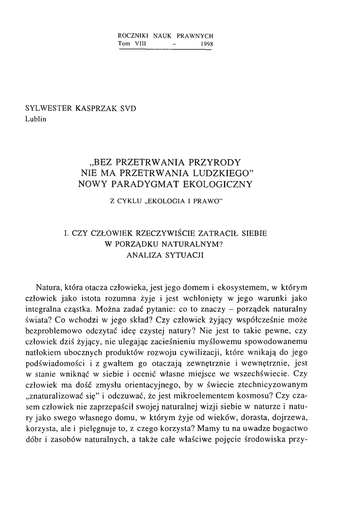 „BEZ P R Z E T R W A N IA P R Z Y R O D Y N IE M A P R Z E T R W A N IA L U D Z K IE G O ” N O W Y PA R A D Y G M A T E K O L O G IC Z N Y Z C Y K LU „EKOLOGIA I P R A W O ” I. C Z Y C Z Ł O W IE K R Z E C Z Y W IŚ C I E Z A T R A C I Ł S I E B IE W PORZĄDKU NA TU R A LN Y M ? A N A L IZ A S Y T U A C JI Natura, która otacza człowieka, jest je g o dom em i ekosystem em , w którym człowiek jak o istota rozum na żyje i je s t wchłonięty w je g o warunki jako integralna cząstka. M ożna zadać pytanie: co to znaczy - porządek naturalny świata? Co wchodzi w jeg o skład? Czy człow iek żyjący w spółcześnie m oże bezproblem owo odczytać ideę czystej natury? Nie jest to takie pew ne, czy człowiek dziś żyjący, nie ulegając zacieśnieniu m yślow em u spow od ow anem u natłokiem ubocznych produktów rozwoju cywilizacji, które w nikają do jeg o podświadomości i z gwałtem go otaczają zew nętrznie i w ew nętrznie, jest w stanie wniknąć w siebie i ocenić własne miejsce we w szechśw iecie. Czy człowiek m a dość zmysłu orientacyjnego, by w świecie ztechnicyzow anym „znaturalizować się” i odczuwać, że jest m ik roelem entem kosm o su? Czy cza sem człowiek nie zaprzepaścił swojej naturalnej wizji siebie w naturze i n a tu ry jako swego własnego domu, w którym żyje od wieków , dorasta, dojrzewa, korzysta, ale i pielęgnuje to, z czego korzysta? M am y tu na uw a d ze bogactw o dóbr i zasobów naturalnych, a także całe właściwe pojęcie środow iska przy- „BEZ P R Z E T R W A N IA P R Z Y R O D Y N IE M A P R Z E T R W A N IA L U D Z K IE G O ” N O W Y P A R A D Y G M A T E K O L O G IC Z N Y Z CY KLU „EKOLOGIA I P R A W O ” I. C Z Y C Z Ł O W IE K R Z E C Z Y W I Ś C I E Z A T R A C I Ł S I E B IE W PORZĄDKU N A TURA LNYM ? A N A L IZ A S Y T U A C JI Natura, która otacza człowieka, jest je g o dom em i ekosystem em , w którym człowiek jak o istota rozum na żyje i jest wchłonięty w je g o warunki jak o integralna cząstka. M ożna zadać pytanie: co to znaczy - p orządek naturalny świata? Co wchodzi w jego skład? Czy człow iek żyjący w spółcześnie m oże bezproblem owo odczytać ideę czystej natury? Nie jest to takie pew ne, czy człowiek dziś żyjący, nie ulegając zacieśnieniu m yślow em u spow odo w an em u natłokiem ubocznych produktów rozwoju cywilizacji, które w nikają do jego podświadomości i z gwałtem go otaczają zewnętrznie i w ew nętrznie, jest w stanie wniknąć w siebie i ocenić własne miejsce we w szechśw iecie. Czy człowiek m a dość zmysłu orientacyjnego, by w świecie ztechn icy zow any m „znaturalizować się” i odczuwać, że jest m ik roelem entem kosm osu? Czy cza sem człowiek nie zaprzepaścił swojej naturalnej wizji siebie w naturze i n a tu ry jak o swego własnego domu, w którym żyje od wieków , dorasta, dojrzewa, korzysta, ale i pielęgnuje to, z czego korzysta? M am y tu na uw adze bogactw o dóbr i zasobów naturalnych, a także całe w łaściw e pojęcie środow iska przy- „BEZ P R Z E T R W A N IA P R Z Y R O D Y N IE M A P R Z E T R W A N IA L U D Z K IE G O ” N O W Y P A R A D Y G M A T E K O L O G IC Z N Y Z CYKLU „EKOLOGIA I P R A W O ” I. C Z Y C Z Ł O W IE K R Z E C Z Y W IŚ C I E Z A T R A C I Ł S I E B I E W PORZĄDKU NA TU R A LN Y M ? A N A L IZ A S Y T U A C JI Natura, która otacza człowieka, jest je g o dom em i ekosystem em , w którym człowiek jak o istota rozum na żyje i je s t wchłonięty w je g o warunki jak o integralna cząstka. M ożna zadać pytanie: co to znaczy - po rządek naturalny świata? Co wchodzi w jego skład? Czy człow iek żyjący w spółcześnie m oże bezproblem owo odczytać ideę czystej natury? Nie jest to takie pew ne, czy człowiek dziś żyjący, nie ulegając zacieśnieniu m yślow em u spow odo w an em u natłokiem ubocznych produktów rozwoju cywilizacji, które w nikają do jeg o podświadomości i z gwałtem go otaczają zewnętrznie i w ew nętrznie, jest w stanie wniknąć w siebie i ocenić własne m iejsce we w szechśw iecie. Czy człowiek ma dość zmysłu orientacyjnego, by w świecie ztechnicyzow anym „znaturalizować się” i odczuwać, że jest m ik roelem entem kosm osu? Czy c z a sem człowiek nie zaprzepaścił swojej naturalnej wizji siebie w naturze i n atu ry jako swego własnego domu, w którym żyje od wieków , dorasta, dojrzewa, korzysta, ale i pielęgnuje to, z czego korzysta? M am y tu na uw adze bogactw o dóbr i zasobów naturalnych, a także całe w łaściw e pojęcie środow iska p rz y ro d n ic z e g o 1. C złow iek od zarania dziejów zdany był na praw idłow e obcow a nie i współżycie z otaczającym go środow iskiem naturalnym i biologicznym. P rzykładem są ludy pierwotne. Trudno dziś wyciągnąć trafną diagnozę na temat, czy człow iek bardziej czuje się cząstką kosmosu, biosfery2 czy - ina czej - eko system u3, czy m oże jego właścicielem i niepoham ow anym eksploa tatorem, czy wręcz niszczycielem i krótkow zrocznym użytkow nikiem . G dy byśm y chcieli choć trochę ocenić w spółczesnego człowieka, to powiem y, że proces jeg o rozwoju trwa, ale m ożna zapytać, czy człowiek potrzebuje dziś dalszego rozwoju. Co więcej - jakiego rozwoju? M yślim y tu oczywiście o krajach wysoko rozwiniętych i uprzem ysłow ionych. Czy dalej m ogą się rozw ijać? Oczywiście, ale nie za cenę katastrofy ekologicznej, która we w spółczesnym świecie jest bardzo wyrazista, a norm alnie myślący człowiek je s t na to dość uwrażliwiony. Rodzi się kolejne pytanie: czy rozwój ludzkości w tak szeroko zorganizowanej ekspansji nosi w sobie znam iona rozwoju naturalnego, czy niestety rozwoju przem ysłow ego i gospodarczego nastaw io nego na zysk? Jeśli ktoś myśli o rozwoju naturalnym, to zakłada poszanowanie otaczają cego świata natury i przyrody, całej biosfery, flory, fauny, wody i powietrza. C zysta natura oddycha jej e
