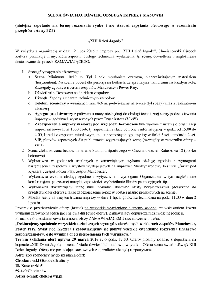 SCENA, ŚWIATŁO, DŹWIĘK, OBSŁUGA IMPREZY MASOWEJ (niniejsze zapytanie ma formę rozeznania rynku i nie stanowi zapytania ofertowego w rozumieniu przepisów ustawy PZP) „XIII Dzień Jagody” W związku z organizacją w dniu 2 lipca 2016 r. imprezy pn. „XIII Dzień Jagody”, Chocianowski Ośrodek Kultury poszukuje firmy, która zapewni obsługę techniczną wydarzenia, tj. scenę, oświetlenie i nagłośnienie dostosowane do potrzeb ZAMAWIAJĄCEGO. 1. Szczegóły zapytania ofertowego: a. Scena. Minimum 10x12 m. Tył i boki wysłonięte czarnym, nieprześwitującym materiałem (horyzontem). Na scenie podest dla perkusji na kółkach, ze sprawnymi hamulcami na każdym kole. Szczegóły zgodne z riderami zespołów Manchester i Power Play. b. Oświetlenie. Dostosowane do rideru zespołów c. Dźwięk. Zgodny z riderem technicznym zespołów d. Telebim sceniczny o wymiarach min. 4x6 m. podwieszany na scenie (tył sceny) wraz z realizatorem z kamerą e. Agregat prądotwórczy z paliwem o mocy niezbędnej do obsługi technicznej sceny podczas trwania imprezy w godzinach wyznaczonych przez Organizatora (80kW) f. Zabezpieczenie imprezy masowej pod względem bezpieczeństwa zgodnie z ustawą o organizacji imprez masowych, na 1000 osób, tj. zapewnienie służb ochrony i informacyjnej w godz. od 15:00 do 4:00, karetki z zespołem ratunkowym, toalet przenośnych typu toy toy w ilości 5 szt. standard i 2 szt. VIP, płotków zaporowych dla publiczności wygradzających scenę (szczegóły w załączniku oferty – zał.1) 2. Scena zlokalizowana będzie, na terenie Stadionu Sportowego w Chocianowie, ul. Ratuszowa 18 (boisko betonowe) 3. Wykonawca w godzinach ustalonych z zamawiającym wykona obsługę zgodnie z wymogami następujących zespołów i artystów występujących na imprezie: Międzynarodowy Festiwal „Świat pod Kyczerą”, zespół Power Play, zespół Manchester, 4. Wykonawca wykona obsługę zgodnie z wytycznymi i wymogami Organizatora, w tym nagłośnienie konferansjera, puszczanej muzyki, zapowiedzi, wyświetlanie filmów promocyjnych, itp. 5. Wykonawca dostarczający scenę musi posiadać stosowne atesty bezpieczeństwa (dołączone do przedstawionej oferty) a także zabezpieczenie p-poż w postaci gaśnic proszkowych na scenie. 6. Montaż sceny na miejscu trwania imprezy w dniu 1 lipca, gotowość techniczna na godz. 11:00 w dniu 2 lipca br. Prosimy o przedstawienie oferty (brutto) na wszystkie wymienione elementy osobno, ze wskazaniem kosztu wynajmu zarówno na jeden jak i na dwa dni (dwie oferty). Zamawiający dopuszcza możliwość negocjacji. Firma, z którą zostanie zawarta umowa, złoży ZAMAWIAJĄCEMU oświadczenie o treści: „Deklarujemy spełnienie wszystkich technicznych wymogów określonych w riderach zespołów Manchester, Power Play, Świat Pod Kyczerą i zobowiązujemy się pokryć wszelkie ewentualne roszczenia finansowe zespołu/zespołów, o ile wynikną one z niespełnienia tych warunków." Termin składania ofert upływa 29 marca 2016 r. o godz. 12:00. Oferty prosimy składać z dopiskiem na kopercie „XIII Dzień Jagody – scena, światło dźwięk" lub mailowo, w tytule – Oferta scena-światło-dźwięk XIII Dzień Jagody. Oferty nie posiadające stosownych załączników nie będą rozpatrywane. Adres korespondencyjny do składania ofert: Chocianowski Ośrodek Kultury Ul. Kościuszki 5 59-140 Chocianów Adres e-mail: [email protected]. Zał. 1 Ochrona, zabezpieczenie medyczne. 1.Zakres prac obejmuje usługę: zapewnienie ochrony imprezy masowej „XIII Dzień Jagody” oraz zabezpieczenia medycznego (zgodnie z Ustawą o bezpieczeństwie imprez masowych oraz Rozporządzeniem Rady Ministrów z dnia 23 marca 2010 r. w sprawie wymogów, jakie powinni spełniać kierownik do spraw bezpieczeństwa, służby porządkowe, służby informacyjne organizatora imprezy masowej w zakresie wyszkolenia i wyposażenia oraz szczegółowych warunków i sposobów ich działania) organizowanej przez Chocianowski Ośrodek Kultury. 2.Wykonawca winien przedłożyć następujące dokumenty: - koncesję na wykonywanie działalności gospodarczej w zakresie przedmiotowej usługi. - polisę ubezpieczeniową dotyczącą ubezpieczenia odpowiedzialności cywilnej. - aktualny odpis z właściwego rejestru albo aktualne zaświadczenie o wpisie do ewidencji działalności gospodarczej, jeżeli odrębne przepisy wymagają wpisu do rejestru lub zgłoszenia do ewidencji działalności gospodarczej, wystawiony nie wcześniej niż 6 miesięcy przed upływem terminu składania ofert. W przypadku Wykonawcy działającego w ramach spółki cywilnej do oferty należy dołączyć umowę spółki. - wykaz, co najmniej dwóch usług wykonanych w okresie ostatnich trzech lat odpowiadających swoim rodzajem usługom stanowiącym przedmiot zamówienia, z podaniem ich wartości, przedmiotu, dat wykonania i odbiorców oraz załączenie dokumentów potwierdzających, że w/w usługi zostały wykonane należycie - wykaz osób, które będą uczestniczyć w wykonywaniu zamówienia posiadających uprawnienia kierownika ds. bezpieczeństwa imprez masowych, o których mowa w Rozporządzeniu Rady Ministrów z dnia 23 marca 2010 r. w sprawie wymogów, jakie powinni spełniać kierownik do spraw bezpieczeństwa, służby porządkowe i służby informacyjne wraz z informacjami na temat zakresu wykonywanych przez nie czynności wraz z licencją kierownika ochrony. Niniejsze załączniki należy złożyć wraz z ofertą. Niekompletna oferta nie będzie rozpatrywana. Termin składania ofert – jak w ofercie.