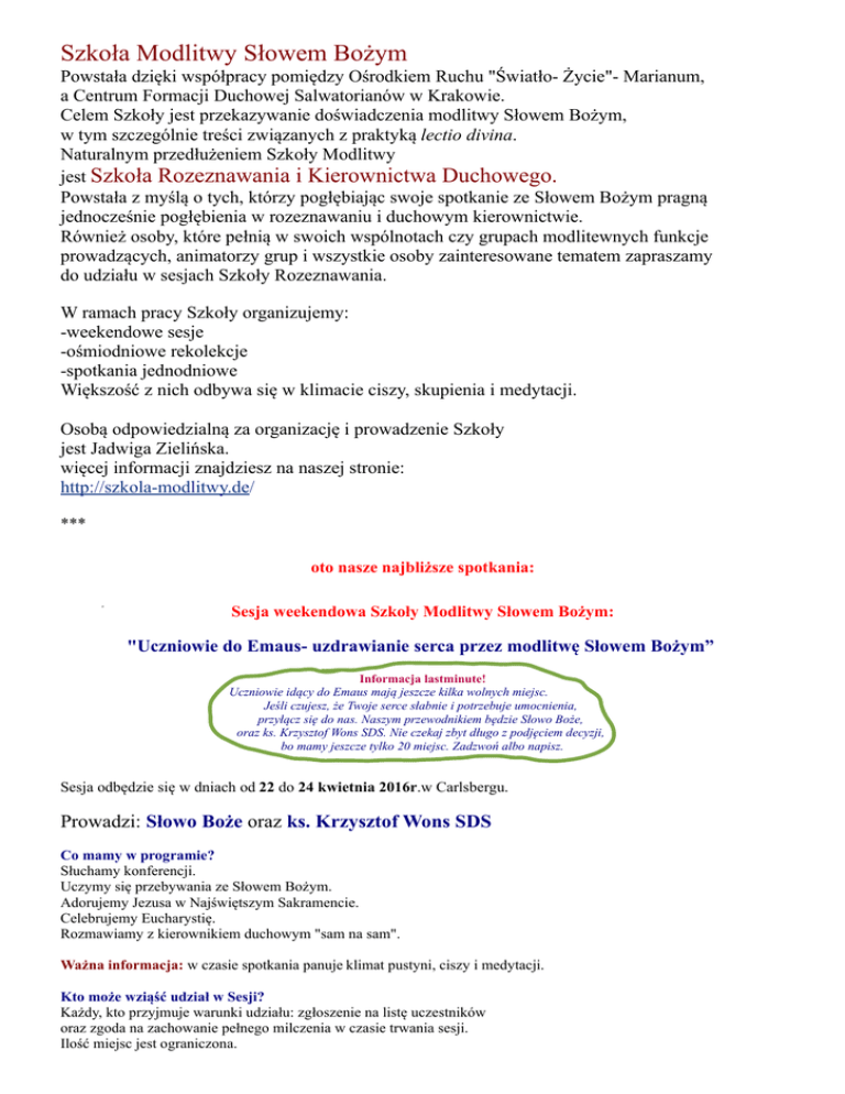 Szkoła Modlitwy Słowem Bożym Powstała dzięki współpracy pomiędzy Ośrodkiem Ruchu "Światło- Życie"- Marianum, a Centrum Formacji Duchowej Salwatorianów w Krakowie. Celem Szkoły jest przekazywanie doświadczenia modlitwy Słowem Bożym, w tym szczególnie treści związanych z praktyką lectio divina. Naturalnym przedłużeniem Szkoły Modlitwy jest Szkoła Rozeznawania i Kierownictwa Duchowego. Powstała z myślą o tych, którzy pogłębiając swoje spotkanie ze Słowem Bożym pragną jednocześnie pogłębienia w rozeznawaniu i duchowym kierownictwie. Również osoby, które pełnią w swoich wspólnotach czy grupach modlitewnych funkcje prowadzących, animatorzy grup i wszystkie osoby zainteresowane tematem zapraszamy do udziału w sesjach Szkoły Rozeznawania. W ramach pracy Szkoły organizujemy: -weekendowe sesje -ośmiodniowe rekolekcje -spotkania jednodniowe Większość z nich odbywa się w klimacie ciszy, skupienia i medytacji. Osobą odpowiedzialną za organizację i prowadzenie Szkoły jest Jadwiga Zielińska. więcej informacji znajdziesz na naszej stronie: http://szkola-modlitwy.de/ *** oto nasze najbliższe spotkania: Sesja weekendowa Szkoły Modlitwy Słowem Bożym: "Uczniowie do Emaus- uzdrawianie serca przez modlitwę Słowem Bożym” Informacja lastminute! Uczniowie idący do Emaus mają jeszcze kilka wolnych miejsc. Jeśli czujesz, że Twoje serce słabnie i potrzebuje umocnienia, przyłącz się do nas. Naszym przewodnikiem będzie Słowo Boże, oraz ks. Krzysztof Wons SDS. Nie czekaj zbyt długo z podjęciem decyzji, bo mamy jeszcze tylko 20 miejsc. Zadzwoń albo napisz. Sesja odbędzie się w dniach od 22 do 24 kwietnia 2016r.w Carlsbergu. Prowadzi: Słowo Boże oraz ks. Krzysztof Wons SDS Co mamy w programie? Słuchamy konferencji. Uczymy się przebywania ze Słowem Bożym. Adorujemy Jezusa w Najświętszym Sakramencie. Celebrujemy Eucharystię. Rozmawiamy z kierownikiem duchowym "sam na sam". Ważna informacja: w czasie spotkania panuje klimat pustyni, ciszy i medytacji. Kto może wziąść udział w Sesji? Każdy, kto przyjmuje warunki udziału: zgłoszenie na listę uczestników oraz zgoda na zachowanie pełnego milczenia w czasie trwania sesji. Ilość miejsc jest ograniczona. Rozpoczynamy w piątek 22 kwietnia Eucharystią o godz.18.00 Kończymy w niedzielę 24 kwietnia obiadem o godz.13.00 Opłata- 85€. ( obejmuje noclegi, posiłki, opłatę za sesję) Jeśli jesteś osobą dochodzącą, opłata wynosi 35€. Chcesz się zgłosić? Masz dodatkowe pytania? Napisz lub zadzwoń: Jadwiga Zielińska Tel.069- 66575895 lub kom. 01636787228 mail: [email protected] Sesja weekendowa Szkoły Rozeznawania i Kierownictwa Duchowego: "Kierownictwo duchowe a uczucia niekochane." wstyd pustka.. lęk.... …... zazdrość... Sesja odbędzie się w dniach od 10 do 12 czerwca 2016r. w Carlsbergu. Zazdrość, wstyd, pustka, obcość, niespełnione zakochanie, lęk, agresja.... takich uczuć nie kochamy. Chcielibyśmy się ich pozbyć. Ich pojawianie się przynosi niepokój, obawy. Jak sobie z nimi radzić? Jak pomagać innym w twórczym przeżywaniu niekochanych uczuć? Prowadzi: ks. Krzysztof Grzywocz Co mamy w programie? Słuchamy konferencji. Słuchamy siebie wzajemnie. Adorujemy Jezusa w Najświętszym Sakramencie. Celebrujemy Eucharystię. Rozmawiamy z kierownikiem duchowym "sam na sam". Ważna informacja: w czasie spotkania panuje klimat wyciszenia, i wzajemnego słuchania. Kto może wziąść udział w Sesji? Każdy, kto zgłosi się na listę uczestników. Ilość miejsc jest ograniczona. Rozpoczynamy w piątek 10 czerwca Eucharystią o godz.18.00 Kończymy w niedzielę 12 czerwca obiadem o godz. 13.00 Opłata- 85€. ( obejmuje noclegi, posiłki, opłatę za sesję) Jeśli jesteś osobą dochodzącą, opłata wynosi 35€. Chcesz się zgłosić? Masz dodatkowe pytania? Napisz lub zadzwoń: Jadwiga Zielińska Tel.069- 66575895 lub kom. 01636787228 mail: [email protected] ***