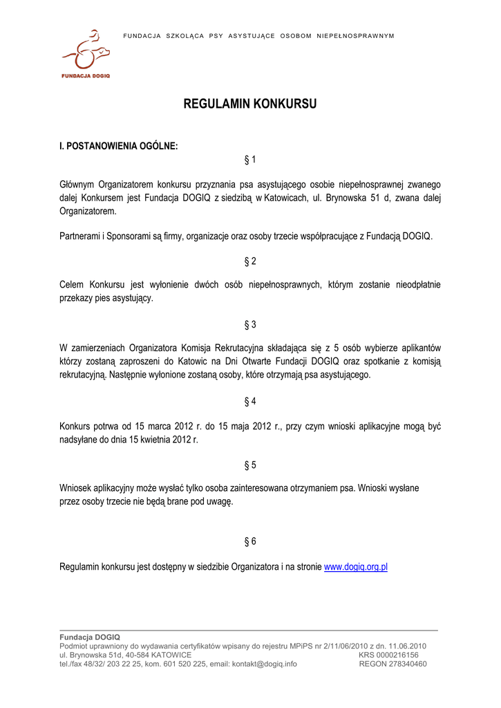 FUNDACJA SZKOLĄCA PSY ASYSTUJĄCE OS OB OM N IE PEŁNOSPR AW NYM REGULAMIN KONKURSU I. POSTANOWIENIA OGÓLNE: §1 Głównym Organizatorem konkursu przyznania psa asystującego osobie niepełnosprawnej zwanego dalej Konkursem jest Fundacja DOGIQ z siedzibą w Katowicach, ul. Brynowska 51 d, zwana dalej Organizatorem. Partnerami i Sponsorami są firmy, organizacje oraz osoby trzecie współpracujące z Fundacją DOGIQ. §2 Celem Konkursu jest wyłonienie dwóch osób niepełnosprawnych, którym zostanie nieodpłatnie przekazy pies asystujący. §3 W zamierzeniach Organizatora Komisja Rekrutacyjna składająca się z 5 osób wybierze aplikantów którzy zostaną zaproszeni do Katowic na Dni Otwarte Fundacji DOGIQ oraz spotkanie z komisją rekrutacyjną. Następnie wyłonione zostaną osoby, które otrzymają psa asystującego. §4 Konkurs potrwa od 15 marca 2012 r. do 15 maja 2012 r., przy czym wnioski aplikacyjne mogą być nadsyłane do dnia 15 kwietnia 2012 r. §5 Wniosek aplikacyjny może wysłać tylko osoba zainteresowana otrzymaniem psa. Wnioski wysłane przez osoby trzecie nie będą brane pod uwagę. §6 Regulamin konkursu jest dostępny w siedzibie Organizatora i na stronie www.dogiq.org.pl Fundacja DOGIQ Podmiot uprawniony do wydawania certyfikatów wpisany do rejestru MPiPS nr 2/11/06/2010 z dn. 11.06.2010 ul. Brynowska 51d, 40-584 KATOWICE KRS 0000216156 tel./fax 48/32/ 203 22 25, kom. 601 520 225, email: [email protected] REGON 278340460 FUNDACJA SZKOLĄCA PSY ASYSTUJĄCE OS OB OM N IE PEŁNOSPR AW NYM II. UCZESTNICY KONKURSU: §7 1. Uczestnikami konkursu mogą być osoby niepełnosprawne z dysfunkcją ruchu, słuchu, wzroku lub cierpiące na choroby przewlekłe (epilepsja, cukrzyca). 2. Osoby aplikujące muszą spełniać wszystkie poniższe kryteria: posiadają określoną grupę inwalidzką, są pełnoletnie, są aktywne: uczą się, studiują, pracuje zawodowo lub społecznie, nie cierpią na chorobę postępującą, mają sprawne ręce, mają warunki mieszkaniowe i finansowe, by utrzymać psa. 3. Uczestnikami konkursu nie mogą być osoby niepełnosprawne intelektualnie. III. ZASADY UCZESTNICTWA W KONKURSIE: §8 Uczestnicy wypełniają wniosek o przyznanie psa asystującego zamieszczony na stronie internetowej www.dogiq.org.pl. Wniosek musi zostać złożony przez osobę zainteresowaną otrzymaniem psa. §9 Konkurs rozpoczyna się 15 marca 2012 r., a kończy 15 maja 2012 r. § 10 Konkurs składa się z trzech etapów: Etap I Przyjmowanie wniosków o przyznanie psa asystującego drogą elektroniczną. Czas trwania: 15 marca 2012 r. do 15 kwietnia 2012 r. Etap II Rozpatrywanie wniosków przez specjalnie powołaną komisję składająca się z lekarza, psychologa, instruktora szkolenia psów asystujących, przedstawiciela sponsora, Zarządu Fundacji DOGIQ. Fundacja DOGIQ Podmiot uprawniony do wydawania certyfikatów wpisany do rejestru MPiPS nr 2/11/06/2010 z dn. 11.06.2010 ul. Brynowska 51d, 40-584 KATOWICE KRS 0000216156 tel./fax 48/32/ 203 22 25, kom. 601 520 225, email: [email protected] REGON 278340460 FUNDACJA SZKOLĄCA PSY ASYSTUJĄCE OS OB OM N IE PEŁNOSPR AW NYM Czas trwania 16 kwietnia 2012 r. – 26 kwietnia 2012 r. Wyniki Etapu II ogłoszone zostaną na stronie internetowej www.dogiq.info w dniu 30.04.2012 r. Etap III Finaliści zostają zaproszeni do Katowic na Dni Otwarte Fundacji DOGIQ, gdzie odbędą się warsztaty z zakresu współpracy z psem asystującym oraz spotkanie z komisją rekrutacyjną. Koszty logistyczne pokrywa Uczestnik Konkursu. Ogłoszenie wyników III Etapu odbędzie się 15 maja 2012 r. na stronie internetowej www.dogiq.org.pl Zwycięzcy zostaną poinformowani telefonicznie. IV. ZASADY UCZESTNICTWA W KONKURSIE: § 11 1. Wnioski aplikacyjne przyjmowane będą w formie elektronicznej, za pośrednictwem opublikowanego na stronie www.dogiq.org.pl wniosku o przyznanie psa asystującego. 2. Ostateczny termin przesyłania wniosków upływa dnia 15 kwietnia 2012 r 3. Organizatorzy nie ponoszą odpowiedzialności za uszkodzenia powstałe podczas dostarczania danych. 4. Przesłane dokumenty przechodzą na własność Organizatora i nie będą zwracane. V. ZASADY PRZYZNAWANIA PSA ASYSTUJĄCEGO: § 12 1. Psy asystujące zostaną przekazane osobom niepełnosprawnym nieodpłatnie. 2. Psy zostaną przekazane po odbyciu wraz z osobą aplikującą tygodniowego Kursu Adaptacyjnego, który odbędzie się w Katowicach w terminie wskazanym przez Organizatora. Koszty logistyczne i kwaterunkowe kursu pokrywa osoba aplikująca. 3. Do momentu przekazania psa osoba aplikująca jest zobowiązana do uczestnictwa w sesjach treningowych z psem co najmniej 1 raz w miesiącu. 4. Psy asystujące zostaną przekazane po podpisaniu umów regulujących dalszą współpracę osób aplikującej i Fundacji DOGIQ. 5. Psy asystujące zostaną przekazane Zwycięzcom konkursu najpóźniej do końca roku 2012. Fundacja DOGIQ Podmiot uprawniony do wydawania certyfikatów wpisany do rejestru MPiPS nr 2/11/06/2010 z dn. 11.06.2010 ul. Brynowska 51d, 40-584 KATOWICE KRS 0000216156 tel./fax 48/32/ 203 22 25, kom. 601 520 225, email: [email protected] REGON 278340460 FUNDACJA SZKOLĄCA PSY ASYSTUJĄCE OS OB OM N IE PEŁNOSPR AW NYM VI. POSTANOWIENIA KOŃCOWE: § 13 1. Wszelkie pytania dotyczące Konkursu należy kierować na adres biura Organizatora Fundacji DOGIQ ul. Brynowska 51 d, 40 - 584 Katowice. Szczegółowe informacje o konkursie można uzyskać pod numerami telefonu 32 203 22 25 lub za pośrednictwem poczty elektronicznej [email protected] 2. Wzięcie udziału w Konkursie jest jednoznaczne z pełną akceptacją niniejszego regulaminu. 3. Uczestnictwo w konkursie zobowiązuje do przestrzegania regulaminu Konkursu. Regulamin jest do wglądu w siedzibie Organizatora, czynnym od poniedziałku do piątku w godz. 8.00 - 16.00 oraz na stronie internetowej: www.dogiq.org.pl § 14 1. Regulamin niniejszy jest jedynym dokumentem określającym zasady Konkursu. 2. Organizator zastrzega sobie