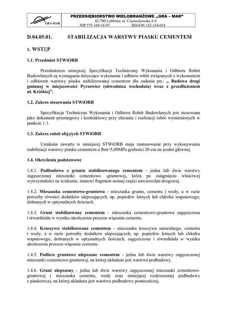 GRA-MAR D.04.05.01. PRZEDSIĘBIORSTWO WIELOBRANŻOWE ,,GRA – MAR” 42-700 Lubliniec ul. Częstochowska 6/4 NIP 575-169-16-97 REGON 152-154-018 STABILIZACJA WARSTWY PIASKU CEMENTEM 1. WSTĘP 1.1. Przedmiot STWiORB Przedmiotem niniejszej Specyfikacji Technicznej Wykonania i Odbioru Robót Budowlanych są wymagania dotyczące wykonania i odbioru robót związanych z wykonaniem i odbiorem warstwy piasku stabilizowanej cementem dla zadania pn.: ,, Budowa drogi gminnej w miejscowości Pyrzowice (obwodnica wschodnia) wraz z przedłużeniem ul. Krótkiej”. 1.2. Zakres stosowania STWiORB Specyfikacja Techniczna Wykonania i Odbioru Robót Budowlanych jest stosowana jako dokument przetargowy i kontraktowy przy zlecaniu i realizacji robót wymienionych w punkcie 1.1. 1.3. Zakres robót objętych STWiORB Ustalenia zawarte w niniejszej STWiORB maja zastosowanie przy wykonywaniu stabilizacji warstwy piasku cementem o Rm=5,00MPa grubości 20 cm na jezdni głównej. 1.4. Określenia podstawowe 1.4.1. Podbudowa z gruntu stabilizowanego cementem - jedna lub dwie warstwy zagęszczonej mieszanki cementowo -gruntowej, która po osiągnięciu właściwej wytrzymałości na ściskanie, stanowi fragment nośnej części nawierzchni drogowej. 1.4.2. Mieszanka cementowo-gruntowa - mieszanka gruntu, cementu i wody, a w razie potrzeby również dodatków ulepszających, np. popiołów lotnych lub chlorku wapniowego, dobranych w optymalnych ilościach. 1.4.3. Grunt stabilizowany cementem - mieszanka cementowo-gruntowa zagęszczona i stwardniała w wyniku ukończenia procesu wiązania cementu. 1.4.4. Kruszywo stabilizowane cementem - mieszanka kruszywa naturalnego, cementu i wody, a w razie potrzeby dodatków ulepszających, np. popiołów lotnych lub chlorku wapniowego, dobranych w optymalnych ilościach, zagęszczona i stwardniała w wyniku ukończenia procesu wiązania cementu. 1.4.5. Podłoże gruntowe ulepszone cementem - jedna lub dwie warstwy zagęszczonej mieszanki cementowo-gruntowej, na której układana jest warstwa podbudowy. 1.4.6. Grunt ulepszony - jedna lub dwie warstwy zagęszczonej mieszanki cementowogruntowej ( mieszanka cementu, wody oraz istniejącej rozkruszonej podbudowy z piaskowca), na której układana jest warstwa podbudowy pomocniczej. GRA-MAR PRZEDSIĘBIORSTWO WIELOBRANŻOWE ,,GRA – MAR” 42-700 Lubliniec ul. Częstochowska 6/4 NIP 575-169-16-97 REGON 152-154-018 1.4.7. Pozostałe określenia podane w niniejszym STWiORB są zgodne z obowiązującymi Polskimi normami i określania podanymi w STWiORB D-M-00.00.00 „ Wymagania Ogólne” 1.5. Ogólne wymagania dotyczące robót Wykonawca jest odpowiedzialny za jakość wykonania robót i ich zgodność z dokumentacja projektowa, STWiORB i poleceniami Inżyniera. Ogólne wymagania dotyczące robót podano w STWiORB D-M. 00.00.00 „Wymagania Ogólne”. 2. MATERIAŁY 2.1. Ogólne wymagania dotyczące materiałów Wszystkie materiały użyte do budowy powinny pochodzić tylko ze źródeł uzgodnionych i zatwierdzonych przez Inżyniera. Do każdej ilości jednorazowo wysyłanego materiału dołączony powinien być dokument potwierdzający jego jakość na podstawie przeprowadzonych badań. 2.2. Cement Należy stosować cement portlandzki klasy 32,5 wg PN-B-19701, portlandzki z dodatkami wg PN-B-19701 lub hutniczy wg PN-B-19701. Wymagania dla cementu zestawiono w tablicy nr 1. Tablica nr 1. Właściwości mechaniczne i fizyczne cementu wg PN-B-19701 Lp. 1 2 3 4 Właściwości Wytrzymałość na ściskanie (MPa), po 7 dniach, nie mniej niż: - cement portlandzki bez dodatków - cement hutniczy - cement portlandzki z dodatkami Wytrzymałość na ściskanie (MPa), po 28 dniach, nie mniej niż: Czas wiązania: - początek wiązania, najwcześniej po upływie, min. - koniec wiązania, najpóźniej po upływie, h Stałość objętości, mm, nie więcej niż Klasa cementu 32,5 16 16 16 32,5 60 12 10 Badania cementu należy wykonać zgodnie z PN-B-04300. Przechowywanie cementu powinno odbywać się zgodnie z BN-88/6731-08. W przypadku, gdy czas przechowywania cementu będzie dłuższy od trzech miesięcy, można go stosować za zgoda Inżyniera tylko wtedy, gdy badania laboratoryjne wykażą jego przydatność do robót. GRA-MAR PRZEDSIĘBIORSTWO WIELOBRANŻOWE ,,GRA – MAR” 42-700 Lubliniec ul. Częstochowska 6/4 NIP 575-169-16-97 REGON 152-154-018 2.3. Grunty Przydatność gruntów przeznaczonych do stabilizacji cementem należy ocenić na podstawie wyników badań laboratoryjnych, wykonanych według metod podanych w PN-S-96012. Do wykonania ulepszonego podłoża z gruntów stabilizowanych cementem należy stosować grunty spełniające wymagania podane w tablicy nr 2. Grunt można uznać za przydatny do stabilizacji cementem wtedy, gdy wyniki badań laboratoryjnych wykażą, że wytrzymałość na ściskanie i mrozoodporność próbek gruntu stabilizowanego są zgodne z wymaganiami określonymi w p. 2.7 tablica nr 4. Tablica nr 2. Wymagania dla gruntów przeznaczonych do stabilizacji cementem wg PN-S-96012 Lp. Właściwości Uziarnienie ziarn przechodzących przez sito # 40 mm, % (m/m), nie mniej niż: ziarn przechodzących przez sito # 20 mm, 1 % (m/m), powyżej ziarn przechodzących przez sito # 4 mm, % (m/m), powyżej cząstek mniejszych od 0,002 mm, % (m/m), poniżej 2 Granica płynności, % (m/m), nie więcej niż: Wskaźnik plastyczności, % (m/m), nie więcej 3 niż: 4 Odczyn pH Zawartość części organicznych, % (m/m), nie 5 więcej niż: Zawartość siarczanów, w przeliczeniu na SO3, 6 % (m/m), nie więcej niż: Wymagania Badania według 100 85 PN-B-04481 50 20 40 PN-B-04481 15 PN-B-04481 Od 5 do 8 PN-B-04481 2 PN-B-04481 1 PN-B-06714-28 Grunty nie spełniające wymagań określonych w tablicy nr 2, mogą być poddane stabilizacji po uprzednim ulepszeniu chlorkiem wapniowym, wapnem, popiołami lotnymi. Grunty o granicy płynności od 40 do 60% i wskaźniku plastyczności od 15 do 30% mogą być stabilizowane cementem dla podbud