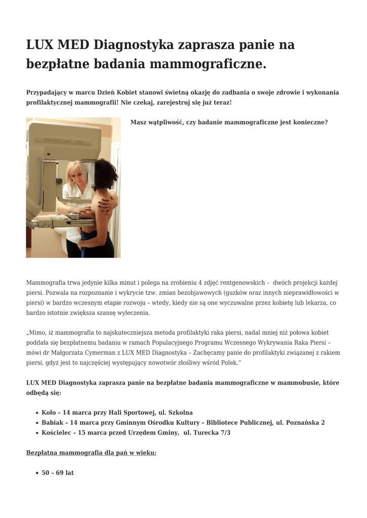 LUX MED Diagnostyka zaprasza panie na bezpłatne badania mammograficzne. Przypadający w marcu Dzień Kobiet stanowi świetną okazję do zadbania o swoje zdrowie i wykonania profilaktycznej mammografii! Nie czekaj, zarejestruj się już teraz! Masz wątpliwość, czy badanie mammograficzne jest konieczne? Mammografia trwa jedynie kilka minut i polega na zrobieniu 4 zdjęć rentgenowskich – dwóch projekcji każdej piersi. Pozwala na rozpoznanie i wykrycie tzw. zmian bezobjawowych (guzków oraz innych nieprawidłowości w piersi) w bardzo wczesnym etapie rozwoju – wtedy, kiedy nie są one wyczuwalne przez kobietę lub lekarza, co bardzo istotnie zwiększa szansę wyleczenia. „Mimo, iż mammografia to najskuteczniejsza metoda profilaktyki raka piersi, nadal mniej niż połowa kobiet poddała się bezpłatnemu badaniu w ramach Populacyjnego Programu Wczesnego Wykrywania Raka Piersi – mówi dr Małgorzata Cymerman z LUX MED Diagnostyka – Zachęcamy panie do profilaktyki związanej z rakiem piersi, gdyż jest to najczęściej występujący nowotwór złośliwy wśród Polek.” LUX MED Diagnostyka zaprasza panie na bezpłatne badania mammograficzne w mammobusie, które odbędą się: Koło – 14 marca przy Hali Sportowej, ul. Szkolna Babiak – 14 marca przy Gminnym Ośrodku Kultury – Bibliotece Publicznej, ul. Poznańska 2 Kościelec – 15 marca przed Urzędem Gminy, ul. Turecka 7/3 Bezpłatna mammografia dla pań w wieku: 50 – 69 lat Badanie w ramach Populacyjnego Programu Wczesnego Wykrywania Raka Piersi jest bezpłatne, refundowane kobietom co 2 lata przez Narodowy Fundusz Zdrowia (lub co 12 miesięcy dla kobiet, które w ramach realizacji Programu otrzymały odpowiednie pisemne wskazanie). Nie jest wymagane skierowanie lekarskie. 40 – 49 oraz 70 – 75 lat Badania wykonywane są w ramach Projektu „Poprawa dostępności i jakości usług medycznych w ramach Populacyjnego Programu Wczesnego Wykrywania Raka Piersi” współfinansowanego z funduszy EOG i Norweskiego Mechanizmu Finansowego. Wymagane jest skierowanie lekarskie od lekarza dowolnej specjalizacji. Więcej Informacji o badaniach oraz wzór skierowania na stronie: www.fundusze.mammo.pl Na badania w ramach obu programów prosimy o wcześniejszą rejestrację pod nr tel. 58 666 2 444. Call Center czynne jest 7 dni w tygodniu. Pozdrawiam serdecznie, Agata Jabłonowska Specjalista ds. Marketingu i PR LUX MED Diagnostyka, Region Mammografia, ul.Nocznickiego 8a 81-454 Gdynia m: 607 931 133 e: [email protected]