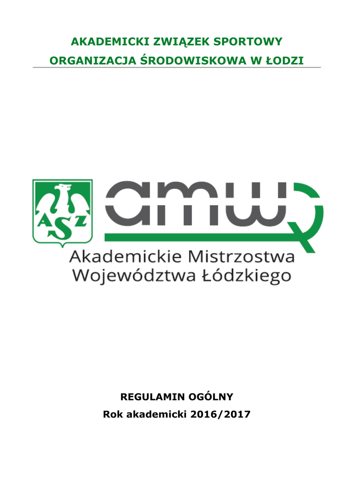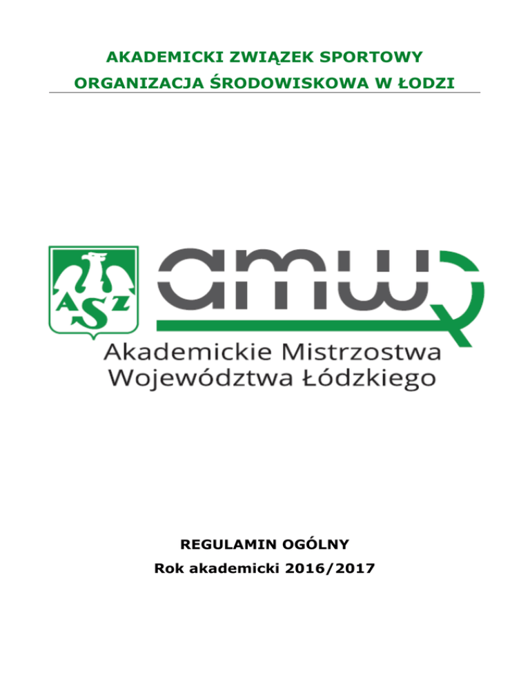 AKADEMICKI ZWIĄZEK SPORTOWY ORGANIZACJA ŚRODOWISKOWA W ŁODZI REGULAMIN OGÓLNY Rok akademicki 2016/2017 REGULAMIN OGÓLNY I. CEL Celem Akademickich Mistrzostw Województwa Łódzkiego (zwanymi dalej AMWŁ) jest: 1. przegląd pracy sportowo-wychowawczej i organizacyjnej Klubów Uczelnianych AZS oraz Studiów Wychowania Fizycznego i Sportu uczelni województwa łódzkiego; 2. sprawdzenie poziomu sportowego oraz wyłonienie Akademickiego Mistrza Województwa Łódzkiego w poszczególnych dyscyplinach oraz punktacji generalnej; 3. popularyzacja sportu wśród młodzieży akademickiej. 4. integracja młodzieży akademickiej poprzez sport. 5. wyłonienie półfinalistów Akademickich Mistrzostw Polski w dyscyplinach: futsal mężczyzn, koszykówka mężczyzn, piłka siatkowa kobiet, piłka siatkowa mężczyzn, piłka nożna mężczyzn, siatkówka plażowa kobiet, siatkówka plażowa mężczyzn. II. ORGANIZATOR Organizatorem AMWŁ jest Akademicki Związek Sportowy w Łodzi przy współudziale Klubów Uczelnianych AZS oraz Studiów Wychowania Fizycznego i Sportu uczelni województwa łódzkiego. Nad rozgrywkami kontrolę sprawuje Koordynator ds.UKF AZS Łódź. adres poczty elektronicznej: [email protected] strona internetowa: www.azs.lodz.pl III. PROGRAM 1. AMWŁ podzielone są na: a). Rozgrywki w dyscyplinach drużynowych, które są równocześnie eliminacjami do półfinałów Akademickich Mistrzostw Polski (zwane dalej Eliminacjami AMP): futsal mężczyzn, koszykówka mężczyzn, piłka siatkowa kobiet, piłka siatkowa mężczyzn, piłka nożna mężczyzn, siatkówka plażowa kobiet, siatkówka plażowa mężczyzn, b). Rozgrywki w pozostałych dyscyplinach: badminton K i M, biegi przełajowe K i M, brydż sportowy, ergometr wioślarski K i M, futsal K, judo K i M, kolarstwo górskie K i M, koszykówka K, lekka atletyka K i M, narciarstwo K i M, piłka ręczna K i M, pływanie K i M, squash K i M, snowboard K i M, szachy, tenis K i M, tenis stołowy K i M, trójbój siłowy K i M, wspinaczka sportowa K i M. dodatkowe dyscypliny w miarę możliwości jeździectwo, karate i inne. 2 rozegrania np. armwrestling, 2. 3. IV. Rozgrywki muszą zostać zakończone do dnia 30.06.2017 roku. Rozgrywki odbywają się według kalendarza, regulaminu ogólnego oraz regulaminów technicznych poszczególnych dyscyplin. SYSTEM ROZGRYWEK 1. 2. 3. V. System rozgrywek powinien być zgodny ze specyfiką dyscypliny i przepisami polskich związków sportowych. W grach zespołowych system rozgrywek zgodny jest z regulaminem technicznym danej dyscypliny i uzależniony jest od ilości zgłoszonych drużyn. Rozgrywki odbywają się jeżeli zgłoszą się co najmniej dwie drużyny z różnych uczelni. ZASADY UCZESTNICTWA 1. 2. W rozgrywkach mogą uczestniczyć studenci wszystkich uczelni województwa łódzkiego, przy których funkcjonują zarejestrowane Kluby Uczelniane AZS. W rozgrywkach uczestniczyć mogą: a) studenci, niezależnie od toku studiów; b) etatowi pracownicy uczelni - absolwenci szkół wyższych posiadający co najmniej tytuł zawodowy magistra - zatrudnieni na podstawie mianowania lub umowy o pracę, minimum 3 miesiące wcześniej niż termin rozgrywek c) absolwenci, którzy zakończyli studia w roku akademickim 2016/2017 - do końca tego roku akademickiego (dotyczy absolwentów, których ostatni semestr nauki rozpoczął się w roku akademickim 2016/2017) W Eliminacjach AMP obowiązuje dodatkowe ograniczenie uczestnictwa: d) W rozgrywkach mogą startować studenci do 28. roku życia oraz uczestnicy studiów doktoranckich (bez ograniczenia wieku). e) W rozgrywkach nie mogą uczestniczyć tzw. wolni słuchacze oraz uczestnicy studiów podyplomowych. 3. 4. 5. VI. Każdy zawodnik (zawodniczka) może startować w dowolnej liczbie dyscyplin w ramach AMWŁ. Każdy zawodnik (zawodniczka), w danej dyscyplinie może reprezentować barwy tylko jednej uczelni w danym sezonie. Każdy zawodnik odpowiada za stan swojego zdrowia. ZGŁOSZENIA 1. VII. 1. 2. 3. Zgłoszenia do udziału w rozgrywkach następują zgodnie z informacjami zawartymi w komunikatach umieszczonych na stronie internetowej. WERYFIKACJA Każdy uczestnik AMWŁ powinien posiadać przy sobie ważną legitymację AZS oraz ważną legitymację studencką (lub aktualne zaświadczenie o zatrudnieniu-dotyczy pracowników uczelni). Organizator rozgrywek ma prawo sprawdzić ważność dokumentów zawodników przed rozpoczęciem rozgrywek. W Eliminacjach AMP w czasie trwania zawodów opiekun drużyny zobowiązany jest do przedstawienia - na życzenie opiekuna drużyny przeciwnej - dokumentów uprawniających zawodników do brania w nich udziału. Brak odpowiednich dokumentów Sędzia Główny ma obowiązek odnotować w protokole zawodów. Fakt ten będzie później rozpatrywany przez Koordynatora ds.UKF AZS Łódź. VIII. TERMINARZ ROZGRYWEK 1. 2. W dyscyplinach indywidualnych terminarze rozgrywania poszczególnych zawodów zostaną podane do wiadomości i umieszczone na stronie www.azs.lodz.pl po zatwierdzeniu niniejszego regulaminu przez Prezydium AZS Łódź. Terminarz rozgrywek Eliminacji AMP zostanie podany do wiadomości i umieszczony na stronie www.azs.lodz.pl po ustaleniach z trenerami sekcji oraz po zatwierdzeniu niniejszego regulaminu przez Prezydium AZS Łódź. 3 IX. ODWOŁANIA I PROTESTY 1. 2. 3. 4. X. Wszelkimi sprawami wynikającymi z protokołów zawodów oraz rozstrzyganiem pisemnie złożonych protestów zajmuje się Koordynator ds.UKF AZS Łódź. Termin składania protestów, upływa po trzech dniach od zakończenia danych zawodów, a odpowiedź Koordynatora musi nastąpić w terminie 14 dni od daty wpłynięcia protestu. Od decyzji Koordynatora ds.UKF AZS Łódź, przysługuje odwołanie do Prezydium AZS Łódź. Decyzje Prezydium AZS Łódź są ostateczne. W przypadku wniesienia protestu wpłaca się kaucję w wysokości 200zł. Opłata zostanie zwrócona w całości w przypadku rozstrzygnięcia protestu na korzyść wnoszącego. PRZE