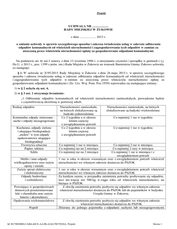 Projekt UCHWAŁA NR .................... RADY MIEJSKIEJ W ŻUKOWIE z dnia .................... 2015 r. o zmianie uchwały w sprawie szczegółowego sposobu i zakresu świadczenia usług w zakresie odbierania odpadów komunalnych od właścicieli nieruchomości i zagospodarowania tych odpadów w zamian za uiszczoną przez właściciela nieruchomości opłatę za gospodarowanie odpadami komunalnymi. Na podstawie art. 6r ust.3 ustawy z dnia 13 września 1996 r. o utrzymaniu czystości i porządku w gminach ( t.j. Dz.U. z 2013 r., poz. 1399 z późn. zm.) Rada Miejska w Żukowie na wniosek Burmistrza Gminy Żukowo uchwala, co następuje: § 1. W uchwale nr X/95/2015 Rady Miejskiej w Żukowie z dnia 26 maja 2015 r. w sprawie szczegółowego sposobu i zakresu świadczenia usług w zakresie odbierania odpadów komunalnych od właścicieli nieruchomości i zagospodarowania tych odpadów w zamian za uiszczoną przez właściciela nieruchomości opłatę za gospodarowanie odpadami komunalnymi ( Dz. Urz. Woj. Pom. Poz.1939) wprowadza się następujące zmiany: 1) w § 2 uchyla się ust. 4, 2) w § 3 ust. 1 otrzymuje brzmienie: „1. Odbieranie odpadów komunalnych od właścicieli nieruchomości zamieszkałych, prowadzone będzie z częstotliwością określoną w poniższej tabeli. Rodzaj odpadów Komunalne odpady zmieszane – suche i odpady niesegregowane Kuchenne, odpady zielone i ulegające biodegradacji „mokre” w tym odpady opakowaniowe ulegające biodegradacji Tworzywa sztuczne Papier, tektura Szkło Meble i inne odpady wielkogabarytowe oraz zużyte opony i metale Zużyty sprzęt elektryczny i elektroniczny Odpady budowlane i rozbiórkowe Powstające w gospodarstwach domowych przeterminowane leki i chemikalia oraz zużyte baterie i akumulatory Opakowania wielomateriałowe Popiół Nieruchomości zamieszkałe, na których zlokalizowane są budynki jednorodzinne Co 2 tygodnie a w okresie letnim częściej z uwzględnieniem potrzeb Co 2 tygodnie a w okresie letnim częściej z uwzględnieniem potrzeb Nieruchomości zamieszkałe, na których zlokalizowane są budynki wielorodzinne Co najmniej 1 raz w tygodniu Co najmniej 1 raz w tygodniu Co najmniej 1 raz w miesiącu Co najmniej raz na 2 miesiące Co najmniej raz na 2 miesiące Co najmniej 2 raz w miesiącu Co najmniej 2 razy w miesiącu Co najmniej 1 raz w miesiącu i z uwzględnieniem potrzeb 1 raz w roku w okresie wiosennym oraz z uwzględnieniem potrzeb właściciel nieruchomości we własnym zakresie dostarcza do PSZOK 1 raz w roku w okresie wiosennym oraz z uwzględnieniem potrzeb właściciel nieruchomości we własnym zakresie dostarcza do PSZOK Za każdym razem, w przypadku zaistnienia potrzeby pozbywania się odpadów, lecz nie więcej niż 500 kg w ciągu roku od właściciela nieruchomości, na bieżąco w PSZOK Z chwilą zaistnienia potrzeby pozbycia się odpadów we własnym zakresie właściciel nieruchomości dostarcza do PSZOK lub do pojemników w budynku Urzędu Gminy w Żukowie. Z chwilą zaistnienia potrzeby pozbycia się odpadów we własnym zakresie właściciel nieruchomości dostarcza do PSZOK Zbierany do jednego pojemnika z odpadami suchymi lub niesegregowanymi Id: B170DD0D-CAB4-44CE-AA3B-A24A7B37D36A. Projekt Strona 1 odbierany będzie co 2 tygodnie. Popiół zbierany do oddzielnych pojemników z chwilą zaistnienia potrzeby pozbycia się odpadów we własnym zakresie właściciel nieruchomości dostarcza do PSZOK. Gałęzie po przycince pielęgnacyjnej drzew i krzewów, choinki, urobek po wycince drzew i krzewów ”. Z chwilą zaistnienia potrzeby pozbycia się odpadów we własnym zakresie właściciel nieruchomości dostarcza do PSZOK § 2. Wykonanie uchwały powierza się Burmistrzowi Gminy Żukowo. § 3. Uchwała wchodzi w życie po upływie 14 dni od dnia opublikowania w Dzienniku Urzędowym Województwa Pomorskiego. Przewodniczący Rady Miejskiej w Żukowie Witold Szmidtke Id: B170DD0D-CAB4-44CE-AA3B-A24A7B37D36A. Projekt Strona 2 Uzasadnienie Uchwała szczegółowo określa usługi, które będą świadczone przez Gminę w ramach opłaty za gospodarowanie odpadami komunalnymi. Wprowadzone zmiany dotyczą dostosowania zapisów uchwały do przepisów wynikających z art. 3 ust.2 pkt. 5 oraz art. 9f ustawy o utrzymaniu czystości i porządku w gminach a mianowicie gminy są zobowiązane do zapewnienia czystości i porządku na swoim terenie oraz tworzą warunki niezbędne do utrzymania czystości, a w szczególności są zobowiązane ustanowić selektywne zbieranie odpadów komunalnych obejmujące co najmniej frakcje odpadów: papieru, metalu, tworzywa sztucznego, szkła i opakowań wielomateriałowych oraz odpadów komunalnych ulegających biodegradacji, w tym odpadów opakowaniowych ulegających biodegradacji. Zgodnie z art. 6r ust. 3c wyżej cytowanej ustawy przedłożony projekt uchwały został zaopiniowany przez państwowego powiatowego inspektora sanitarnego w zakresie częstotliwości odbierania odpadów komunalnych. Wprowadzone zmiany wynikają z nowelizacji ustawy o utrzymaniu czystości i porządku w gminach, która została opublikowana w Dz.U. z 2015r, poz. 87. Id: B170DD0D-CAB4-44CE-AA3B-A24A7B37D36A. Projekt Strona 1