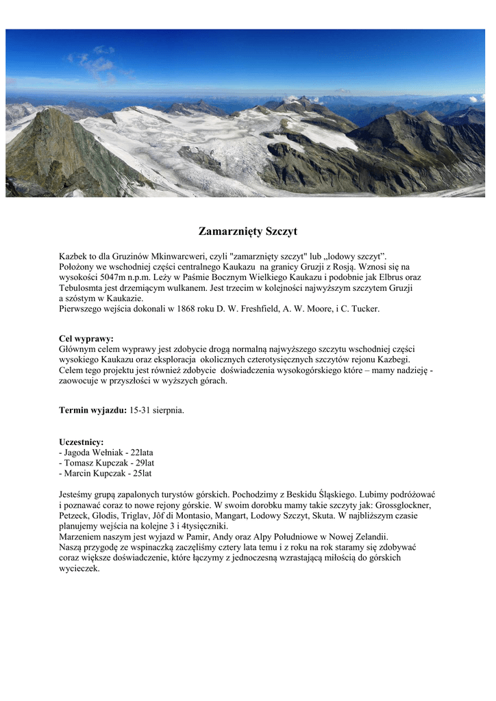Zamarznięty Szczyt Kazbek to dla Gruzinów Mkinwarcweri, czyli "zamarznięty szczyt" lub „lodowy szczyt”. Położony we wschodniej części centralnego Kaukazu na granicy Gruzji z Rosją. Wznosi się na wysokości 5047m n.p.m. Leży w Paśmie Bocznym Wielkiego Kaukazu i podobnie jak Elbrus oraz Tebulosmta jest drzemiącym wulkanem. Jest trzecim w kolejności najwyższym szczytem Gruzji a szóstym w Kaukazie. Pierwszego wejścia dokonali w 1868 roku D. W. Freshfield, A. W. Moore, i C. Tucker. Cel wyprawy: Głównym celem wyprawy jest zdobycie drogą normalną najwyższego szczytu wschodniej części wysokiego Kaukazu oraz eksploracja okolicznych czterotysięcznych szczytów rejonu Kazbegi. Celem tego projektu jest również zdobycie doświadczenia wysokogórskiego które – mamy nadzieję zaowocuje w przyszłości w wyższych górach. Termin wyjazdu: 15-31 sierpnia. Uczestnicy: - Jagoda Wełniak - 22lata - Tomasz Kupczak - 29lat - Marcin Kupczak - 25lat Jesteśmy grupą zapalonych turystów górskich. Pochodzimy z Beskidu Śląskiego. Lubimy podróżować i poznawać coraz to nowe rejony górskie. W swoim dorobku mamy takie szczyty jak: Grossglockner, Petzeck, Glodis, Triglav, Jôf di Montasio, Mangart, Lodowy Szczyt, Skuta. W najbliższym czasie planujemy wejścia na kolejne 3 i 4tysięczniki. Marzeniem naszym jest wyjazd w Pamir, Andy oraz Alpy Południowe w Nowej Zelandii. Naszą przygodę ze wspinaczką zaczęliśmy cztery lata temu i z roku na rok staramy się zdobywać coraz większe doświadczenie, które łączymy z jednoczesną wzrastającą miłością do górskich wycieczek. Plan wyprawy: Dzień I Przelot z Katowic do Kutaisi i przejazd do Kazbegi. Dzień II-VI Główny cel wyprawy czyli wejście na Kazbek. W ramach aklimatyzacji wejście na szczyty Ortsveri 4365 m n.p.m., Spartak 4517m n.p.m. oraz Mailihoh 4597m n.p.m. Dzień VII Dzień odpoczynku. Dzień VIII-XII Eksploracja okolicznych szczytów Kazbegi. Próba wejścia na Kuro 4071 m n.p.m. oraz Shiro 4048 m n.p.m. Dzień XIII-XIV Powrót do Polski Koszty wyprawy: Przelot samolotem: ok. 3500zł Wyżywienie: ok. 1000zł Przejazdy: ok. 500zł Uzupełnienie braków sprzętowych (namiot wyprawowy, śpiwory, kurtki puchowe): 4500zł Łączny koszt wyprawy: 9500zł