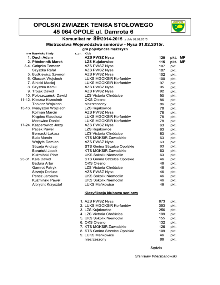 OPOLSKI ZWIAZEK TENISA STOŁOWEGO 45 064 OPOLE ul. Damrota 6 Komunikat nr 89/2014-2015 z dnia 02.02.2015 Mistrzostwa Województwa seniorów - Nysa 01.02.2015r. gra pojedyncza mężczyzn m-e Nazwisko i Imię r..ur. 1. Duch Adam 2. Płóciennik Marek 3-4. Gałązka Tomasz Szyszka Rafał 5. Budkiewicz Szymon 6. Głuszek Wojciech 7. Sinicki Maciej 8. Szyszka Kamil 9. Trojak Dawid 10. Połoszczański Dawid 11-12. Kleszcz Kszesimir Tobiasz Wojciech 13-16. Iwasyszyn Wojciech Kolman Marcin Krąpiec Klaudiusz Morawiec Daniel 17-24. Kasperowicz Jerzy Pacek Paweł Bernacki Łukasz Bula Marcin Wojtyła Damian Strzeja Andrzej Barański Jacek Kuźmiński Piotr 25-31. Kała Dawid Badura Artur Gamrot Patryk Strzeja Dariusz Pencz Jarosław Kuźmiński Paweł Albrycht Krzysztof Klub AZS PWSZ Nysa LZS Kujakowice AZS PWSZ Nysa AZS PWSZ Nysa AZS PWSZ Nysa LUKS MGOKSiR Korfantów LUKS MGOKSiR Korfantów AZS PWSZ Nysa AZS PWSZ Nysa LZS Victoria Chróścice OKS Olesno niezrzeszony LZS Kujakowice AZS PWSZ Nysa LUKS MGOKSiR Korfantów LUKS MGOKSiR Korfantów AZS PWSZ Nysa LZS Kujakowice LZS Victoria Chróścice KTS MOKSiR Zawadzkie AZS PWSZ Nysa STS Gmina Strzelce Opolskie KTS MOKSiR Zawadzkie UKS Sokolik Niemodlin STS Gmina Strzelce Opolskie OKS Olesno LZS Victoria Chróścice AZS PWSZ Nysa UKS Sokolik Niemodlin UKS Sokolik Niemodlin LUKS Mańkowice 120 115 107 107 102 100 97 95 92 90 86 86 78 78 78 78 63 63 63 63 63 63 63 63 46 46 46 46 46 46 46 pkt. MP pkt. MP pkt. pkt. pkt. pkt. pkt. pkt. pkt. pkt. pkt. pkt. pkt. pkt. pkt. pkt. pkt. pkt. pkt. pkt. pkt. pkt. pkt. pkt. pkt. pkt. pkt. pkt. pkt. pkt. pkt. 873 353 256 199 155 132 126 109 46 86 pkt. pkt. pkt. pkt. pkt. pkt. pkt. pkt. pkt. pkt. Klasyfikacja klubowa seniorzy 1. 2. 3. 4. 5. 6. 7. 8. 9. AZS PWSZ Nysa LUKS MGOKSiR Korfantów LZS Kujakowice LZS Victoria Chróścice UKS Sokolik Niemodlin OKS Olesno KTS MOKSiR Zawadzkie STS Gmina Strzelce Opolskie LUKS Mańkowice niezrzeszony Sędzia Stanisław Wierzbanowski