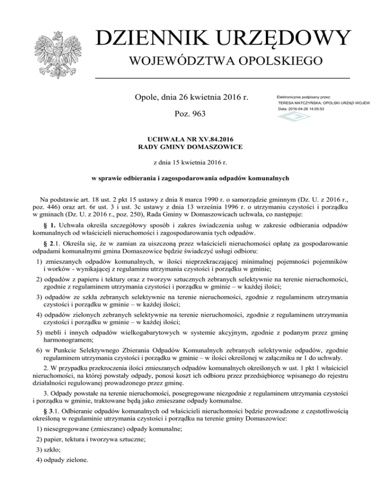 DZIENNIK URZĘDOWY WOJEWÓDZTWA OPOLSKIEGO Opole, dnia 26 kwietnia 2016 r. Elektronicznie podpisany przez: TERESA MATCZYŃSKA; OPOLSKI URZĄD WOJEWÓDZKI Poz. 963 Data: 2016-04-26 14:05:53 UCHWAŁA NR XV.84.2016 RADY GMINY DOMASZOWICE z dnia 15 kwietnia 2016 r. w sprawie odbierania i zagospodarowania odpadów komunalnych Na podstawie art. 18 ust. 2 pkt 15 ustawy z dnia 8 marca 1990 r. o samorządzie gminnym (Dz. U. z 2016 r., poz. 446) oraz art. 6r ust. 3 i ust. 3c ustawy z dnia 13 września 1996 r. o utrzymaniu czystości i porządku w gminach (Dz. U. z 2016 r., poz. 250), Rada Gminy w Domaszowicach uchwala, co następuje: § 1. Uchwała określa szczegółowy sposób i zakres świadczenia usług w zakresie odbierania odpadów komunalnych od właścicieli nieruchomości i zagospodarowania tych odpadów. § 2.1. Określa się, że w zamian za uiszczoną przez właścicieli nieruchomości opłatę za gospodarowanie odpadami komunalnymi gmina Domaszowice będzie świadczyć usługi odbioru: 1) zmieszanych odpadów komunalnych, w ilości nieprzekraczającej minimalnej pojemności pojemników i worków - wynikającej z regulaminu utrzymania czystości i porządku w gminie; 2) odpadów z papieru i tektury oraz z tworzyw sztucznych zebranych selektywnie na terenie nieruchomości, zgodnie z regulaminem utrzymania czystości i porządku w gminie – w każdej ilości; 3) odpadów ze szkła zebranych selektywnie na terenie nieruchomości, zgodnie z regulaminem utrzymania czystości i porządku w gminie – w każdej ilości; 4) odpadów zielonych zebranych selektywnie na terenie nieruchomości, zgodnie z regulaminem utrzymania czystości i porządku w gminie – w każdej ilości; 5) mebli i innych odpadów wielkogabarytowych w systemie akcyjnym, zgodnie z podanym przez gminę harmonogramem; 6) w Punkcie Selektywnego Zbierania Odpadów Komunalnych zebranych selektywnie odpadów, zgodnie regulaminem utrzymania czystości i porządku w gminie – w ilości określonej w załączniku nr 1 do uchwały. 2. W przypadku przekroczenia ilości zmieszanych odpadów komunalnych określonych w ust. 1 pkt 1 właściciel nieruchomości, na której powstały odpady, ponosi koszt ich odbioru przez przedsiębiorcę wpisanego do rejestru działalności regulowanej prowadzonego przez gminę. 3. Odpady powstałe na terenie nieruchomości, posegregowane niezgodnie z regulaminem utrzymania czystości i porządku w gminie, traktowane będą jako zmieszane odpady komunalne. § 3.1. Odbieranie odpadów komunalnych od właścicieli nieruchomości będzie prowadzone z częstotliwością określoną w regulaminie utrzymania czystości i porządku na terenie gminy Domaszowice: 1) niesegregowane (zmieszane) odpady komunalne; 2) papier, tektura i tworzywa sztuczne; 3) szkło; 4) odpady zielone. Dziennik Urzędowy Województwa Opolskiego –2– Poz. 963 2. Odpady wielkogabarytowe oraz zużyty sprzęt elektryczny i elektroniczny odbierane będą od właścicieli nieruchomości w systemie akcyjnym, zgodnie z podanym przez gminę harmonogramem. § 4.1. W ramach opłaty za gospodarowanie odpadami komunalnymi do Punktu Selektywnego Zbierania Odpadów Komunalnych można bezpłatnie oddawać odpady według rodzaju i ilości wskazanej w załączniku nr 1 do uchwały. 2. Informacje o lokalizacji, godzinach otwarcia Punktu Selektywnej Zbiórki Odpadów Komunalnych, a także szczegółowy regulamin korzystania wraz z cennikiem za odbiór, gmina podaje do publicznej wiadomości na stronie internetowej Biuletynu Informacji Publicznej Gminy Domaszowice oraz w sposób zwyczajowo przyjęty. 3. Maksymalna ilość, jednorazowo przywiezionych odpadów komunalnych, nie może przekroczyć 2 m3. Transport odpadów mieszkańcy zapewniają we własnym zakresie i na własny koszt. 4. W PSZOK-u przyjmowane są wyłącznie odpady określone w załączniku nr 1 do uchwały, dostarczone do PSZOK-u przez ich wytwórców. 5. Zarządca PSZOK może odmówić przyjęcia odpadów niezidentyfikowanych, niewiadomego pochodzenia, o niewiadomym składzie, odbiegających od charakterystyki podanej w regulaminie funkcjonowania PSZOK-u. § 5. Sposób zagospodarowania poszczególnych frakcji odpadów odebranych od właścicieli nieruchomości określa załącznik nr 2 do uchwały. § 6. Traci moc uchwała nr XIII.71.2016 Rady Gminy Domaszowice z dnia 26 lutego 2016 r. w sprawie określenia szczegółowego sposobu i zakresu świadczenia usług w zakresie odbierania odpadów komunalnych od właścicieli nieruchomości i zagospodarowania tych odpadów (Dz. Urz. Woj. Opolskiego z 2016 r., poz. 608). § 7. Wykonanie uchwały powierza się Wójtowi Gminy Domaszowice. § 8. Uchwała podlega ogłoszeniu w Dzienniku Urzędowym Województwa Opolskiego i wchodzi w życie po upływie 14 dni od daty jej ogłoszenia. Przewodniczący Rady Jan Nowak Dziennik Urzędowy Województwa Opolskiego –3– Poz. 963 Załącznik nr 1 do uchwały nr XV.84.2016 Rady Gminy Domaszowice z dnia 15 kwietnia 2016 r. ILOŚĆ I RODZAJ ODPADÓW PRZYJMOWANYCH W RAMACH OPŁATY ZA GOSPODAROWANIE ODPADAMI KOMUNALNYMI W PUNKCIE SELEKTYWNEGO ZBIERANIA ODPADÓW KOMUNALNYCH Kod odpadu 20 01 01 20 01 02 20 01 08 20 01 10 20 01 11 20 01 21* Rodzaj odpadu Papier i tektura Szkło Odpady kuchenne ulegające biodegradacji Odzież Tekstylia Lampy fluorescencyjne i inne odpady zawierające rtęć 20 01 23* Urządzenia zawierające freony 20 01 32 20 01 33* Leki inne niż wymienione w 20 01 31 Baterie i akumulatory łącznie z bateriami i akumulatorami wymienionymi w 16 06 01, 16 06 02 lub 16 06 03 oraz niesortowane baterie i akumulatory zawierające te baterie Baterie i akumulatory inne niż wymienione w 20 0133 Zużyte urządzenia elektryczne i elektroniczne inne niż wymienione w 20 01 21 i 20 01 23 zawierające niebezpieczne składniki Zużyte urządzenia elektryczne i elektroniczne inne niż wymienione w 20 01 21, 20 01 23 i 20 01 35 20 01 34 20 01 35* 20 01 36 20 01 38 20 01 39 20 01 40 20 02 01 Drewno inne niż wy