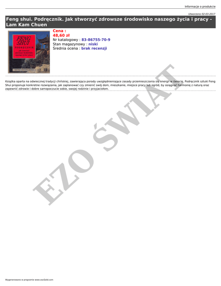 Informacje o produkcie Utworzono 02-03-2017 Feng shui. Podręcznik. Jak stworzyć zdrowsze środowisko naszego życia i pracy Lam Kam Chuen Cena : 48,60 zł IA T Nr katalogowy : 83-86755-70-9 Stan magazynowy : niski Średnia ocena : brak recenzji EZ O ŚW Książka oparta na odwiecznej tradycji chińskiej, zawierająca porady uwzględnieniające zasady przemieszczania się energii w świecie. Podręcznik sztuki Feng Shui proponuje konkretne rozwiązania, jak zaplanować czy zmienić swój dom, mieszkanie, miejsce pracy lub ogród, by osiągnąć harmonię z naturą oraz zapewnić zdrowie i dobre samopoczucie sobie, swojej rodzinie i przyjaciołom. Wygenerowano w programie www.oscGold.com