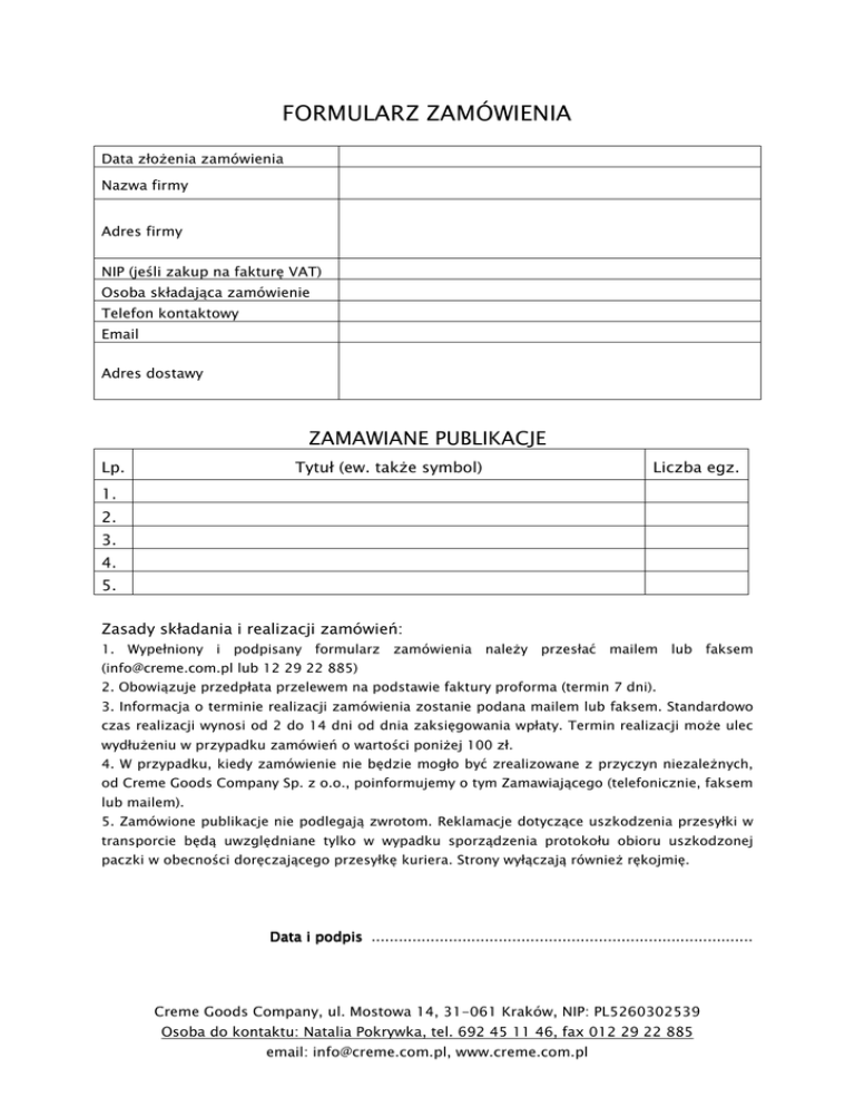FORMULARZ ZAMÓWIENIA Data złoŜenia zamówienia Nazwa firmy Adres firmy NIP (jeśli zakup na fakturę VAT) Osoba składająca zamówienie Telefon kontaktowy Email Adres dostawy ZAMAWIANE PUBLIKACJE Lp. Tytuł (ew. takŜe symbol) Liczba egz. 1. 2. 3. 4. 5. Zasady składania i realizacji zamówień: 1. Wypełniony i podpisany formularz zamówienia naleŜy przesłać mailem lub faksem ([email protected] lub 12 29 22 885) 2. Obowiązuje przedpłata przelewem na podstawie faktury proforma (termin 7 dni). 3. Informacja o terminie realizacji zamówienia zostanie podana mailem lub faksem. Standardowo czas realizacji wynosi od 2 do 14 dni od dnia zaksięgowania wpłaty. Termin realizacji moŜe ulec wydłuŜeniu w przypadku zamówień o wartości poniŜej 100 zł. 4. W przypadku, kiedy zamówienie nie będzie mogło być zrealizowane z przyczyn niezaleŜnych, od Creme Goods Company Sp. z o.o., poinformujemy o tym Zamawiającego (telefonicznie, faksem lub mailem). 5. Zamówione publikacje nie podlegają zwrotom. Reklamacje dotyczące uszkodzenia przesyłki w transporcie będą uwzględniane tylko w wypadku sporządzenia protokołu obioru uszkodzonej paczki w obecności doręczającego przesyłkę kuriera. Strony wyłączają równieŜ rękojmię. Data i podpis .................................................................................... Creme Goods Company, ul. Mostowa 14, 31-061 Kraków, NIP: PL5260302539 Osoba do kontaktu: Natalia Pokrywka, tel. 692 45 11 46, fax 012 29 22 885 email: [email protected], www.creme.com.pl