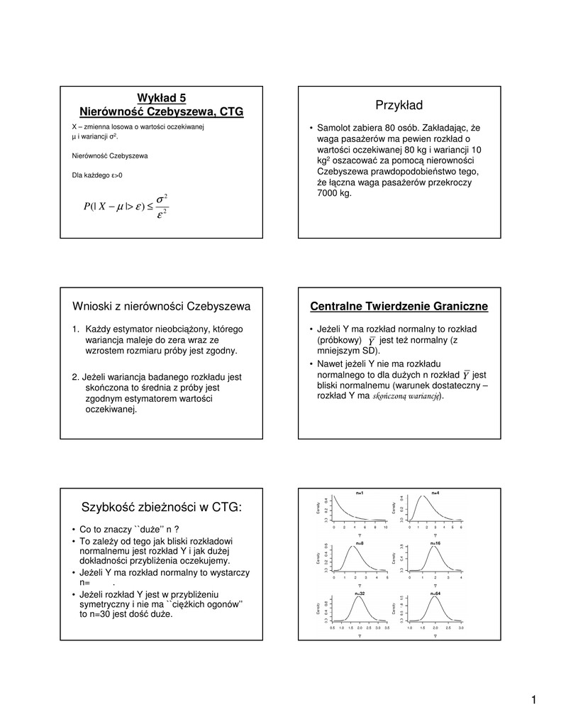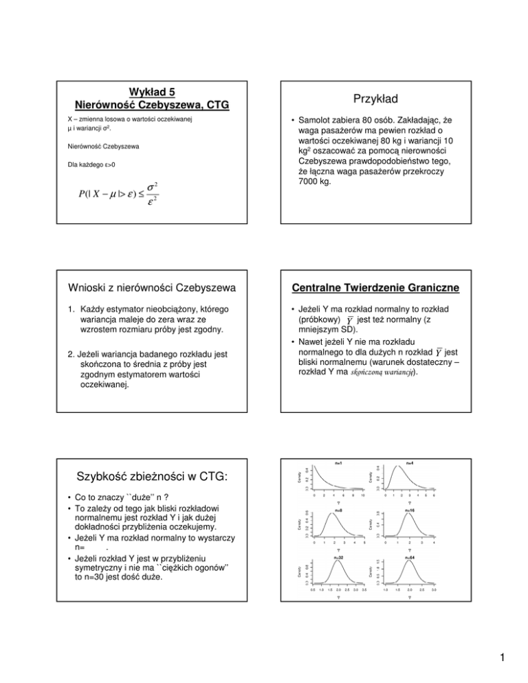 Wykład 5 Nierówność Czebyszewa, CTG X – zmienna losowa o wartości oczekiwanej µ i wariancji σ2. Nierówność Czebyszewa Dla każdego ε>0 P(| X − µ |> ε ) ≤ σ2 ε2 Przykład • Samolot zabiera 80 osób. Zakładając, że waga pasażerów ma pewien rozkład o wartości oczekiwanej 80 kg i wariancji 10 kg2 oszacować za pomocą nierowności Czebyszewa prawdopodobieństwo tego, że łączna waga pasażerów przekroczy 7000 kg. Wnioski z nierówności Czebyszewa Centralne Twierdzenie Graniczne 1. Każdy estymator nieobciążony, którego wariancja maleje do zera wraz ze wzrostem rozmiaru próby jest zgodny. • Jeżeli Y ma rozkład normalny to rozkład (próbkowy) Y jest też normalny (z mniejszym SD). • Nawet jeżeli Y nie ma rozkładu normalnego to dla dużych n rozkład Y jest bliski normalnemu (warunek dostateczny – rozkład Y ma skończoną wariancję). 2. Jeżeli wariancja badanego rozkładu jest skończona to średnia z próby jest zgodnym estymatorem wartości oczekiwanej. Szybkość zbieżności w CTG: • Co to znaczy ``duże’’ n ? • To zależy od tego jak bliski rozkładowi normalnemu jest rozkład Y i jak dużej dokładności przybliżenia oczekujemy. • Jeżeli Y ma rozkład normalny to wystarczy n= . • Jeżeli rozkład Y jest w przybliżeniu symetryczny i nie ma ``ciężkich ogonów’’ to n=30 jest dość duże. 1 Wniosek • Techniki prezentowane dalej na tym kursie, dotyczące konstrukcji przedziałów ufności dla µ i testowania hipotez o średnich, mogą być również stosowane, gdy rozkład pojedynczych obserwacji nie jest normalny, o ile tylko rozmiar prób jest „wystarczająco” duży i rozkład nie ma „ciężkich ogonów”. • Założenie o niezależności poszczególnych obserwacji jest niezbędne. Przykład: • Producent ocenia, że 2% jego wyrobów jest wadliwych. Wyroby te paczkuje się po 40 w jednym opakowaniu. • Y = liczba wadliwych wyrobów w losowo wybranej paczce. Y ma rozkład ......................................... • Niech p̂ = Y/40 = frakcja elementów wadliwych. • P( p̂ = r ) = Gdybyśmy otworzyli tysiące paczek, to rozkład frakcji liczby wadliwych elementów w paczce byłby zgodny z rozkładem wyliczonym na poprzedniej stronie. Prawdziwa wartość p jest 0.02 i nie jest nawet możliwa do zaobserwowania w pojedynczym eksperymencie, ale na ogół otrzymamy wartości bliskie 0.02. P-stwo, że p̂ = 0.025 wynosi 36%. P-stwo, że nasza ocena będzie różnić się nie więcej niż o 0.03 od prawdziwej wartości wynosi:.............. Rozkład próbkowy estymatora dla p w rozkładzie dwupunktowym • Y = liczba sukcesów w n próbach • y = zaobserwowana liczba sukcesów • p̂ = Y/n jest estymatorem p Rozkład p̂ wyznaczamy przy pomocy (dwumianowego) rozkładu Y! Pr( pˆ = 0) = Pr(Y = 0) = (1)(.02)0 (.98)40 = 0.45 Pr( pˆ = 0.025) = Pr(Y =1) = (40)(.02)1(.98)39 = 0.36 Pr( pˆ = 0.05) = Pr(Y = 2) = (780)(.02)2 (.98)38 = 0.14 Pr( pˆ = 0.075) = Pr(Y = 3) = (9880)(.02)3 (.98)37 = 0.04 Pr( pˆ ≥ 0.1) = Pr(Y ≥ 4) ≈ 0.01 Przykład • n=40 i p = 0.02. Jakie jest p-stwo, że estymator częstości przekracza dwukrotnie (lub więcej) prawdziwą wartość? Zatem, jeżeli znajdziemy 3 lub więcej wyrobów wadliwych w jednej paczce mamy podstawy, żeby kwestionować twierdzenie producenta o p! 2 Zależność od rozmiaru próby • • • • • • • Y ma rozkład Bernoulliego (n,p) µY=np Var (Y)=np(1-p) p̂ = µ p̂ = Var ( p̂ )= UWAGA - p̂ jest nieobciążonym i zgodnym estymatorem parametru p. • Dla dużych n rozkład p̂ można przybliżać rozkładem normalnym. • Gdy n rośnie, to wariancja ............... i estymator staje się bardziej .................... • Przykład; p=0.3. Rozkład p̂ (gdy p=0.3) Estymacja wariancji 1 ∑ ( X i − µ )2 n 1 S2 = ∑ ( X i − X )2 n −1 2 E ( S0 ) = E ( S 2 ) = σ 2 2 S0 = n P(0.25≤ p̂ ≤0.35) 10 0.5 20 0.535 40 0.612 80 0.728 500 0.987 1 (E( X i − µ )4 − σ 4 ) n E ( X − µ ) 4 (n − 3) 4 Var ( S 2 ) = − σ n n(n − 1) 2 Var ( S 0 ) = 3 Wnioski • S02 i S2 są nieobciążonymi estymatorami wariancji • Jeżeli czwarty moment rozkładu jest skończony to są one również estymatorami zgodnymi Rozkład χ2 • Definicja: Niech Y1, … Yk będą niezależnymi zmiennymi losowymi o rozkładzie N(0,1). Suma kwadratów tych zmiennych ma rozkład χ2k (rozkład chikwadrat z k stopniami swobody). Wniosek • Jeżeli rozmiar próby jest dostatecznie duży (n>30) to rozkład S2 można przybliżać rozkładem normalnym o wartości oczekiwanej σ2 i wariancji 2 σ4 /(n-1). Estymator wariancji w rozkładzie normalnym • Jeżeli obserwacje pochodzą z rozkładu normalnego to (n-1)S2/σ2 ma rozkład chikwadrat z n-1 stopniami swobody. Wartość oczekiwana i wariancja • Jeżeli zmienna X ma rozkład chi-kwadrat z k stopniami swobody to jej wartość oczekiwana wynosi • a jej wariancja wynosi 2k. • Wniosek z CTG – rozkład chi-kwadrat z k stopniami swobody przybliżamy przez N(µ=k, σ2=2k). Przykład • W pewnym kraju wzrost mężczyzn można modelować za pomocą rozkładu normalnego. W celu oszacowania wariancji tego rozkładu wylosowano 36 mężczyzn. Oszacuj prawdopodobieństwo, że wyliczona wariancja próbkowa odchyli się od rzeczywistej wartości tego parametru o ponad 4 cm2, jeżeli rzeczywiste odchylenie standardowe wynosi σ=5 cm. 4