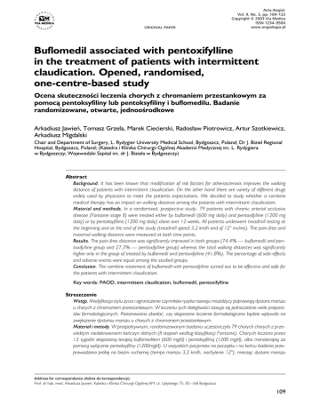 ORIGINAL PAPER Acta Angiol. Vol. 9, No. 3, pp. 109–122 Copyright © 2003 Via Medica ISSN 1234–950X www.angiologia.pl Buflomedil associated with pentoxifylline in the treatment of patients with intermittent claudication. Opened, randomised, one-centre-based study Ocena skuteczności leczenia chorych z chromaniem przestankowym za pomocą pentoksyfiliny lub pentoksyfiliny i buflomedilu. Badanie randomizowane, otwarte, jednoośrodkowe Arkadiusz Jawień, Tomasz Grzela, Marek Ciecierski, Radosław Piotrowicz, Artur Szotkiewicz, Arkadiusz Migdalski Chair and Department of Surgery, L. Rydygier University Medical School, Bydgoszcz, Poland; Dr J. Biziel Regional Hospital, Bydgoszcz, Poland; (Katedra i Klinika Chirurgii Ogólnej Akademii Medycznej im. L. Rydygiera w Bydgoszczy; Wojewódzki Szpital im. dr J. Biziela w Bydgoszczy) Abstract Background. It has been known that modification of risk factors for atherosclerosis improves the walking distance of patients with intermittent claudication. On the other hand there are variety of different drugs widely used by physicians to meet the patients expectations. We decided to study whether a combine medical therapy has an impact on walking distance among the patients with intermittant claudication. Material and methods. In a randomised, prospective study, 79 patients with chronic arterial occlusive disease (Fontaine stage II) were treated either by buflomedil (600 mg daily) and pentoxifylline (1200 mg daily) or by pentoksyfilline (1200 mg daily) alone over 12 weeks. All patients underwent treadmill testing at the beginning and at the end of the study (treadmill speed 3,2 km/h and of 12° incline). The pain-free and maximal walking distance were measured at both time points. Results. The pain-free distance was significantly improved in both groups (74,4% — buflomedil and pentoxifylline group and 27,3% — pentoxifylline group) whereas the total walking distances was significantly higher only in the group of treated by buflomedil and pentoxifylline (41,8%). The percentage of side-effects and adverse events were equal among the studied groups. Conclusion. The combine treatment of buflomedil with pentoxifylline turned out to be effective and safe for the patients with intermittent claudication. Key words: PAOD, intermittent claudication, buflomedil, pentoxifylline Streszczenie Wstęp. Modyfikacja stylu życia i ograniczenie czynników ryzyka rozwoju miażdżycy poprawiają dystans marszu u chorych z chromaniem przestankowym. W leczeniu tych dolegliwości stosuje się jednocześnie wiele preparatów farmakologicznych. Postanowiono zbadać, czy skojarzone leczenie farmakologiczne będzie wpływało na zwiększenie dystansu marszu u chorych z chromaniem przestankowym. Materiał i metody. W prospektywnym, randomizowanym badaniu uczestniczyło 79 chorych chorych z przewlekłym niedokrwieniem kończyn dolnych (II stopień według klasyfikacji Fontaine). Chorych leczono przez 12 tygodni skojarzoną terapią buflomedilem (600 mg/d) i pentoksyfiliną (1200 mg/d), albo monoterapią za pomocą wyłącznie pentoksyfiliny (1200mg/d). U wszystkich pacjentów na początku i na końcu badania przeprowadzono próbę na bieżni ruchomej (tempo marszu 3,2 km/h, nachylenie 12°), mierząc dystans marszu Address for correspondence (Adres do korespondencji): Prof. dr hab. med. Arkadiusz Jawień, Katedra i Klinika Chirurgii Ogólnej AM, ul. Ujejskiego 75, 85–168 Bydgoszcz 109 Acta Angiol., 2003, Vol. 9, No. 3 wolny od bólu i całkowity dystans marszu. Wyniki. Dystans marszu wolny od bólu wydłużył się istotnie statystycznie w obu grupach badanych (74,4% — w grupie terapii skojarzonej oraz 27,3% w grupie leczonej pentoksyfiliną). Natomiast całkowity dystans marszu istotnie statystycznie wydłużył się tylko w grupie terapii skojarzonej (41,8%). Odsetek działań niepożądanych był podobny w obu grupach badanych. Wniosek. Skojarzone stosowanie pentoksyfiliny i buflomedilu wydaje się efektywnym i bezpiecznym leczeniem u chorych z chromaniem przestankowym u chorych. Słowa kluczowe: przewlekłe niedokrwienie kończyn dolnych, chromanie przestankowe, buflomedil, pentoksyfilina Introduction Wstęp Intermittent claudication is defined as the exercise-induced pain of a lower extremity (most often of the calf), forcing the patient to stop walking and relieved after rest. The symptom is caused by the partial or complete occlusion of the arteries. Most often diagnosis can be made just upon data collected from anamnesis [1]. The estimated rate of prevalence of intermittent claudication in subjects older than 60 years is over 5% in men and 2.5% in women [2]. During 5-years-long observation, in half of the patients the intensity of the symptom is constant or decreases, in 16% of patients progression is observed and every fourth affected subject requires surgical intervention including revascularisation or limb amputation [3]. In majority of cases chronic lower limb ischemia is caused by atherosclerosis. Lesions can be found not only in arteries of the lower limbs but also in other body regions, including cerebral and coronary vascular networks. It is estimated that lesions of cerebral arteries are present in 10% and coronary heart disease in 30% of patients with atherosclerosis of the lower limb arteries. Mortality rates of the patients with intermittent claudication are 2–3 times higher than of persons of the same age not complaining of this symptom [2, 4]. On one hand, therapy of intermittent claudication is aimed at eliminating symptoms of the limb ischemia and arresting the progression of vascular lesions and on the other hand the treatment should prevent the development of cardiovascular complications. The first goal can be achieved through modification of patient’s lifestyle (smoking, exercise therapy, eating habits), pharmacotherapy, intravascular and surgical interventions. Prevention of cardiovascular complications most often includes antiplatelet drugs admini