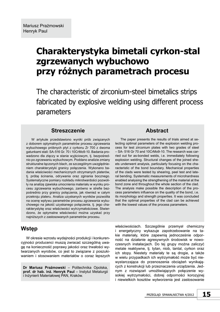 Mariusz Prażmowski Henryk Paul charakterystyka bimetali cyrkon-stal zgrzewanych wybuchowo przy różnych parametrach procesu the characteristic of zirconium-steel bimetalics strips fabricated by explosive welding using different process parameters Streszczenie abstract W artykule przedstawiono wyniki prób związanych z doborem optymalnych parametrów procesu zgrzewania wybuchowego próbnych płyt z cyrkonu Zr 700 z dwoma gatunkami stali: SA-516 Gr. 70 i 10CrMo9-10. Badania prowadzono dla złączy w stanie wyjściowym, tj. bezpośrednio po zgrzewaniu wybuchowym. Poddano analizie zmiany strukturalne łączonych blach, ze szczególnym uwzględnieniem charakterystyki granicy połączenia. Wykonano badania właściwości mechanicznych otrzymanych platerów, tj. próbę ścinania, odrywania oraz zginania bocznego. Systematyczne pomiary rozkładu mikrotwardości pozwoliły na analizę zjawiska umocnienia materiału w wyniku procesu zgrzewania wybuchowego, zarówno w strefie bezpośrednio przy granicy połączenia, jak również w całym przekroju plateru. Analiza uzyskanych wyników pozwoliła na ocenę wpływu parametrów procesu zgrzewania wybuchowego na jakość uzyskanego połączenia, tj. jego charakterystykę oraz właściwości wytrzymałościowe. Stwierdzono, że optymalne właściwości można uzyskać przy najniższych z zastosowanych parametrów procesu. The paper presents the results of trials aimed at selecting optimal parameters of the explosion welding process for test zirconium plates with two grades of steel – SA- 516 Gr 70 and 10CrMo9-10. The research was carried out for as-bonded welds, i.e. immediately following explosion welding. Structural changes of the joined sheets underwent analysis, particularly focusing on the characteristic of the bond boundary. Mechanical properties of the clads were tested by shearing, peel test and lateral bending. Systematic measurements of microhardness enabled analysing the strengthening of the material at the bond zone and throughout the whole section of the clad. The analysis make possible the description of the process parameters influence on the quality of the bond, i.e. its morphology and strength properties. It was concluded that the optimal properties of the clad can be achieved with the lowest values of the process parameters. wstęp W okresie wzrostu wydajności produkcji i konkurencyjności producenci muszą zwracać szczególną uwagę na konieczność poprawy jakości oraz trwałości wytwarzanych wyrobów, co jest to związane z poszukiwaniem i stosowaniem materiałów o coraz lepszych Dr Mariusz Prażmowski – Politechnika Opolska, prof. dr hab. inż. Henryk Paul – Instytut Metalurgii i Inżynierii Materiałowej PAN, Kraków. właściwościach. Szczególnie przemysł chemiczny i energetyczny wykazuje zapotrzebowanie na takie materiały, które zapewnią jednocześnie odporność na działanie agresywnych środowisk w nowoczesnych instalacjach. Do tej grupy można zaliczyć metale reaktywne, tj. tytan, niob, tantal, cyrkon oraz ich stopy. Niestety materiały te są drogie, a także w wielu przypadkach ich wytrzymałość może być niewystarczająca do przenoszenia obciążeń wynikających z konstrukcji lub przeznaczenia urządzenia. Jednym z rozwiązań umożliwiających połączenie wysokiej wytrzymałości, dobrej odporności korozyjnej i niewielkich kosztów wytworzenia jest zastosowanie Przegląd sPawalnictwa 4/2012 15 materiałów platerowanych. W tym przypadku wykorzystuje się połączenie tańszego materiału, które można zapewnić wysokie właściwości mechaniczne z materiałem drogim, o dobrych właściwościach ochronnych, przy czym często, cienka warstwa jest wystarczająca, aby znaczenie wydłużyć okres eksploatacji instalacji. Wiele technologii umożliwia łączenie ze sobą materiałów o zbliżonych właściwościach, np. napawanie, walcowanie pakietowe, zgrzewanie dyfuzyjne itp. Trudniejsze jest połączenie materiałów różniących się w znacznym stopniu właściwościami fizykochemicznymi. Wówczas jedynym możliwym rozwiązaniem pozostaje technologia zgrzewania wybuchowego. Technologia ta jest od wielu lat stosowana w przemyśle do łączenia metali i stopów o silnie zróżnicowanych właściwościach fizycznych i metalurgicznych. Jest przy tym szczególnie przydatna w łączeniu materiałów, dla których tradycyjne techniki spajania nie zapewniają uzyskania platerów o zadowalającej jakości połączenia. Inną znaczącą zaletą tej metody spajania jest to, że proces ten w zasadzie jest wolny od fizycznych, mechanicznych i temperaturowych ograniczeń tradycyjnego procesowi zgrzewania. Z omawianej grupy materiałów reaktywnych coraz większym zainteresowaniem cieszy się cyrkon, charakteryzujący się wysoką odpornością na korozję w różnych agresywnych środowiskach, tj. zawierających ługi, w roztworach kwasu solnego, azotowego, siarkowego i fosforowego, we wrzącym kwasie mrówkowym, octowym, mlekowym, cytrynowym i chlorooctowym, zwłaszcza przy pracy elementów w temperaturze podwyższonej [3]. Cyrkon (i jego stopy) jest metalem o bardzo niskim współczynniku pochłaniania gorących neutronów, stąd też znajduje zastosowanie w budowie niektórych elementów reaktorów jądrowych. Dodatkowo ma on najwyższy współczynnik odbicia promieniowania elektromagnetycznego, dlatego też (w postaci blach) wykorzystuje się go do osłony pomieszczeń przed promieniowaniem. Niestety wysoki koszt produkcji jest podstawowym ograniczeniem powszechnego zastosowania cyrkonu jako materiału konstrukcyjnego. Możliwość wytwarzania blach platerowanych cyrkonem, z wykorzystaniem technologii zgrzewania wybuchowego, w znacznym stopniu może przyczynić się do stosowania na skalę przemysłową cyrkonu oraz jego stopów. Na jakość oraz wytrzymałość uzyskanego połączenia ma wpływ obszar powstający na granicy zgrzewanych metali. Geometryczna oraz strukturalna budowa połączeń zgrzewany
