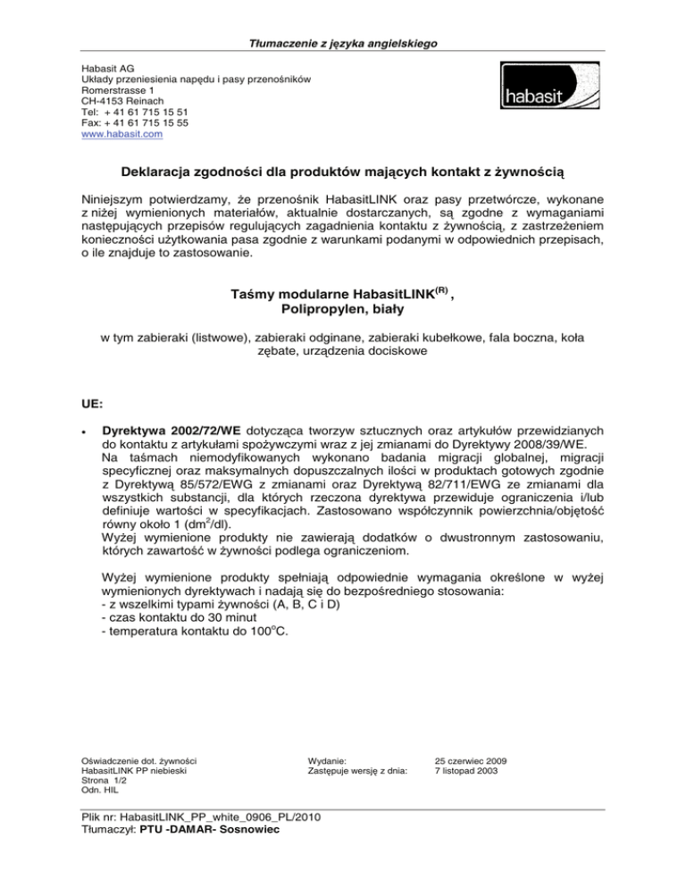Tłumaczenie z jĊzyka angielskiego Habasit AG Układy przeniesienia napĊdu i pasy przenoĞników Romerstrasse 1 CH-4153 Reinach Tel: + 41 61 715 15 51 Fax: + 41 61 715 15 55 www.habasit.com Deklaracja zgodnoĞci dla produktów mających kontakt z ĪywnoĞcią Niniejszym potwierdzamy, Īe przenoĞnik HabasitLINK oraz pasy przetwórcze, wykonane z niĪej wymienionych materiałów, aktualnie dostarczanych, są zgodne z wymaganiami nastĊpujących przepisów regulujących zagadnienia kontaktu z ĪywnoĞcią, z zastrzeĪeniem koniecznoĞci uĪytkowania pasa zgodnie z warunkami podanymi w odpowiednich przepisach, o ile znajduje to zastosowanie. TaĞmy modularne HabasitLINK(R) , Polipropylen, biały w tym zabieraki (listwowe), zabieraki odginane, zabieraki kubełkowe, fala boczna, koła zĊbate, urządzenia dociskowe UE: • Dyrektywa 2002/72/WE dotycząca tworzyw sztucznych oraz artykułów przewidzianych do kontaktu z artykułami spoĪywczymi wraz z jej zmianami do Dyrektywy 2008/39/WE. Na taĞmach niemodyfikowanych wykonano badania migracji globalnej, migracji specyficznej oraz maksymalnych dopuszczalnych iloĞci w produktach gotowych zgodnie z Dyrektywą 85/572/EWG z zmianami oraz Dyrektywą 82/711/EWG ze zmianami dla wszystkich substancji, dla których rzeczona dyrektywa przewiduje ograniczenia i/lub definiuje wartoĞci w specyfikacjach. Zastosowano współczynnik powierzchnia/objĊtoĞü równy około 1 (dm2/dl). WyĪej wymienione produkty nie zawierają dodatków o dwustronnym zastosowaniu, których zawartoĞü w ĪywnoĞci podlega ograniczeniom. WyĪej wymienione produkty spełniają odpowiednie wymagania okreĞlone w wyĪej wymienionych dyrektywach i nadają siĊ do bezpoĞredniego stosowania: - z wszelkimi typami ĪywnoĞci (A, B, C i D) - czas kontaktu do 30 minut - temperatura kontaktu do 100oC. OĞwiadczenie dot. ĪywnoĞci HabasitLINK PP niebieski Strona 1/2 Odn. HIL Wydanie: ZastĊpuje wersjĊ z dnia: Plik nr: HabasitLINK_PP_white_0906_PL/2010 Tłumaczył: PTU -DAMAR- Sosnowiec 25 czerwiec 2009 7 listopad 2003 Tłumaczenie z jĊzyka angielskiego Habasit AG Układy przeniesienia napĊdu i pasy przenoĞników Romerstrasse 1 CH-4153 Reinach Tel: + 41 61 715 15 51 Fax: + 41 61 715 15 55 www.habasit.com USA: • FDA, 21 CFR Īywica zasadowa spełnia wymagania czĊĞci/sekcji 177.1520 polimery olefinowe, 178.3297 barwniki dla polimerów. Zgodnie z naszą informacją wszystkie pozostałe komponenty stosowane w tym produkcie spełniają wymagania swoich odnoĞnych przepisów FDA oraz 21 CFR 177.1520(b). WyĪej wymienione produkty znajdują zastosowanie w bezpoĞrednim kontakcie z: - wszystkimi typami ĪywnoĞci wymienionymi w 21 CFR 176.170 (c) tabela 1 Warunki stosowania: od B (sterylizowane w gotującej siĊ wodzie) do G (mroĪone) zgodnie z 21 CFR 176.170 (c) tabela 2 Kierownik ds. Badawczo Rozwojowych Habasit AG Kierownik Produkcji Habasit Italy S. p. A. Vittorio Veneto/PLM ir. Maarten Aarts Claudio Manca Niniejsza deklaracja oparta jest na naszym aktualnym poziomie wiedzy w dniu jej wydania. Z uwagi na fakt, Īe warunki stosowania znajdują siĊ poza kontrolą Habasit oraz jej spółek zaleĪnych, nie moĪemy przyjąü jakiejkolwiek odpowiedzialnoĞci odnoĞnie odpowiednioĞci i zdolnoĞci do przetwarzania produktów wymienionych w tym dokumencie. Znajduje to równieĪ zastosowanie do wyników/skutków przetwarzania/wytwarzania produktów jak równieĪ ewentualnych wad, szkód, szkód nastĊpczych oraz dalszych konsekwencji. Data tłumaczenia : OĞwiadczenie dot. ĪywnoĞci HabasitLINK PP niebieski Strona 2/2 Odn. HIL 9 lutego 2010 Wydanie: ZastĊpuje wersjĊ z dnia: Plik nr: HabasitLINK_PP_white_0906_PL/2010 Tłumaczył: PTU -DAMAR- Sosnowiec 25 czerwiec 2009 7 listopad 2003