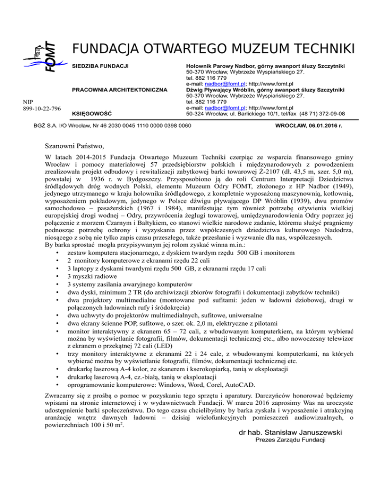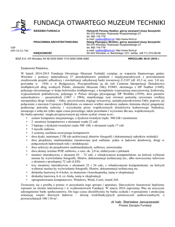 FUNDACJA OTWARTEGO MUZEUM TECHNIKI SIEDZIBA FUNDACJI PRACOWNIA ARCHITEKTONICZNA NIP 899-10-22-796 KSIĘGOWOŚĆ Holownik Parowy Nadbor, górny awanport śluzy Szczytniki 50-370 Wrocław, Wybrzeże Wyspiańskiego 27. tel. 882 116 779 e-mail: [email protected]; http://www.fomt.pl Dźwig Pływający Wróblin, górny awanport śluzy Szczytniki 50-370 Wrocław, Wybrzeże Wyspiańskiego 27. tel. 882 116 779 e-mail: [email protected]; http://www.fomt.pl 50-324 Wrocław, ul. Barlickiego 10/1, tel/fax (48 71) 372-09-08 BGŻ S.A. I/O Wrocław, Nr 46 2030 0045 1110 0000 0398 0060 WROCŁAW, 06.01.2016 r. Szanowni Państwo, W latach 2014-2015 Fundacja Otwartego Muzeum Techniki czerpiąc ze wsparcia finansowego gminy Wrocław i pomocy materiałowej 57 przedsiębiorstw polskich i międzynarodowych z powodzeniem zrealizowała projekt odbudowy i rewitalizacji zabytkowej barki towarowej Ż-2107 (dł. 43,5 m, szer. 5,0 m), powstałej w 1936 r. w Bydgoszczy. Przysposobiono ją do roli Centrum Interpretacji Dziedzictwa śródlądowych dróg wodnych Polski, elementu Muzeum Odry FOMT, złożonego z HP Nadbor (1949), jedynego utrzymanego w kraju holownika śródlądowego, z kompletnie wyposażoną maszynownią, kotłownią, wyposażeniem pokładowym, jedynego w Polsce dźwigu pływającego DP Wróblin (1939), dwu promów samochodowo – pasażerskich (1967 i 1984), manifestując tym również potrzebę ożywienia wielkiej europejskiej drogi wodnej – Odry, przywrócenia żeglugi towarowej, umiędzynarodowienia Odry poprzez jej połączenie z morzem Czarnym i Bałtykiem, co stanowi wielkie narodowe zadanie, któremu służyć pragniemy podnosząc potrzebę ochrony i wyzyskania przez współczesnych dziedzictwa kulturowego Nadodrza, niosącego z sobą nie tylko zapis czasu przeszłego, także przesłanie i wyzwanie dla nas, współczesnych. By barka sprostać mogła przypisywanym jej rolom zyskać winna m.in.: • zestaw komputera stacjonarnego, z dyskiem twardym rzędu 500 GB i monitorem • 2 monitory komputerowe z ekranami rzędu 22 cali • 3 laptopy z dyskami twardymi rzędu 500 GB, z ekranami rzędu 17 cali • 3 myszki radiowe • 3 systemy zasilania awaryjnego komputerów • dwa dyski, minimum 2 TR (do archiwizacji zbiorów fotografii i dokumentacji zabytków techniki) • dwa projektory multimedialne (montowane pod sufitami: jeden w ładowni dziobowej, drugi w połączonych ładowniach rufy i śródokręcia) • dwa uchwyty do projektorów multimedialnych, sufitowe, uniwersalne • dwa ekrany ścienne POP, sufitowe, o szer. ok. 2,0 m, elektryczne z pilotami • monitor interaktywny z ekranem 65 – 72 cali, z wbudowanym komputerkiem, na którym wybierać można by wyświetlanie fotografii, filmów, dokumentacji technicznej etc., albo nowoczesny telewizor z ekranem o przekątnej 72 cali (LED) • trzy monitory interaktywne z ekranami 22 i 24 cale, z wbudowanymi komputerkami, na których wybierać można by wyświetlanie fotografii, filmów, dokumentacji technicznej etc. • drukarkę laserową A-4 kolor, ze skanerem i kserokopiarką, tanią w eksploatacji • drukarkę laserową A-4, cz.-białą, tanią w eksploatacji • oprogramowanie komputerowe: Windows, Word, Corel, AutoCAD. Zwracamy się z prośbą o pomoc w pozyskaniu tego sprzętu i aparatury. Darczyńców honorować będziemy wpisami na stronie internetowej i w wydawnictwach Fundacji. W marcu 2016 zaprosimy Was na uroczyste udostępnienie barki społeczeństwu. Do tego czasu chcielibyśmy by barka zyskała i wyposażenie i atrakcyjną aranżację wnętrz dawnych ładowni – dzisiaj wielofunkcyjnych pomieszczeń audiowizualnych, o powierzchniach 100 i 50 m2. dr hab. Stanisław Januszewski Prezes Zarządu Fundacji