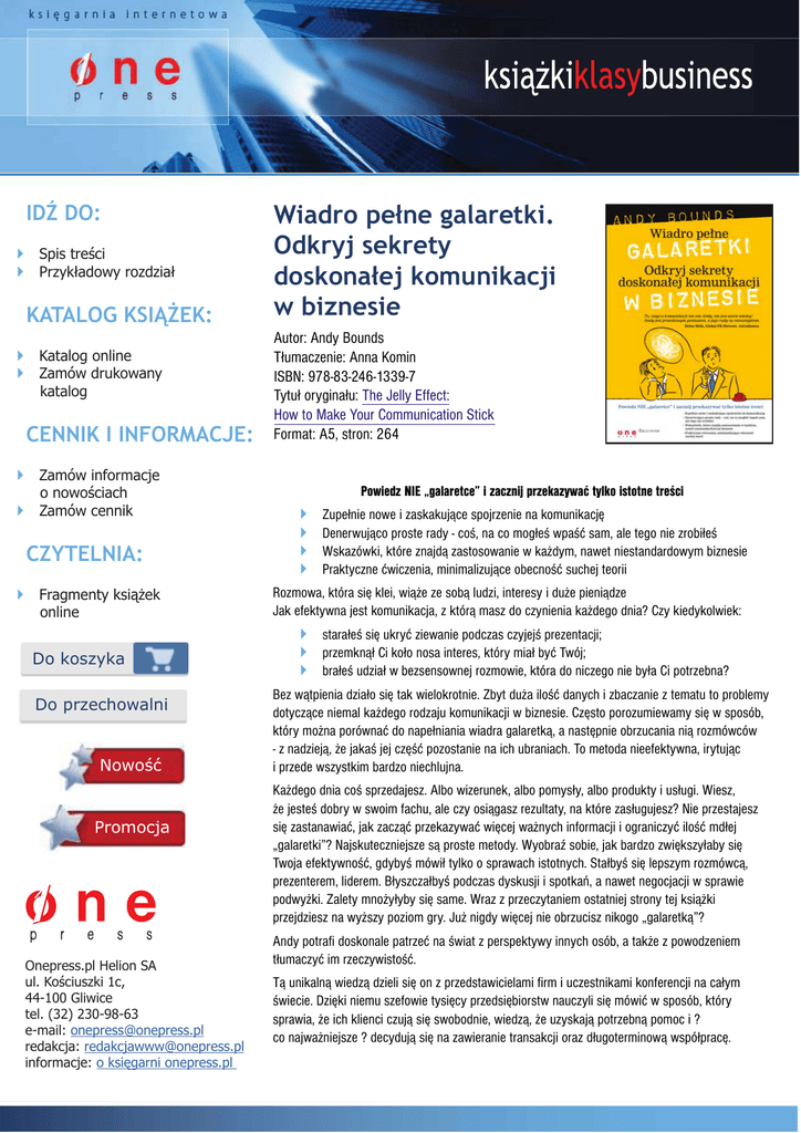 IDŹ DO: ! ! Spis treści Przykładowy rozdział KATALOG KSIĄŻEK: ! ! Katalog online Zamów drukowany katalog CENNIK I INFORMACJE: Zamów informacje o nowościach ! Zamów cennik Wiadro pełne galaretki. Odkryj sekrety doskonałej komunikacji w biznesie Autor: Andy Bounds T³umaczenie: Anna Komin ISBN: 978-83-246-1339-7 Tytu³ orygina³u: The Jelly Effect: How to Make Your Communication Stick Format: A5, stron: 264 ! CZYTELNIA: ! Fragmenty książek online Do koszyka Do przechowalni Nowość Promocja Onepress.pl Helion SA ul. Kościuszki 1c, 44-100 Gliwice tel. (32) 230-98-63 e-mail: [email protected] redakcja: [email protected] informacje: o księgarni onepress.pl Powiedz NIE „galaretce” i zacznij przekazywaæ tylko istotne treœci ! ! ! ! Zupe³nie nowe i zaskakuj¹ce spojrzenie na komunikacjê Denerwuj¹co proste rady - coœ, na co mog³eœ wpaœæ sam, ale tego nie zrobi³eœ Wskazówki, które znajd¹ zastosowanie w ka¿dym, nawet niestandardowym biznesie Praktyczne æwiczenia, minimalizuj¹ce obecnoœæ suchej teorii Rozmowa, która siê klei, wi¹¿e ze sob¹ ludzi, interesy i du¿e pieni¹dze Jak efektywna jest komunikacja, z któr¹ masz do czynienia ka¿dego dnia? Czy kiedykolwiek: ! ! ! stara³eœ siê ukryæ ziewanie podczas czyjejœ prezentacji; przemkn¹³ Ci ko³o nosa interes, który mia³ byæ Twój; bra³eœ udzia³ w bezsensownej rozmowie, która do niczego nie by³a Ci potrzebna? Bez w¹tpienia dzia³o siê tak wielokrotnie. Zbyt du¿a iloœæ danych i zbaczanie z tematu to problemy dotycz¹ce niemal ka¿dego rodzaju komunikacji w biznesie. Czêsto porozumiewamy siê w sposób, który mo¿na porównaæ do nape³niania wiadra galaretk¹, a nastêpnie obrzucania ni¹ rozmówców - z nadziej¹, ¿e jakaœ jej czêœæ pozostanie na ich ubraniach. To metoda nieefektywna, irytuj¹c i przede wszystkim bardzo niechlujna. Ka¿dego dnia coœ sprzedajesz. Albo wizerunek, albo pomys³y, albo produkty i us³ugi. Wiesz, ¿e jesteœ dobry w swoim fachu, ale czy osi¹gasz rezultaty, na które zas³ugujesz? Nie przestajesz siê zastanawiaæ, jak zacz¹æ przekazywaæ wiêcej wa¿nych informacji i ograniczyæ iloœæ md³ej „galaretki”? Najskuteczniejsze s¹ proste metody. WyobraŸ sobie, jak bardzo zwiêkszy³aby siê Twoja efektywnoœæ, gdybyœ mówi³ tylko o sprawach istotnych. Sta³byœ siê lepszym rozmówc¹, prezenterem, liderem. B³yszcza³byœ podczas dyskusji i spotkañ, a nawet negocjacji w sprawie podwy¿ki. Zalety mno¿y³yby siê same. Wraz z przeczytaniem ostatniej strony tej ksi¹¿ki przejdziesz na wy¿szy poziom gry. Ju¿ nigdy wiêcej nie obrzucisz nikogo „galaretk¹”? Andy potrafi doskonale patrzeæ na œwiat z perspektywy innych osób, a tak¿e z powodzeniem t³umaczyæ im rzeczywistoœæ. T¹ unikaln¹ wiedz¹ dzieli siê on z przedstawicielami firm i uczestnikami konferencji na ca³ym œwiecie. Dziêki niemu szefowie tysiêcy przedsiêbiorstw nauczyli siê mówiæ w sposób, który sprawia, ¿e ich klienci czuj¹ siê swobodnie, wiedz¹, ¿e uzyskaj¹ potrzebn¹ pomoc i ? co najwa¿niejsze ? decyduj¹ siê na zawieranie transakcji oraz d³ugoterminow¹ wspó³pracê. Spis treci Podzikowania 11 Kim jestem, aby mówi Wam, jak si komunikowa? 13 1 Jak czyta niniejsz ksik 19 2 Skd nazwa „galaretka”? 23 3 Zasada „galaretki” 29 4 Spotkania biznesowe 41 5 Jak sprzedawa wicej 111 6 Rekomendacje 157 7 Prezentacje 205 8 Jak nie zgin w „Zielonym Korytarzu Zatracenia” 255 Jeli potrzebujesz dodatkowej pomocy} 261 Zasada „galaretki” JAK STWIERDZI , CZY KOMUNIKACJA JEST EFEKTYWNA? Spójrz na ponisze przykady. Czy rezultaty tych akcji uwaasz za pomylne? x x x x Wybierasz si na imprez biznesow. Poznajesz wiele nowych osób, udzielasz si w rozmowach, a po powrocie do domu masz w kieszeni 26 wizytówek. Spotykasz si w kawiarni z potencjalnymi klientami. S pod duym wraeniem Twoich dokona i umiejtnoci jako sprzedawcy. Jeden z klientów wprost Ci uwielbia i wci powtarza, e poleciby Ci kademu. Prowadzisz prezentacj dla pidziesiciu osób. Mimo ogromnego stresu radzisz sobie doskonale. Suchaczom zdaje si podoba to, co mówisz, a nawet wybuchaj miechem w odpowiednich momentach. Na pewno miae ju kiedy do czynienia z podobnymi sytuacjami. W kocu poznawanie nowych partnerów biznesowych, sprzeda, poszukiwanie osób polecajcych czy prowadzenie prezentacji to najczciej spotykane „sytuacje komunikacyjne”. 30 / WIADRO PENE GALARETKI A wic jak mylisz? Czy 26 wizytówek, pochway ze strony potencjalnego klienta, rekomendacje i zadowolona widownia to dobry wynik? Czy wydaje Ci si, e Twoja komunikacja przyniosa podany skutek? Na pierwszy rzut oka rezultaty te robi wraenie. Najwaniejsze jednak jest to, co dzieje si póniej i czy wanie te póniejsze efekty s wystarczajce. 26 wizytówek — wietny wynik. Ale czy wizytówki rozwijaj Twoj dziaalno? Nie. Udao Ci si tylko zmieni obcych ludzi w znajomych. Ta znajomo moe dopiero przynie efekty — przeksztaci si w stae kontakty i tym samym wpyn korzystnie na funkcjonowanie Twojej firmy. Pochway ze strony potencjalnego klienta to dobry pocztek — ale to jeszcze nie sprzeda. A to jedyny efekt, na którym naprawd Ci zaley i do którego chcesz doprowadzi. Klient zachwala Ci innym? To wietnie, ale tylko wtedy, gdy przez jego rekomendacje rzeczywicie zwiksza si liczba Twoich póniejszych spotka handlowych. Prezentacja, która posza gadko? Prezentacje s efektywne tylko wtedy, gdy osigasz dziki nim zamierzony cel — wygrywasz przetarg, komisja akceptuje Twój pomys itd. A wic — komunikacja przynosi rezultaty tylko wtedy, gdy w efekcie dostajesz to, czego chcesz, jak pokazuje rysunek 3.1. Twój najwaniejszy rezultat to okienko po prawej stronie — rozwijanie dziaalnoci. Ta ksika pomoe Ci rozbudowa biznes dziki efektywnej komunikacji podczas imprez, spotka handlowych, poszukiwania osób, które polec Ci innym, lub prowadzenia prezentacji. ZASADA „GALARETKI” / 31 Rysunek 3.1. Efektywna komunikacja ZASADA „WIADRA” — KLUC