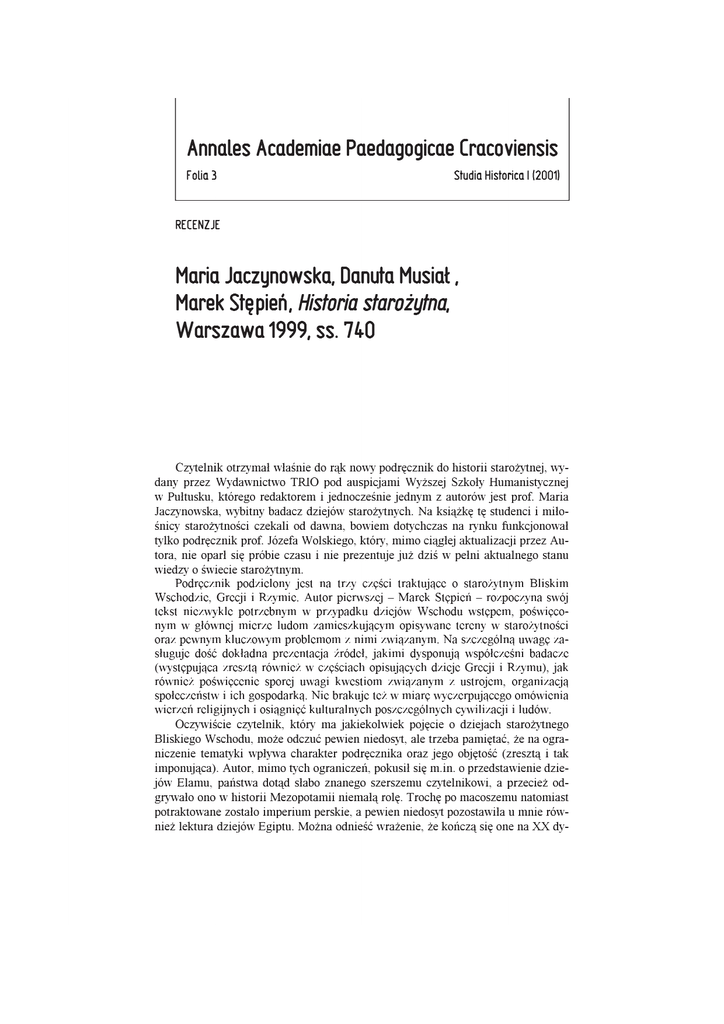 A A Folia 3 Studia Historica I (2001) RECENZJE M aria Jaczynow ska, Danuta M u s ia t, M arek Stępień, Historia starożytna, W a rs z a w a 1999, ss. 7 4 0 Czytelnik otrzymał właśnie do rąk nowy podręcznik do historii starożytnej, wydany przez Wydawnictwo TRIO pod auspicjami Wyższej Szkoły Humanistycznej w Pułtusku, którego redaktorem i jednocześnie jednym z autorów jest prof. Maria Jaczynowska, wybitny badacz dziejów starożytnych. Na książkę tę studenci i miłośnicy starożytności czekali od dawna, bowiem dotychczas na rynku funkcjonował tylko podręcznik prof. Józefa Wolskiego, który, mimo ciągłej aktualizacji przez Autora, nie oparł się próbie czasu i nie prezentuje już dziś w pełni aktualnego stanu wiedzy o świecie starożytnym. Podręcznik podzielony jest na trzy części traktujące o starożytnym Bliskim Wschodzie, Grecji i Rzymie. Autor pierwszej - Marek Stępień - rozpoczyna swój tekst niezwykle potrzebnym w przypadku dziejów Wschodu wstępem, poświęconym w głównej mierze ludom zamieszkującym opisywane tereny w starożytności oraz pewnym kluczowym problemom z nimi związanym. Na szczególną uwagę zasługuje dość dokładna prezentacja źródeł, jakimi dysponują współcześni badacze (występująca zresztą również w częściach opisujących dzieje Grecji i Rzymu), jak również poświęcenie sporej uwagi kwestiom związanym z ustrojem, organizacją społeczeństw i ich gospodarką. Nie brakuje też w miarę wyczerpującego omówienia wierzeń religijnych i osiągnięć kulturalnych poszczególnych cywilizacji i ludów. Oczywiście czytelnik, który ma jakiekolwiek pojęcie o dziejach starożytnego Bliskiego Wschodu, może odczuć pewien niedosyt, ale trzeba pamiętać, że na ograniczenie tematyki wpływa charakter podręcznika oraz jego objętość (zresztą i tak imponująca). Autor, mimo tych ograniczeń, pokusił się m.in. o przedstawienie dziejów Elamu, państwa dotąd słabo znanego szerszemu czytelnikowi, a przecież odgrywało ono w historii Mezopotamii niemałą rolę. Trochę po macoszemu natomiast potraktowane zostało imperium perskie, a pewien niedosyt pozostawiła u mnie również lektura dziejów Egiptu. Można odnieść wrażenie, że kończą się one na XX dy- 2 nastii, a później nie działo się już nic ciekawego. Wreszcie, jako zajmujący się dziejami starożytnej Palestyny, muszę zwrócić uwagę na dwa błędy merytoryczne, które pojawiły się w tekście. Otóż nazywanie królestwa południowego, które powstało po rozpadzie monarchii Dawida i Salomona, Judeą jest wręcz szkolnym błędem, bowiem w okresie pierwszej świątyni jerozolimskiej mamy do czynienia z królestwem Judy. Termin “Judea” pochodzi dopiero z czasów hellenistycznych. Ponadto kanon Biblii hebrajskiej został rzeczywiście ustalony po zburzeniu drugiej świątyni jerozolimskiej, ale bynajmniej nie w roku 70 po Chr., lecz dopiero około roku 80-100 po Chr. w Javne (nie znamy niestety dokładnej daty). Żeby pozostać przy mankamentach, w tekście dotyczącym Bliskiego Wschodu zamieszczono tylko pięć map, w dodatku czarno-białych! Generalnie trzeba jednak powiedzieć, że Marek Stępień zaprezentował bardzo interesujący i przystępny zarys dziejów starożytnego Bliskiego Wschodu, a jego tekst czytało się z prawdziwą przyjemnością. Autorką drugiej części podręcznika, poświęconej starożytnej Grecji, jest Danuta Musiał. Wbrew pozorom, Autorka nie miała łatwego zadania, choć wydawać by się mogło, że historia Grecji jest już znana stosunkowo dobrze. Zaczęła oczywiście od prezentacji kultury kreteńskiej i mykeńskiej, przy czym opracowanie tej pierwszej pozostawia pewien niedosyt. Bardzo interesujące jest przedstawienie procesu kształtowania się greckiej polis oraz roli arystokracji. Opis historii Grecji w epoce klasycznej nie odbiega od standardów, choć trzeba przyznać, że Autorka wyjaśnia wiele spornych problemów, opierając się na najnowszych badaniach. Sama zresztą ma w nich znaczący udział. Przykładem jest chociażby sprawa Ateńskiego Związku Morskiego, który według Danuty Musiał był faktycznie symmachią, a więc tworem zupełnie innego rodzaju. Nie brak oczywiście i w tej części prezentacji kwestii ustrojowych, społecznych i gospodarczych, a przede wszystkim wspaniałego rozwoju kulturalnego. Wydaje się, że Autorka zbyt mało miejsca poświęciła monarchiom hellenistycznym oraz kulturze tego okresu. Zupełnie kuriozalne jest natomiast zamieszczenie w części greckiej tylko dwóch map! Ogólnie jednak Danuta Musiał zaprezentowała interesujący i przystępnie napisany tekst, poruszający wiele, wydawałoby się nieciekawych problemów, które czytelnicy często pomijają. Po lekturze dziejów starożytnej Grecji w wydaniu Autorki z pewnością nie będą przed nimi uciekać. Autorką trzeciej części, poświęconej dziejom starożytnego Rzymu, jest prof. Maria Jaczynowska, wybitna znawczyni tematu. Jej tekst może być jednak pewnym zaskoczeniem, ponieważ niewiele miejsca, w stosunku do dotychczasowych tendencji, przeznaczyła na omówienie historii politycznej, skupiając się w głównej mierze na kwestiach związanych z rozwojem społeczeństwa rzymskiego (ważny jest tutaj rozdział o walce patrycjuszów z plebejuszami we wczesnym okresie istnienia republiki), ustrojem społeczno-ekonomicznym, kulturą i wierzeniami religijnymi. Pewien niedosyt pozostawia nie do końca wyjaśniona sprawa początków Rzymu, bowiem przedstawienie teorii E. Gjerstada oraz niektórych wyników najnowszych wykopalisk na terenie Rzymu, to chyba trochę za mało. Ważną natomiast nowością jest zwrócenie uwagi na fakt, że kończenie dziejów cesarstwa zachodniorzymskiego na roku 476 po Chr. jest sztuczne, bowiem formalnie do 488 r. po Chr. zwierzchnie- M !"#$%&'( )#*+ M*&+( M,' -+./,0( Historia starożytna... 279 two nad jego terytoriami sprawował cesarz wschodniorzymski Zenon.