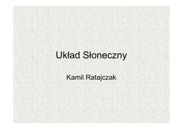 Układ Słoneczny Kamil Ratajczak • • • Układ Słoneczny – układ planetarny, składający się ze Słońca i powiązanych z nim grawitacyjnie ciał niebieskich. Ciała te, to osiem planet, 166 znanych księżyców, pięć planet karłowatych i miliardy małych ciał Układu Słonecznego, do których zalicza się planetoidy, obiekty pasa Kuipera, komety, meteoroidy i pył okołoplanetarny. Zbadane regiony Układu Słonecznego zawierają licząc od Słońca: cztery planety skaliste (Merkury, Wenus, Ziemia, Mars), pas planetoid składający się z małych skalistych ciał, cztery zewnętrzne planety-olbrzymy (Jowisz, Saturn, Uran,Neptun), oraz drugi pas – pas Kuipera, składający się z obiektów skalno-lodowych. Za pasem Kuipera znajduje się dysk rozproszony, dużo dalej heliopauza i w końcu hipotetyczny obłok Oorta. Odkryto także pięć planet karłowatych: Ceres (największy obiekt w pasie planetoid), Pluton (do 2006 uznawany za 9. planetę Układu), Haumea, Makemake (drugi co do wielkości obiekt w pasie Kuipera) i Eris (największy znany obiekt w dysku rozproszonym). Sześć z ośmiu planet i trzy z planet karłowatych mają naturalne satelity, zwane księżycami. Każda z planet zewnętrznych jest otoczona pierścieniami złożonymi z pyłu kosmicznego. Wszystkie planety z wyjątkiem Ziemi i Urana (który zawdzięcza nazwę greckiemu bóstwu Uranosowi) noszą imiona bóstw z mitologii rzymskiej. Merkury • Merkury – najmniejsza i najbliższa Słońcu planeta Układu Słonecznego. Jako planeta wewnętrzna znajduje się dla ziemskiego obserwatora zawsze bardzo blisko Słońca, dlatego jest trudna do obserwacji. Mimo to należy do planet widocznych gołym okiem i była znana już w starożytności. Merkurego dojrzeć można jedynie tuż przed wschodem lub tuż po zachodzie Słońca. Fakturą powierzchni Merkury przypomina Księżyc: są na nim liczne kratery uderzeniowe i praktycznie pozbawiony jest atmosfery. Temperatura powierzchni waha się od −183 °C do 427 °C. W przeciwie ństwie do Księżyca, planeta ma jednak duże żelazne jądro, generujące pole magnetyczne o natężeniu stukrotnie mniejszym od natężenia ziemskiego pola magnetycznego[3]. Wielkość jądra powoduje, że Merkury ma jedną z największych gęstości spośród planet Układu Słonecznego[4] (nieznacznie większą ma Ziemia). Merkury nie posiada naturalnych satelitów. Wenus • Wenus – druga według oddalenia od Słońca planeta Układu Słonecznego. Wenus jest trzecim pod względem jasności ciałem niebieskim po Słońcu i Księżycu widocznym na niebie. Ponieważ obserwacje tej planety są możliwe tylko wieczorem i rano, nazywana jest także: Jutrzenką, Gwiazdą Poranną lub Gwiazdą Wieczorną (starożytni Grecy nazywali ją odpowiednio: Fosforos i Hesperos)[1]. Jest skalnym globem osnutym gęstymi chmurami, które odbijają większość światła słonecznego. Żółtawy kolor chmur atmosfery pochodzi od kwasu siarkowego. Nie posiada naturalnego satelity (odkryto jednak planetoidę 2002 VE68 o średnicy około pół kilometra, pozostającą w rezonansie orbitalnym 1:1 z Wenus, z tej racji mogącej być nazywaną quasi-księżycem Wenus). Znak Wenus oznacza płeć kobiety. Jej nazwa wzięła się od rzymskiej bogini miłości, Wenus. Ziemia • • • • Ziemia (łac. Terra) − trzecia licząc od Słońca, a piąta co do wielkości planeta Układu Słonecznego. Pod względem średnicy, masy i gęstości jest to największa planeta skalista Układu. Ziemia, zamieszkana przez miliony gatunków, wliczając w to człowieka[6], jest jedynym znanym miejscem we wszechświecie, w którym występuje życie[7]. Planeta uformowała się 4,54 ± 0,05 miliarda lat temu[8], a życie pojawiło się na jej powierzchni w ciągu pierwszego miliarda lat po uformowaniu. Następnie, biosfera ziemska wpłynęła na atmosferę i inne czynniki abiotyczne planety, umożliwiając rozwój organizmów aerobowych oraz powstanie ozonosfery. Rozwój życia na lądzie umożliwiła powłoka ozonowa, zmniejszająca natężenie promieniowania ultrafioletowego[9] oraz magnetosfera, odbijająca cząstki wiatru słonecznego. Litosfera podzielona jest na kilkadziesiąt segmentów nazywanych płytami tektonicznymi, które przez miliony lat przesuwają się względem siebie, co prowadzi do znacznej zmiany położenia kontynentów w czasie. Powierzchnię w 70,8% zajmuje woda wszechoceanu zawarta w morzach i oceanach; pozostałe 29,2% stanowią kontynenty i wyspy. Niezbędnej do życia na Ziemi wody w stanie ciekłym nie wykryto na powierzchni innych ciał niebieskich[A 3][A 4]. Wnętrze Ziemi składa się z grubego płaszcza, płynnego jądra zewnętrznego (generującego pole magnetyczne) oraz stałego jądra wewnętrznego. Ziemia oddziałuje grawitacyjnie z innymi ciałami w przestrzeni kosmicznej. Planeta wykonuje jedno okrążenie wokół Słońca raz na każde 366,256 obrotów wokół własnej osi. Czas jednego okrążenia wokół Słońca nazywa się rokiem gwiazdowym i odpowiada 365,256 dniom czasu słonecznego[A 5]. Nachylenie osi Ziemi do prostej prostopadłej do płaszczyzny orbity wynosi 23,45°, co prowadzi do rocznych waha ń oświetlenia, które powodują m.in. występowanie pór roku. Wokół Ziemi krąży jeden naturalny satelita – Księżyc, który orbituje wokół niej od ok. 4,53 miliarda lat. Wywołuje on pływy morskie i stabilizuje kąt nachylenia osi obrotu względem orbity. Bombardowanie przez komety we wczesnej historii Ziemi przyczyniło się do powstania oceanów[10], a upadki pojedynczych planetoid mogły prowadzić do niektórych masowych wymierań. Mars • Mars – czwarta według oddalenia od Słońca planeta Układu Słonecznego. Nazwa planety pochodzi od imienia rzymskiego boga wojny – Marsa. Zawdzięcza ją swej barwie, która przy obserwacji wydaje się być rdzawo-czerwona i kojarzyła się starożytnym z pożogą wojenną. Postrzegany odcień wynika stąd, że powierzchnia plane
