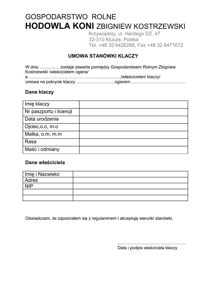 GOSPODARSTWO ROLNE HODOWLA KONI ZBIGNIEW KOSTRZEWSKI Krzywopłoty, ul. Hardego DZ. 47 32-310 Klucze, Polska Tel. +48 32 6426288, Fax +48 32 6471672 UMOWA STANÓWKI KLACZY W dniu ………….. zostaje zawarta pomiędzy Gospodarstwem Rolnym Zbigniew Kostrzewski /właścicielem ogiera/ a …………………………………………..................../właścicielem klaczy/ umowa na pokrycie klaczy ………………………ogierem ……………………………….. Dane klaczy Imię klaczy Nr paszportu i licencji Data urodzenia Ojciec,o.o, m.o Matka, o.m, m.m Rasa Maść i odmiany Dane właściciela Imię i Nazwisko Adres NIP Oświadczam, że zapoznałem się z regulaminem i akceptuję warunki stanówki. ………………………………………… Data i podpis właściciela klaczy