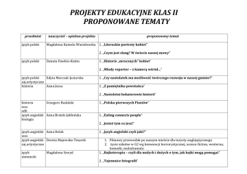 PROJEKTY EDUKACYJNE KLAS II PROPONOWANE TEMATY przedmiot język polski nauczyciel – opiekun projektu proponowany temat Magdalena Kamola-Wasielewska 1. „Literackie portrety kobiet” 2. „Czym jest slang? W świecie naszej mowy” język polski Danuta Pawkin-Kmita 1. „Historie „mrocznych” kobiet” 2. „Młody reporter – z kamerą wśród…” język polski Edyta Marczak-Jasiurska zaj.artystyczne historia Anna Jessa 1. „Czy nastolatek ma możliwość twórczego rozwoju w naszej gminie?” 1. „Z pamiętnika powstańca” 2. „Nastoletni bohaterowie historii” historia Grzegorz Rudalski wos edb język angielski Anna Bratek-Jabłońska biologia 1. „Polska pierwszych Piastów” 1. „Eating connects people” 2. „Jesteś tym co jesz!” język angielski Anna Helak wos język angielski Dorota Majewska-Tesarek zaj.artystyczne język niemiecki Magdalena Szwyd 1. „Język angielski czyli jaki?” 1. Filmowy przewodnk po naszym mieście dla turysty anglojęzycznego 2. życie szkolne w G2 wg konwencji horrorystycznej, scence-fiction, westernu, komedii, melodramatu 1. „Bajkoterapia – czyli dla małych i dużych o tym, jak bajki mogą pomagać” 2. „Tajemnice fotografii” język niemiecki Joanna Schmidt 1. „System szkolnictwa w Niemczech – niemiecka szkoła” 2. „Police wczoraj i dziś – historia Polic” matematyka Joanna Koral 1. „Bryły platońskie. Co wiem o Platonie i jego bryłach?” 2. „Czy pszczoły znają geometrię? Z wizytą w ulu czyli wielokąty foremne w przyrodzie” matematyka Joanna Myśko 1. "Fraktale wokół nas – chaos czy porządek, matematyka czy sztuka?” 2. „Dlaczego warto uczyć się matematyki?” fizyka Anna Sabo 1. „Czy energia jądrowa jest bezpieczna dla człowieka i środowiska?” 2. „Wpływ promieniowania cieplnego na naszą planetę” matematyka informatyka Małgorzata Tadla 1. „Chroń środowisko, chroń swoją planetę” chemia fizyka informatyka geografia Sylwia Lesiak 1. „Konserwanty w produktach spożywczych” Danuta Gil 1. „Wypoczynek i rekreacja w Puszczy Wkrzańskiej” CELE PROJEKTU Na pewno już wiesz, jak bardzo nasza planeta jest zanieczyszczona przez cywilizację. Wyobraź sobie, że jesteś ekologiem, a twoim zadaniem jest nie tylko lokalizowanie miejsc, w których powstają dzikie wysypiska śmieci, ale uświadamianie i zaprezentowanie, jaki zgubny wpływ mają takie miejsca na zatrucie środowiska. 2. „Gospodarka leśna w powiecie polickim” biologia Marta Guentzel 1. "Wędrówki ptaków – obserwacje ornitologiczne" 2. "Poznać, pokochać las" biblioteka Iwona Majzel-Kędzierska 1. „Jak zmieniała się książka? Od tabliczki glinianej do e-booka” informatyka 2. „Multimedialny spacer po szkole – film promujący szkołę” muzyka Renata Zarzycka zaj.artystyczne 1. „Czy współczesna muzyka pop to sztuka czy rzemiosło?” 2. „Klasycyzm – Beethoven i Oda do radości” religia Teresa Szymańska 1. „Misyjna działalność Kościoła” religia Ks. Tomasz Krzanicki 1. "Templariusze na Pomorzu Zachodnim” wf Aleksandra Borkowska 1. „Pływanie – sport dla każdego” wf Anna Sobańska 1. „Jak zorganizować dzień sportu szkolnego?” wf biologia Dorota Wojtasik 1. "Technologie przyszłości"