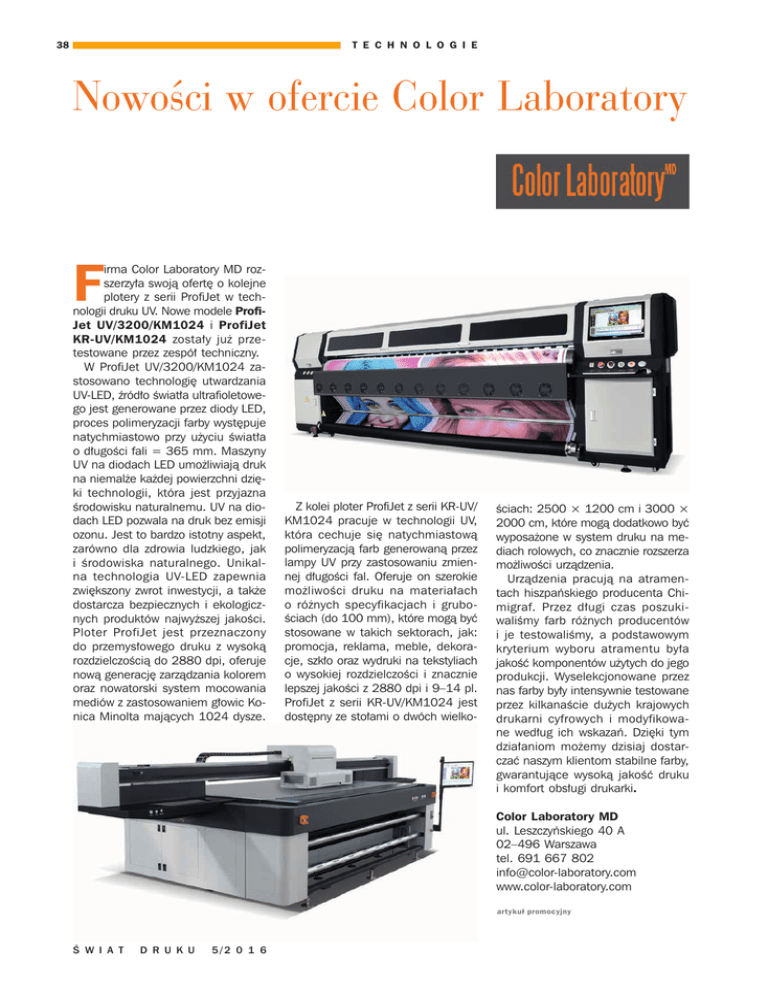 T E C H N O L O G I E 38 Nowości w ofercie Color Laboratory F irma Color Laboratory MD rozszerzyła swoją ofertę o kolejne plotery z serii ProfiJet w technologii druku UV. Nowe modele ProfiJet UV/3200/KM1024 i ProfiJet KR-UV/KM1024 zostały już przetestowane przez zespół techniczny. W ProfiJet UV/3200/KM1024 zastosowano technologię utwardzania UV-LED, źródło światła ultrafioletowego jest generowane przez diody LED, proces polimeryzacji farby występuje natychmiastowo przy użyciu światła o długości fali = 365 mm. Maszyny UV na diodach LED umożliwiają druk na niemalże każdej powierzchni dzięki technologii, która jest przyjazna środowisku naturalnemu. UV na diodach LED pozwala na druk bez emisji ozonu. Jest to bardzo istotny aspekt, zarówno dla zdrowia ludzkiego, jak i środowiska naturalnego. Unikalna technologia UV-LED zapewnia zwiększony zwrot inwestycji, a także dostarcza bezpiecznych i ekologicznych produktów najwyższej jakości. Ploter ProfiJet jest przeznaczony do przemysłowego druku z wysoką rozdzielczością do 2880 dpi, oferuje nową generację zarządzania kolorem oraz nowatorski system mocowania mediów z zastosowaniem głowic Konica Minolta mających 1024 dysze. Z kolei ploter ProfiJet z serii KR-UV/ KM1024 pracuje w technologii UV, która cechuje się natychmiastową polimeryzacją farb generowaną przez lampy UV przy zastosowaniu zmiennej długości fal. Oferuje on szerokie możliwości druku na materiałach o różnych specyfikacjach i grubościach (do 100 mm), które mogą być stosowane w takich sektorach, jak: promocja, reklama, meble, dekoracje, szkło oraz wydruki na tekstyliach o wysokiej rozdzielczości i znacznie lepszej jakości z 2880 dpi i 9–14 pl. ProfiJet z serii KR-UV/KM1024 jest dostępny ze stołami o dwóch wielko- ściach: 2500 × 1200 cm i 3000 × 2000 cm, które mogą dodatkowo być wyposażone w system druku na mediach rolowych, co znacznie rozszerza możliwości urządzenia. Urządzenia pracują na atramentach hiszpańskiego producenta Chimigraf. Przez długi czas poszukiwaliśmy farb różnych producentów i je testowaliśmy, a podstawowym kryterium wyboru atramentu była jakość komponentów użytych do jego produkcji. Wyselekcjonowane przez nas farby były intensywnie testowane przez kilkanaście dużych krajowych drukarni cyfrowych i modyfikowane według ich wskazań. Dzięki tym działaniom możemy dzisiaj dostarczać naszym klientom stabilne farby, gwarantujące wysoką jakość druku i komfort obsługi drukarki. Color Laboratory MD ul. Leszczyńskiego 40 A 02–496 Warszawa tel. 691 667 802 [email protected] www.color-laboratory.com artykuł promocyjny Ś W I A T D R U K U 5/2 0 1 6