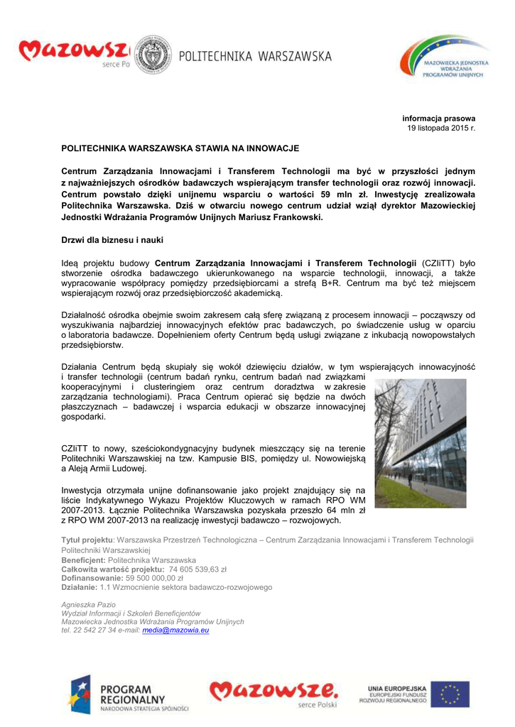 informacja prasowa 19 listopada 2015 r. POLITECHNIKA WARSZAWSKA STAWIA NA INNOWACJE Centrum Zarządzania Innowacjami i Transferem Technologii ma być w przyszłości jednym z najważniejszych ośrodków badawczych wspierającym transfer technologii oraz rozwój innowacji. Centrum powstało dzięki unijnemu wsparciu o wartości 59 mln zł. Inwestycję zrealizowała Politechnika Warszawska. Dziś w otwarciu nowego centrum udział wziął dyrektor Mazowieckiej Jednostki Wdrażania Programów Unijnych Mariusz Frankowski. Drzwi dla biznesu i nauki Ideą projektu budowy Centrum Zarządzania Innowacjami i Transferem Technologii (CZIiTT) było stworzenie ośrodka badawczego ukierunkowanego na wsparcie technologii, innowacji, a także wypracowanie współpracy pomiędzy przedsiębiorcami a strefą B+R. Centrum ma być też miejscem wspierającym rozwój oraz przedsiębiorczość akademicką. Działalność ośrodka obejmie swoim zakresem całą sferę związaną z procesem innowacji – począwszy od wyszukiwania najbardziej innowacyjnych efektów prac badawczych, po świadczenie usług w oparciu o laboratoria badawcze. Dopełnieniem oferty Centrum będą usługi związane z inkubacją nowopowstałych przedsiębiorstw. Działania Centrum będą skupiały się wokół dziewięciu działów, w tym wspierających innowacyjność i transfer technologii (centrum badań rynku, centrum badań nad związkami kooperacyjnymi i clusteringiem oraz centrum doradztwa w zakresie zarządzania technologiami). Praca Centrum opierać się będzie na dwóch płaszczyznach – badawczej i wsparcia edukacji w obszarze innowacyjnej gospodarki. CZIiTT to nowy, sześciokondygnacyjny budynek mieszczący się na terenie Politechniki Warszawskiej na tzw. Kampusie BIS, pomiędzy ul. Nowowiejską a Aleją Armii Ludowej. Inwestycja otrzymała unijne dofinansowanie jako projekt znajdujący się na liście Indykatywnego Wykazu Projektów Kluczowych w ramach RPO WM 2007-2013. Łącznie Politechnika Warszawska pozyskała przeszło 64 mln zł z RPO WM 2007-2013 na realizację inwestycji badawczo – rozwojowych. Tytuł projektu: Warszawska Przestrzeń Technologiczna – Centrum Zarządzania Innowacjami i Transferem Technologii Politechniki Warszawskiej Beneficjent: Politechnika Warszawska Całkowita wartość projektu: 74 605 539,63 zł Dofinansowanie: 59 500 000,00 zł Działanie: 1.1 Wzmocnienie sektora badawczo-rozwojowego Agnieszka Pazio Wydział Informacji i Szkoleń Beneficjentów Mazowiecka Jednostka Wdrażania Programów Unijnych tel. 22 542 27 34 e-mail: [email protected] Marta Milewska Rzeczniczka Prasowa Urząd Marszałkowski Województwa Mazowieckiego tel. 22 59 07 602, kom. 510 591 974 e-mail: [email protected]