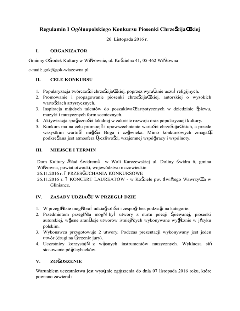 Regulamin I Ogólnopolskiego Konkursu Piosenki Chrześcijańskiej 26 Listopada 2016 r. I. ORGANIZATOR Gminny Ośrodek Kultury w Wiązownie, ul. Kościelna 41, 05-462 Wiązowna e-mail: [email protected] II. CELE KONKURSU 1. Popularyzacja twórczości chrześcijańskiej, poprzez wyrażanie uczuć religijnych. 2. Promowanie i propagowanie piosenki chrześcijańskiej, autorskiej o wysokich wartościach artystycznych. 3. Inspiracja młodych talentów do poszukiwań artystycznych w dziedzinie śpiewu, muzyki i muzycznych form scenicznych. 4. Aktywizacja społeczności lokalnej w zakresie rozwoju oraz popularyzacji kultury. 5. Konkurs ma na celu promocję i upowszechnienie wartości chrześcijańskich, a przede wszystkim wartość miłości Boga i człowieka. Mimo konkursowych zmagań, podkreślana jest atmosfera życzliwości, wzajemnej współpracy i wspólnoty. III. MIEJSCE I TERMIN Dom Kultury „Nad Świdrem” w Woli Karczewskiej ul. Doliny Świdra 6, gmina Wiązowna, powiat otwocki, województwo mazowieckie 26.11.2016 r. – PRZESŁUCHANIA KONKURSOWE 26.11.2016 r. – KONCERT LAUREATÓW - w Kościele pw. Świętego Wawrzyńca w Gliniance. IV. ZASADY UDZIAŁU W PRZEGLĄDZIE 1. W przeglądzie mogą brać udział soliści i zespoły bez podziału na kategorie. 2. Przedmiotem przeglądu mogą być utwory z nurtu poezji śpiewanej, piosenki autorskiej, własne aranżacje utworów istniejących wykonywane wyłącznie w języku polskim. 3. Wykonawca przygotowuje 2 utwory. Podczas prezentacji wykonywany jest jeden utwór (drugi na życzenie jury). 4. Uczestnicy korzystają z własnych instrumentów muzycznych. Wyklucza się stosowanie półplaybacków. V. ZGŁOSZENIE Warunkiem uczestnictwa jest wysłanie zgłoszenia do dnia 07 listopada 2016 roku, które powinno zawierać: - kartę zgłoszenia z załączonymi tekstami wykonywanych utworów - nagranie w formacie mp3 – 2 piosenki o tematyce określonej w regulaminie (nagranie nie musi być profesjonalne, ale jakość techniczna nie może utrudniać dokonania oceny i kwalifikacji jurorom). Zgłoszenia należy przesyłać na adres: [email protected] lub nagrane na płytę CD przesłane na adres Gminny Ośrodek Kultury w Wiązownie ul. Kościelna 41, 05-462 Wiązowna. W otwartym koncercie konkursowym 26 listopada 2016 roku wystąpią wykonawcy, zakwalifikowani po przesłuchaniu otrzymanego przez organizatora materiału audio. Wyniki kwalifikacji będą opublikowane w dniu 14 listopada 2016 roku na stronach www.gok-wiazowna.pl oraz www.facebook.com/wiazowna.gok/ VI. ŚWIADCZENIA - organizatorzy zapewniają podczas przeglądu nagłośnienie oraz czas na krótką próbę przed prezentacjami konkursowymi (wg podanego w późniejszym terminie harmonogramu imprezy), - koszty przejazdu uczestników przeglądu pokrywają instytucje delegujące lub sami wykonawcy, - możliwość przenocowania w Domu Kultury „Nad Świdrem” w Woli Karczewskiej oraz skorzystania z infrastruktury Domu Kultury (Karimaty, śpiwory we własnym zakresie). VII. JURY Jury jest powołane przez Organizatora na czas trwania konkursu i ocenia prezentacje według następujących kryteriów: - dobór repertuaru zgodny z tematyką festiwalu, - muzykalność i warunki głosowe wykonawcy, - interpretacje tekstu, - oryginalność kompozycji, aranżacji i sposobu wykonania, - ogólny wyraz artystyczny. Werdykt Jury jest ustalony w drodze wspólnej dyskusji i jest ostateczny. VIII. NAGRODY Laureaci konkursu wyłonieni przez Jury otrzymują następujące nagrody pieniężne: I miejsce – 3.000zł, II miejsce – 2.000zł, III miejsce – 1.000zł Projekt współfinansowany ze środków Samorządu Województwa Mazowieckiego. Dodatkowo nagrody ufundowane przez darczyńców. Wysokość nagród podana jest w kwocie brutto. Laureat I miejsca zobowiązany będzie do wykonania 30 minutowego recitalu podczas kolejnej edycji Konkursu, a przyjęcie nagrody oznacza akceptację tego zapisu. IX. POSTANOWIENIA KOŃCOWE Organizator zastrzega sobie prawo do filmowania i fotografowania prezentacji, a powstały materiał będzie wyłączną własnością Organizatora. Szczegółowych informacji udziela koordynator konkursu: Paulina Sokół, GOK Wiązowna, tel. 22 780 41 79, e-mail [email protected] Przewidywany program Konkursu Piosenki Chrześcijańskiej, podany zostanie wraz z listą osób zakwalifikowanych do przesłuchań konkursowych.