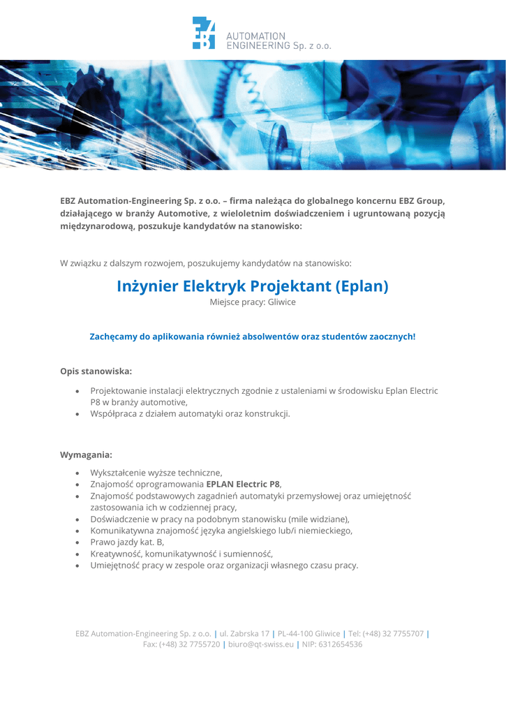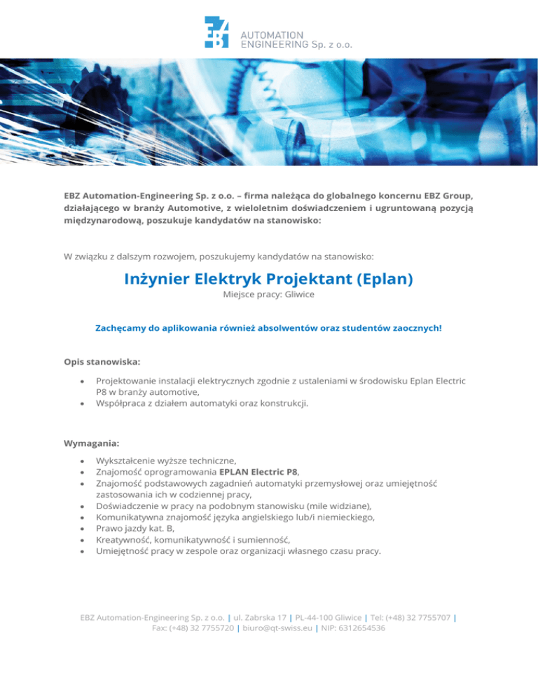 EBZ Automation-Engineering Sp. z o.o. – firma należąca do globalnego koncernu EBZ Group, działającego w branży Automotive, z wieloletnim doświadczeniem i ugruntowaną pozycją międzynarodową, poszukuje kandydatów na stanowisko: W związku z dalszym rozwojem, poszukujemy kandydatów na stanowisko: Inżynier Elektryk Projektant (Eplan) Miejsce pracy: Gliwice Zachęcamy do aplikowania również absolwentów oraz studentów zaocznych! Opis stanowiska: Projektowanie instalacji elektrycznych zgodnie z ustaleniami w środowisku Eplan Electric P8 w branży automotive, Współpraca z działem automatyki oraz konstrukcji. Wymagania: Wykształcenie wyższe techniczne, Znajomość oprogramowania EPLAN Electric P8, Znajomość podstawowych zagadnień automatyki przemysłowej oraz umiejętność zastosowania ich w codziennej pracy, Doświadczenie w pracy na podobnym stanowisku (mile widziane), Komunikatywna znajomość języka angielskiego lub/i niemieckiego, Prawo jazdy kat. B, Kreatywność, komunikatywność i sumienność, Umiejętność pracy w zespole oraz organizacji własnego czasu pracy. EBZ Automation-Engineering Sp. z o.o. | ul. Zabrska 17 | PL-44-100 Gliwice | Tel: (+48) 32 7755707 | Fax: (+48) 32 7755720 | [email protected] | NIP: 6312654536 Oferujemy: Atrakcyjne i stabilne warunki zatrudnienia (umowa o pracę), Dodatkowy system premiowania, Możliwość podnoszenia kwalifikacji zawodowych oraz poznania najnowszych technologii w branży automotive, Kartę Multisport oraz inne benefity pracownicze, Przyjazną atmosferę oraz pracę w zespole specjalistów w dziedzinie projektowania, Niezbędne narzędzia do wykonywania pracy. Osoby zainteresowane prosimy o przesyłanie aplikacji na adres: [email protected] Prosimy o dopisanie następującej klauzuli: „Wyrażam zgodę na przetwarzanie moich danych osobowych przez RW Swiss Automation Sp. z o.o. z siedzibą w Gliwicach (44-100), ul. Zabrska 17 (dotyczy również danych wykraczających poza zakres wskazany w art. 221 Kodeksu pracy) w związku z prowadzoną rekrutacją, a także w przyszłych procesach rekrutacji. Moja zgoda na przetwarzanie danych jest ważna do odwołania. Zostałem poinformowany/a o prawie wglądu i poprawiania treści oraz możliwości usunięcia moich danych”. Zastrzegamy, że skontaktujemy się wyłącznie z wybranymi kandydatami. EBZ Automation-Engineering Sp. z o.o. | ul. Zabrska 17 | PL-44-100 Gliwice | Tel: (+48) 32 7755707 | Fax: (+48) 32 7755720 | [email protected] | NIP: 6312654536