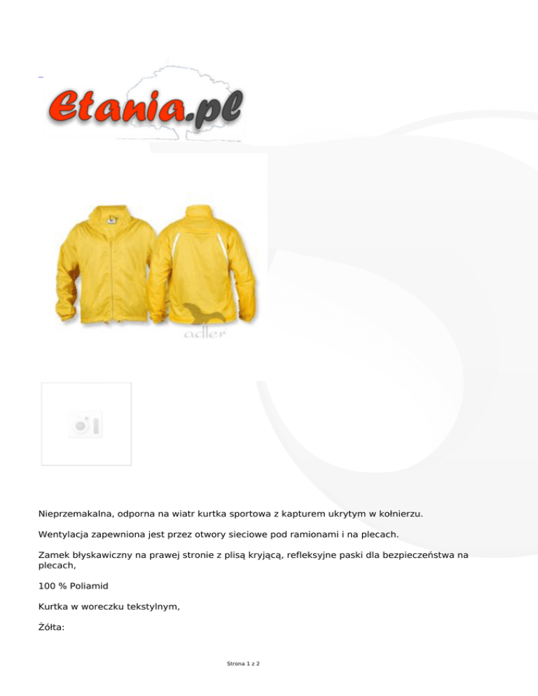 Nieprzemakalna, odporna na wiatr kurtka sportowa z kapturem ukrytym w kołnierzu. Wentylacja zapewniona jest przez otwory sieciowe pod ramionami i na plecach. Zamek błyskawiczny na prawej stronie z plisą kryjącą, refleksyjne paski dla bezpieczeństwa na plecach, 100 % Poliamid Kurtka w woreczku tekstylnym, Żółta: Strona 1 z 2 TABELA ROZMIARÓW Rozmiar Szerokość klatki piersiowej Długość Długość rękawa Rozmiary XS - XS 56 S 60 M 62 L 64 XL 66 XXL 68 XX 71 65 62 70 65 72 66 74 67 76 68 78 69 81 70 XXL - cena 39,00 Rozmiar XXXL - cena 79,00 Inne kolory - 79,00 zł Strona 2 z 2