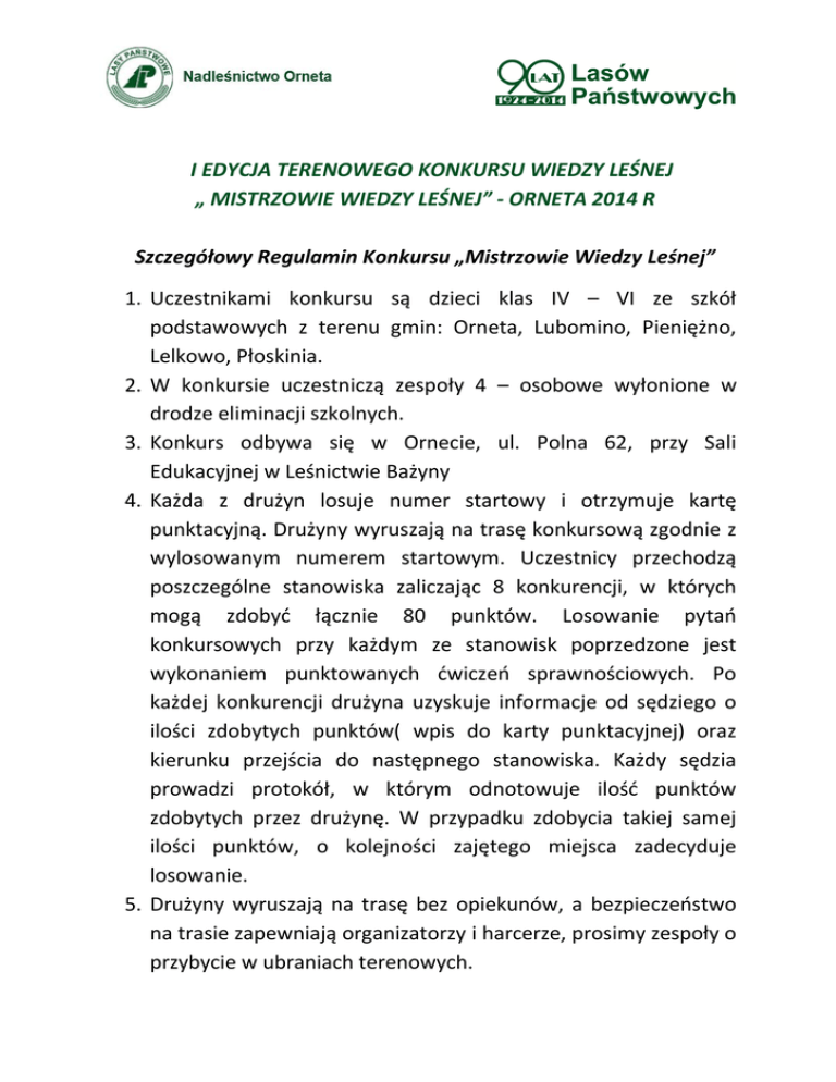 I EDYCJA TERENOWEGO KONKURSU WIEDZY LEŚNEJ „ MISTRZOWIE WIEDZY LEŚNEJ” - ORNETA 2014 R Szczegółowy Regulamin Konkursu „Mistrzowie Wiedzy Leśnej” 1. Uczestnikami konkursu są dzieci klas IV – VI ze szkół podstawowych z terenu gmin: Orneta, Lubomino, Pieniężno, Lelkowo, Płoskinia. 2. W konkursie uczestniczą zespoły 4 – osobowe wyłonione w drodze eliminacji szkolnych. 3. Konkurs odbywa się w Ornecie, ul. Polna 62, przy Sali Edukacyjnej w Leśnictwie Bażyny 4. Każda z drużyn losuje numer startowy i otrzymuje kartę punktacyjną. Drużyny wyruszają na trasę konkursową zgodnie z wylosowanym numerem startowym. Uczestnicy przechodzą poszczególne stanowiska zaliczając 8 konkurencji, w których mogą zdobyć łącznie 80 punktów. Losowanie pytań konkursowych przy każdym ze stanowisk poprzedzone jest wykonaniem punktowanych ćwiczeń sprawnościowych. Po każdej konkurencji drużyna uzyskuje informacje od sędziego o ilości zdobytych punktów( wpis do karty punktacyjnej) oraz kierunku przejścia do następnego stanowiska. Każdy sędzia prowadzi protokół, w którym odnotowuje ilość punktów zdobytych przez drużynę. W przypadku zdobycia takiej samej ilości punktów, o kolejności zajętego miejsca zadecyduje losowanie. 5. Drużyny wyruszają na trasę bez opiekunów, a bezpieczeństwo na trasie zapewniają organizatorzy i harcerze, prosimy zespoły o przybycie w ubraniach terenowych. Konkurencja I – Narzędzia leśne (sędzia Andrzej Nowociński). - konkurencja polega na rozpoznaniu i zastosowaniu podstawowych narzędzi używanych w pracy leśnika. - losowanie pytania poprzedzone będzie konkurencją sprawnościową ( wybicie numeratorem ręcznym na próbce drewna 4 –cyfrowego numeru w jak najkrótszym czasie). Konkurencja II – Owady (sędzia Leon Kmiotek). -ogólna wiedza o owadach leśnych (budowa, rozpoznawanie gatunków, podział na szkodliwe i pożyteczne). - konkurencja sprawnościowa - bieg w workach na czas. Konkurencja III – Ptaki (sędzia Arkadiusz Mikłusz) - polega na rozpoznawaniu piór ptasich, dopasowaniu piór do zdjęć z gatunkami ptaków, następnie rozpoznawaniu gatunków ptaków. - konkurencja sprawnościowa – skakanka na czas. Konkurencja IV – Nasiona i owoce (sędzia Anna Dobrzeniecka) - polega na rozpoznawaniu liści i owocostanów gatunków lasotwórczych występujących w Nadleśnictwie Orneta. - konkurencja sprawnościowa – rozpoznawanie tropów zwierząt. Konkurencja V – Formy ochrony przyrody występujące na terenie Nadleśnictwa Orneta(sędzia Robert Wielgosz). - polega na wykazaniu się znajomością na temat: rezerwatów, obszarów Natura 2000, pomników przyrody, stref ochronnych ptaków, ochrona gatunkowa roślin i zwierząt. - konkurencja sprawnościowa – strzelanie z łuku do tarczy. Konkurencja VI – Rośliny (sędzia Daniel Dobrzeniecki) - polega na zlokalizowaniu i podaniu nazwy gatunkowej i rodzajowej roślin zielnych i krzewów z określeniem piętra, w jakim występuje w lesie (rośliny tylko z terenu, na którym odbywa się konkurs). - konkurencja sprawnościowa – zestrzelenie strzałem z wiatrówki balonika. Konkurencja VII – Skarby natury (sędzia Aleksandra Pielas) - polega na degustacji przygotowanych napoi, podaniu nazwy rośliny, z której uzyskano produkt oraz przykładów innego zastosowania danej rośliny). - konkurencja sprawnościowa – strzał piłeczką do bramki (unihokej). Konkurencja VIII - Finansowanie w Lasach Państwowych (sędzia Janina Horyd) Pytania zostały przygotowane na podstawie Ustawy o Lasach z dnia 28 września 1991 r. z późniejszymi zmianami. - konkurencja sprawnościowa – obliczenie w pamięci prostego zadania matematycznego. Punktacja: - konkurencje sprawnościowe 0-3 pkt - rozpoznawanie 0-3 pkt - zastosowanie ,budowa ,biologia 0-4 pkt Nagrody: Pierwsze miejsce - Puchar, 4 tablety, Drugie miejsce - Puchar, 4 aparaty fotograficzne, Trzecie miejsce - Puchar, 4 zestawy do Badmintona. Wszystkie drużyny otrzymują dyplomy, uczestnicy nagrodę pocieszenia. Na miejscu zapewniamy Posiłki i napoje. Serdecznie zapraszamy