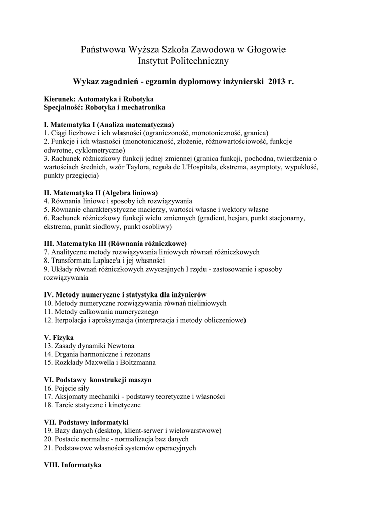 Państwowa Wyższa Szkoła Zawodowa w Głogowie Instytut Politechniczny Wykaz zagadnień - egzamin dyplomowy inżynierski 2013 r. Kierunek: Automatyka i Robotyka Specjalność: Robotyka i mechatronika I. Matematyka I (Analiza matematyczna) 1. Ciągi liczbowe i ich własności (ograniczoność, monotoniczność, granica) 2. Funkcje i ich własności (monotoniczność, złożenie, różnowartościowość, funkcje odwrotne, cyklometryczne) 3. Rachunek różniczkowy funkcji jednej zmiennej (granica funkcji, pochodna, twierdzenia o wartościach średnich, wzór Taylora, reguła de L'Hospitala, ekstrema, asymptoty, wypukłość, punkty przegięcia) II. Matematyka II (Algebra liniowa) 4. Równania liniowe i sposoby ich rozwiązywania 5. Równanie charakterystyczne macierzy, wartości własne i wektory własne 6. Rachunek różniczkowy funkcji wielu zmiennych (gradient, hesjan, punkt stacjonarny, ekstrema, punkt siodłowy, punkt osobliwy) III. Matematyka III (Równania różniczkowe) 7. Analityczne metody rozwiązywania liniowych równań różniczkowych 8. Transformata Laplace'a i jej własności 9. Układy równań różniczkowych zwyczajnych I rzędu - zastosowanie i sposoby rozwiązywania IV. Metody numeryczne i statystyka dla inżynierów 10. Metody numeryczne rozwiązywania równań nieliniowych 11. Metody całkowania numerycznego 12. Iterpolacja i aproksymacja (interpretacja i metody obliczeniowe) V. Fizyka 13. Zasady dynamiki Newtona 14. Drgania harmoniczne i rezonans 15. Rozkłady Maxwella i Boltzmanna VI. Podstawy konstrukcji maszyn 16. Pojęcie siły 17. Aksjomaty mechaniki - podstawy teoretyczne i własności 18. Tarcie statyczne i kinetyczne VII. Podstawy informatyki 19. Bazy danych (desktop, klient-serwer i wielowarstwowe) 20. Postacie normalne - normalizacja baz danych 21. Podstawowe własności systemów operacyjnych VIII. Informatyka 22. Programowanie obiektowe i strukturalne - własności i różnice, narzędzia programistyczne 23. Język JAVA - podstawowe własności 24. Enkapsulacja i hermetyzacja (metody składowe i konstruktory) IX. Mechanika i wytrzymałość materiałów 25. Podstawowe modele ciał w mechanice technicznej 26. Równowaga układów płaskich i przestrzennych – warunki równowagi i ich rozwiązywanie 27. Naprężenia dopuszczalne X. Grafika inżynierska 28. Sposoby zapisu konstrukcji - nośniki, normalizacja 29. Pojęcie rzutu - rodzaje rzutów 30. Metody przekształcania odwzorowania (obrót, kład, transformacja układu odniesienia) XI. Podstawy teorii sygnałów i systemów dynamicznych 31. Splot sygnałów w czasie ciągłym i dyskretnym: właściwości interpretacja graficzna i o+B8perowanie splotem 32. Właściwości systemów: liniowość, stacjonarność, przyczynowość, systemy z pamięcią 33. Transformata Fouriera i jej zastosowania XII. Elektronika i elektrotechnika 34. Pole elektrostatyczne i elektryczne, podstawowe pojęcia i definicje 35. Prawa Kirchhoffa i ich zastosowania 36. Twierdzenie Thevienina i jego zastosowania XIII. Elektronika i techniki mikroprocesorowe 37. Tranzystor jako element elektronicznych wzmacniający moc 38. Podstawowe układy z zastosowaniem wzmacniaczy operacyjnych 39. Rodzaje scalonych przetworników A/C i C/A XIV. Podstawy automatyki i regulacji automatycznej 40. Podstawowe wskaźniki jakościowe regulacji w dziedzinie czasu i częstotliwości 41. Porównanie metody algebraicznej i Zieglera Nicolsa doboru nastaw regulatora PID 42. Sterowalność i obserwowalność liniowych systemów dynamicznych XV. Dynamika układów automatyki i robotyki 43. Symetryczne i niesymetryczne drgania swobodne i wymuszone oraz metody ich obliczania 44. Wibroizolacja maszyn i urządzeń z wykorzystaniem modeli dyskretno-ciągłych 45. Stabilność układów dynamicznych XVI. Podstawy robotyki 46. Klasyfikacja manipulatorów ze względu na kinemtykę 47. Stopnie swobody i rodzaje przełożeń 48. Reprezentacja Denavita-Hartenberga Przedmioty specjalizacyjne i specjalnościowe I. Elektrotechnika i napędy maszyn 49. Silnik obcowzbudny, bocznikowy i szeregowy prądu stałego - budowa, zasada działania, rozruch, sterowanie prędkością kątową, hamowanie 50. Silnik asynchroniczny pierścieniowy i klatkowy - budowa, zasada działania, rozruch, sterowanie prędkością kątową, hamowanie 51. Prostowniki i falowniki o komutacji sieciowej II. Sensoryka 52. Sensory temperatury, przemieszczenia liniowego i kątowego, prędkości i przyspieszenia 53. Sensory zbliżeniowe, ciśnienia, przepływu i poziomu 54. Sensory siły i momentu siły III. Technika mikroprocesorowa 55. Budowa i oprogramowanie programowalnych struktur logicznych 56. Budowa mikroprocesora i mikrokontrolera 57. Podstawowe architektury procesorów, klasyfikacja współczesnych mikroprocesorów IV. Teoria sterowania 58. Liniowe jednowymiarowe układy regulacji opóźnieniem skupionym 59. Charakterystyki statyczne członów nieliniowych 60. Twierdzenie Lapunowa i jego zastosowanie w analizie stabilności układów V. Języki programowania robotów 61. Definicja i podział języków programowania 62. Wymagania stawiane językowi programowania robota 63. Modelowanie otoczenia, specyfikacja ruchu, struktura programu VI. Sterowniki przemysłowe 64. Budowa programowalnych sterowników logicznych 65. Metody programowania sterowników PLC 66. Zasady doboru konfiguracji sterowników PLC VII. Napędy manipulatorów i robotów 67. Pojęcie napędu dla manipulatora lub robota, elementy składowe, podział 68. Budowa i projektowanie napędów pneumatycznych dla manipulatorów i robotów 69. Układy przeniesienia napędu: przekładnie planetarne, falowe, cykloidalne, przekładnie z paskiem zębatym, przekładnie śrubowo-toczne VIII. Budowa i badania manipulatorów i robotów 70. Model systemowy robota przemysłowego 71. Napędy pneumatyczne, hydrauliczne i elektryczne: specyfika zastosowania, specjalizowane konstrukcje, pozycjonowanie zderzakowe i dymensyjne 72. Mechanizmy ramienia manipulat