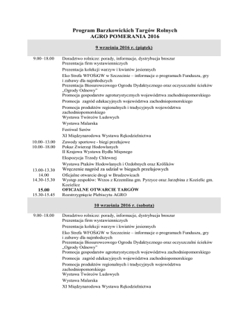 Program Barzkowickich Targów Rolnych AGRO POMERANIA 2016 9 wrze nia 2016 r. (pi tek) 9.00–18.00 10.00–13.00 10.00–18.00 13.00-13.30 14.00 14.30-15.30 15.00 15.30-15.45 Doradztwo rolnicze: porady, informacje, dystrybucja broszur Prezentacja firm wystawienniczych Prezentacja kolekcji warzyw i kwiatów jesiennych Eko Strefa WFO iGW w Szczecinie – informacje o programach Funduszu, gry i zabawy dla najm odszych Prezentacja Biosurowcowego Ogrodu Dydaktycznego oraz oczyszczalni cieków „Ogrody Odnowy” Promocja gospodarstw agroturystycznych województwa zachodniopomorskiego Promocja zagród edukacyjnych województwa zachodniopomorskiego Promocja produktów regionalnych i tradycyjnych województwa zachodniopomorskiego Wystawa Twórców Ludowych Wystawa Malarska Festiwal Serów XI Mi dzynarodowa Wystawa R kodzielnictwa Zawody sportowe - biegi prze ajowe Pokaz Zwierz t Hodowlanych II Krajowa Wystawa Byd a Mi snego Ekspozycja Trzody Chlewnej Wystawa Ptaków Hodowlanych i Ozdobnych oraz Królików Wr czenie nagród za udzia w biegach prze ajowych Oficjalne otwarcie drogi w Brudzewicach Wyst p zespo ów: Wrzos z Krzemlina gm. Pyrzyce oraz Jarz bina z Kozielic gm. Kozielice OFICJALNE OTWARCIE TARGÓW Rozstrzygni cie Plebiscytu AGRO 10 wrze nia 2016 r. (sobota) 9.00–18.00 Doradztwo rolnicze: porady, informacje, dystrybucja broszur Prezentacja firm wystawienniczych Prezentacja kolekcji warzyw i kwiatów jesiennych Eko Strefa WFO iGW w Szczecinie – informacje o programach Funduszu, gry i zabawy dla najm odszych Prezentacja Biosurowcowego Ogrodu Dydaktycznego oraz oczyszczalni cieków „Ogrody Odnowy” Promocja gospodarstw agroturystycznych województwa zachodniopomorskiego Promocja zagród edukacyjnych województwa zachodniopomorskiego Promocja produktów regionalnych i tradycyjnych województwa zachodniopomorskiego Wystawa Twórców Ludowych Wystawa Malarska XI Mi dzynarodowa Wystawa R kodzielnictwa 09.00-14.00 11.00-14.00 10.00-15.00 V Przegl d Kapel Ludowych Festiwal Serów Wycena byd a mi snego Seminarium serowarskie Pokaz Kulinarny LIVE COOKING SHOW „Zachodniopomorskie smakuje tradycj ”- Agencja Rynku Rolnego Polowe pokazy pracy maszyn rolniczych - innowacje Rozstrzygni cie konkursu „Bezpieczne Gospodarstwo Rolne” 12.00–13.00 13.00-13.30 14.00-15.00 15.00-16.30 10.00–18.00 Pokaz psów my liwskich Seminarium z zakresu hodowli byd a mi snego Pokaz Zwierz t Hodowlanych 16.00-18.00 II Krajowa Wystawa Byd a Mi snego Ekspozycja Trzody Chlewnej Wystawa Ptaków Hodowlanych i Ozdobnych oraz Królików XIII Zachodniopomorska Wystawa Koni Hodowlanych Pierwsze amatorskie zawody w zr czno ci powo enia 18.00 UROCZYSTE SPOTKANIE WYSTAWCÓW, AGROBIZNESMENÓW I HANDLOWCÓW. Podsumowanie konkursów: ,,Najlepszy wyrób na targach – maszyny, urz dzenia, technologie”, ,,Najlepszy wyrób na targach – artyku y spo ywcze”, ,,Najlepszy wyrób na targach – rodki produkcji” Odebranie przez Organizatora nagrody „Lider Targowy 2015 r.” 11 wrze nia 2016 r. (niedziela) 9.00–17.00 10.00–12.30 10.00–17.00 12.00–13.00 Doradztwo rolnicze: porady, informacje, dystrybucja broszur Prezentacja firm wystawienniczych Prezentacja kolekcji warzyw i kwiatów jesiennych Eko Strefa WFO iGW w Szczecinie – informacje o programach Funduszu, gry i zabawy dla najm odszych Prezentacja Biosurowcowego Ogrodu Dydaktycznego oraz oczyszczalni cieków „Ogrody Odnowy” Promocja gospodarstw agroturystycznych województwa zachodniopomorskiego Promocja zagród edukacyjnych województwa zachodniopomorskiego Promocja produktów regionalnych i tradycyjnych województwa zachodniopomorskiego Wystawa Twórców Ludowych Wystawa Malarska XI Mi dzynarodowa Wystawa R kodzielnictwa Festiwal Serów DO YNKI: Msza wi ta Dzi kczynna za zebrane plony; Ceremonia Do ynkowy, Prezentacja wie ców do ynkowych, Konkurs na „Naj adniejszy wieniec do ynkowy”. Pokaz Zwierz t Hodowlanych II Krajowa Wystawa Byd a Mi snego Ekspozycja Trzody Chlewnej Wystawa Ptaków Hodowlanych i Ozdobnych oraz Królików XIII Zachodniopomorska Wystawa Koni Hodowlanych XXII Zawody Je dzieckie w Skokach Polowe pokazy pracy maszyn rolniczych - innowacje 12.00-13.00 13.00-14.00 13.00–13.30 13.30-14.00 15.00–15.30 13.00-15.00 15.00–16.45 16.00-16.15 17.00 Konkurs M odego Hodowcy Akademia mleka – warsztaty serowarskie Prezentacja championów i wicechampionów wystaw byd a mi snego" Wr czenie nagród hodowcom Rozstrzygni cie konkursy fotograficznego dla dzieci hodowców byd a mi snego– wr czenie nagród Wr czenie nagród hodowcom nagrodzonym w Wystawie Ptaków Hodowlanych i Ozdobnych oraz Królików Rozstrzygni cie konkursów: Agro-Eko-Turystyczne „Zielone Lato”, „Przegl d Kapel Ludowych”, „Agroliga 2016”, ,,Naj adniejszy wieniec do ynkowy,”So tys Roku 2016” Wyst p laureatów konkursu „Przegl d Kapel Ludowych” Rozstrzygni cie „Konkursu biletów parkingowych”. ZAKO CZENIE TARGÓW * organizator zastrzega sobie prawo do zmian w programie