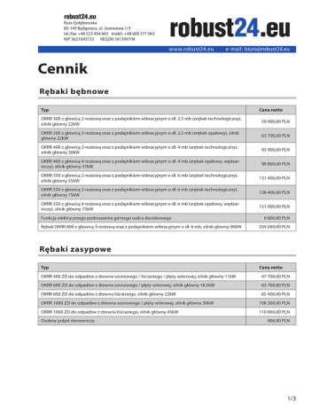 Ruta Gołębiewska 85-149 Bydgoszcz, ul. Jesionowa 1/3 tel./fax +48 523 494 665 mobil. +48 600 371 063 NIP 5621093733 REGON 341399794 www.robust24.eu e-mail: [email protected] Cennik Rębaki bębnowe Typ Cena netto OKRR 300 z głowicą 2-nożową oraz z podajnikiem wibracyjnym o dł. 2,5 mb (zrębek technologiczny), silnik główny 22kW 59 900,00 PLN OKRR 300 z głowicą 3-nożową oraz z podajnikiem wibracyjnym o dł. 2,5 mb (zrębek opałowy), silnik główny 22kW 63 700,00 PLN OKRR 400 z głowicą 2-nożową oraz z podajnikiem wibracyjnym o dł. 4 mb (zrębek technologiczny), silnik główny 30kW 93 900,00 PLN OKRR 400 z głowicą 4-nożową oraz z podajnikiem wibracyjnym o dł. 4 mb (zrębek opałowy, wędzarniczy), silnik główny 37kW 98 860,00 PLN OKRR 550 z głowicą 2-nożową oraz z podajnikiem wibracyjnym o dł. 6 mb (zrębek technologiczny), silnik główny 55kW 131 400,00 PLN OKRR 550 z głowicą 2-nożową oraz z podajnikiem wibracyjnym o dł. 6 mb (zrębek technologiczny), silnik główny 75kW 138 400,00 PLN OKRR 550 z głowicą 4-nożową oraz z podajnikiem wibracyjnym o dł. 6 mb (zrębek opałowy, wędzarniczy), silnik główny 75kW 151 000,00 PLN Funkcja elektrycznego podnoszenia górnego walca dociskowego Rębak OKRR 800 z głowicą 3-nożową oraz z podajnikiem wibracyjnym o dł. 6 mb, silnik główny 90kW 9 800,00 PLN 334 000,00 PLN Rębaki zasypowe Typ Cena netto OKRR 400 ZD do odpadów z drewna sosnowego / liściastego / płyty wiórowej, silnik główny 11kW 47 700,00 PLN OKRR 600 ZD do odpadów z drewna sosnowego / płyty wiórowej, silnik główny 18,5kW 63 700,00 PLN OKRR 600 ZD do odpadów z drewna liściastego, silnik główny 22kW 65 400,00 PLN OKRR 1000 ZD do odpadów z drewna sosnowego / płyty wiórowej, silnik główny 30kW 108 300,00 PLN OKRR 1000 ZD do odpadów z drewna liściastego, silnik główny 45kW 110 900,00 PLN Osobny pulpit sterowniczy 900,00 PLN 1/3 Ruta Gołębiewska 85-149 Bydgoszcz, ul. Jesionowa 1/3 tel./fax +48 523 494 665 mobil. +48 600 371 063 NIP 5621093733 REGON 341399794 www.robust24.eu e-mail: [email protected] Rozdrabniacze bijakowe Typ Cena netto OKRB 500 z silnikiem głównym 18,5kW 29 800,00 PLN OKRB 500 z silnikiem głównym 22kW 32 900,00 PLN OKRB 560 z silnikiem głównym 37kW 41 200,00 PLN OKRB 560 z silnikiem głównym 45kW 43 800,00 PLN Wielopiły Typ Cena netto Jednowałowa OKPW 60 z posuwem gąsienicowym o szerokości 188mm, silnik główny 18,5kW / 22kW 87 650,00 PLN Jednowałowa OKPW 60 z posuwem gąsienicowym o szerokości 340mm, silnik główny 18,5kW / 22kW 99 000,00 PLN Jednowałowa OKPW 120, silnik główny 30kW 107 000,00 PLN Jednowałowa OKPW 120, silnik główny 45kW 116 500,00 PLN Jednowałowa OKPW 155, silnik główny 45kW / 55kW 130 750,00 PLN Dwuwałowa OKPW 180 z posuwem gąsienicowym o szerokości 340mm 286 000,00 PLN Dwuwałowa OKPW 220 z posuwem gąsienicowym o szerokości 360mm 304 000,00 PLN Rolkowy stół podawczy / odbiorczy 1 450,00 PLN / 1 mb Pilarki do cięcia pianki tapicerskiej Typ Pilarka taśmowa OKPP 120 do pionowego cięcia bloków pianki tapicerskiej z ręcznym posuwem stołu poziomego Pilarka taśmowa OKPP 120 do pionowego cięcia bloków pianki tapicerskiej z pełnym sterowaniem automatycznym Cena netto 69 800,00 PLN 139 500,00 PLN Pilarka profilowa OKKS 140 do cięcia bloków pianki tapicerskiej według wzornika 50 400,00 PLN Pilarka skośna OKPS 100 ze stołem stałym 36 000,00 PLN Pilarka skośna OKPS 100 ze stołem ruchomym 44 000,00 PLN 2/3 Ruta Gołębiewska 85-149 Bydgoszcz, ul. Jesionowa 1/3 tel./fax +48 523 494 665 mobil. +48 600 371 063 NIP 5621093733 REGON 341399794 www.robust24.eu e-mail: [email protected] Szarparki do odpadów pianki tapicerskiej Typ Cena netto Szarparka OKSP 800, silnik główny 45 kW, głowica z nożami pełnymi 112 000,00 PLN Szarparka OKSP 800, silnik główny 55 kW, głowica bijakowa 138 000,00 PLN Szarparka Ø260, silnik główny 7,5 kW Silos do szarparki Ø260 (wyposażenie opcjonalne) 14 200,00 PLN 3 480,00 PLN Przecinarka tarczowa Typ Przecinarka tarczowa PMR 350 Cena netto 3 450,00 PLN Podane ceny nie zawierają podatku VAT. 3/3